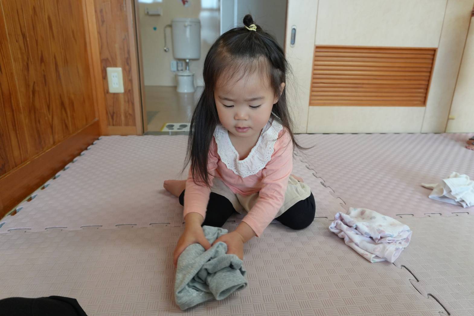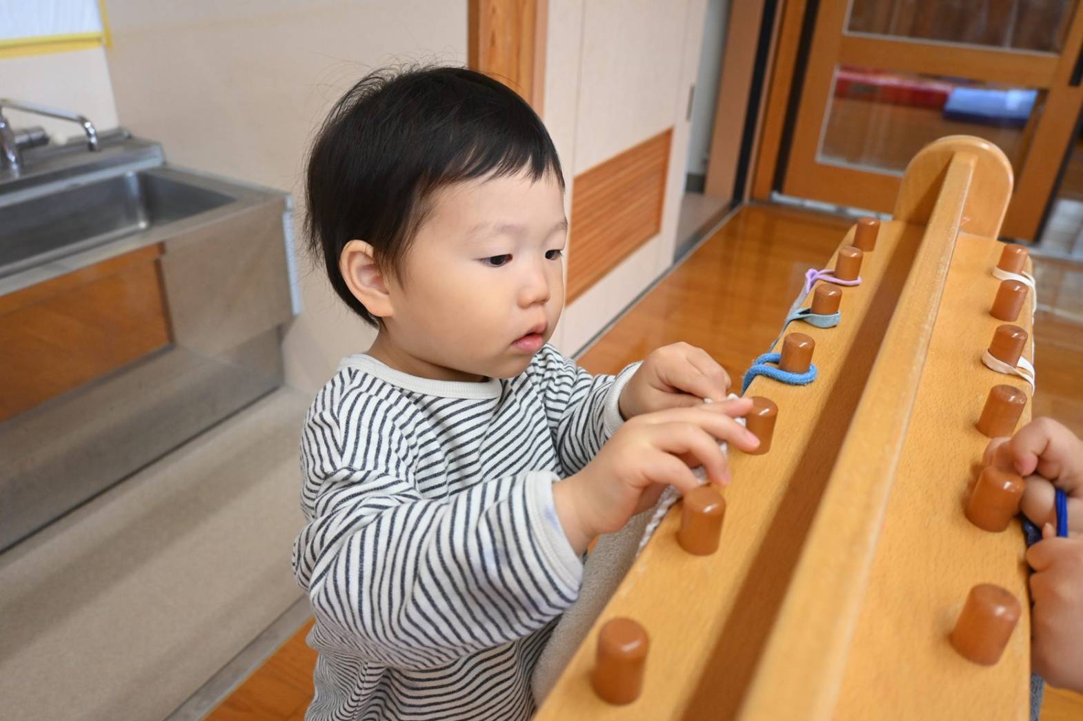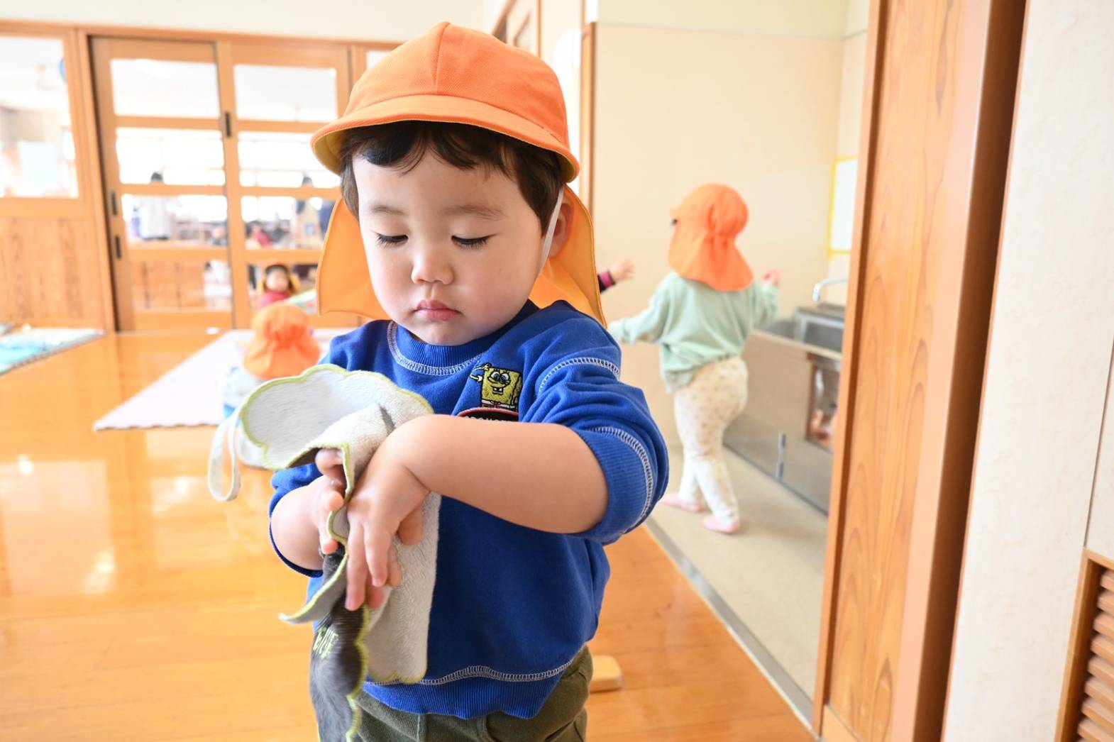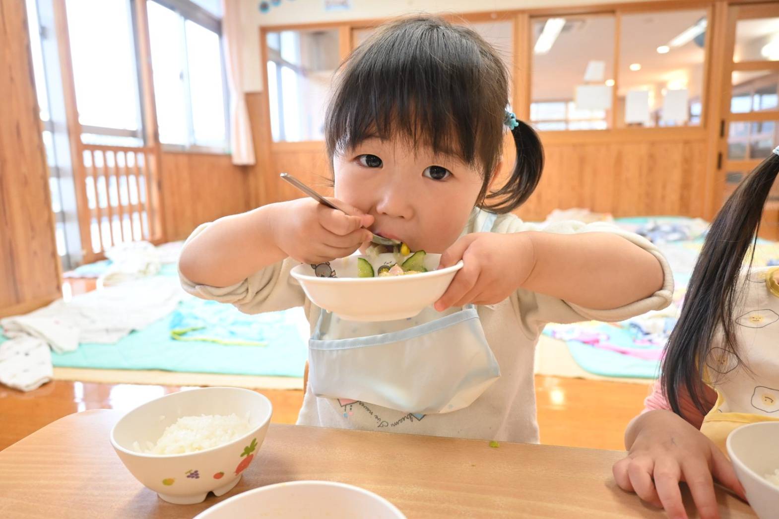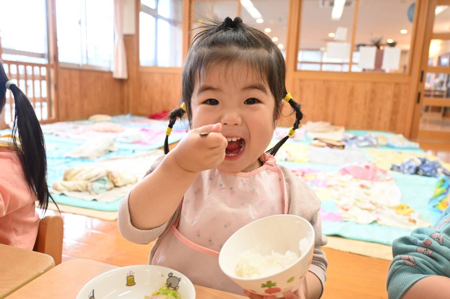 初めは戸惑う姿もありましたが、「こうするの?」、「ここでいい?」と保育者に聞きながら、着替えや給食など身の回りのことに意欲的に取り組む姿が見られています。