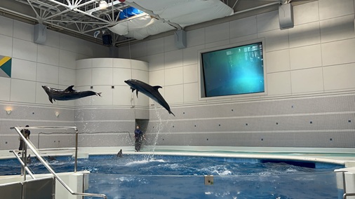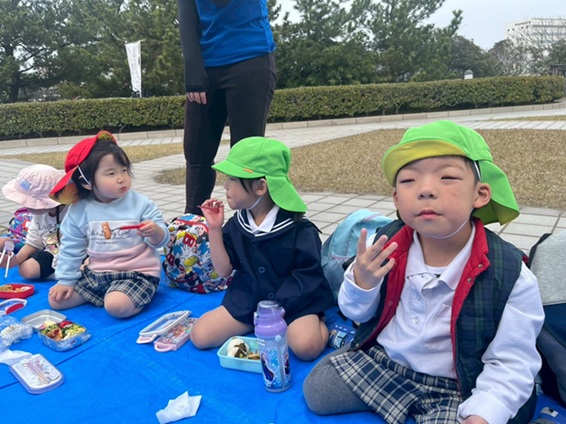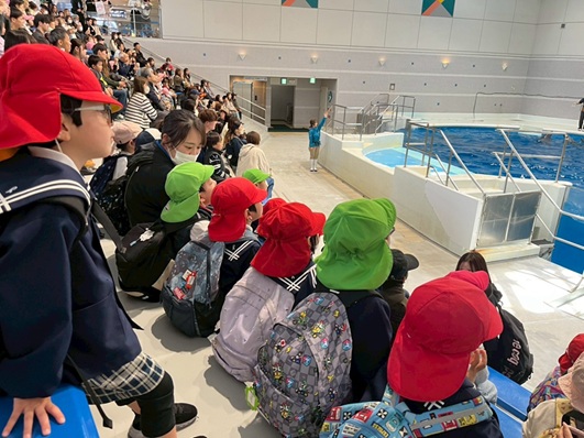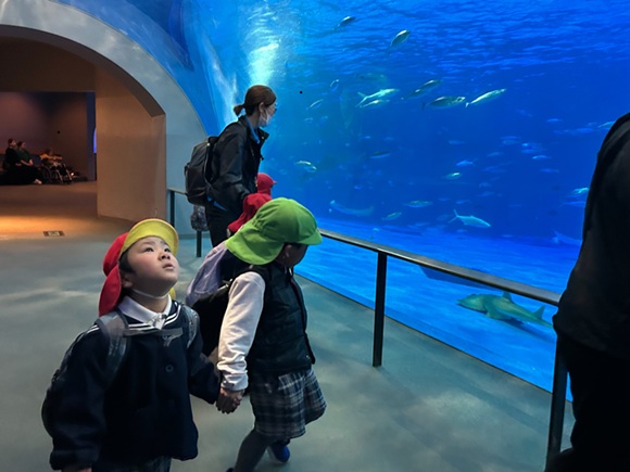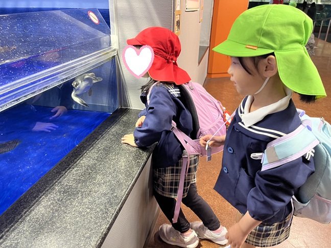 今回は、待ちに待った水族館に遠足に行きました。 大きなバスを見ると、「このバスで行くの~?」と笑顔いっぱいの子どもたち! バスの中では、「どんなお魚いるかな~?」、「イルカがいるよね!」などと水族館で見たいお魚のお話をする姿が見られました。 水族館に着くと、大きな水槽をゆったり泳ぐジンベイザメや初めてみるいろいろな魚を見て、キラキラした目で観察したり、イルカショーも、「わ~!」と声を出しながら楽しむことができました。 お昼は、お友だちとおいしいお弁当を食べて、思い出に残る遠足になりました☆