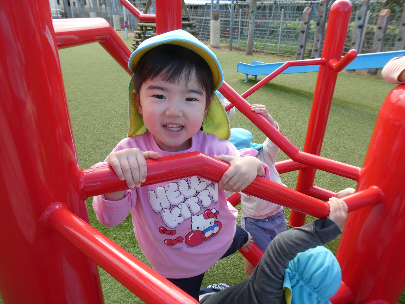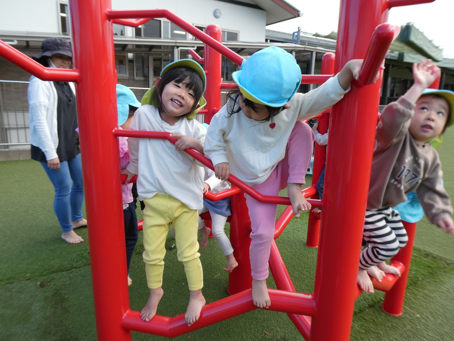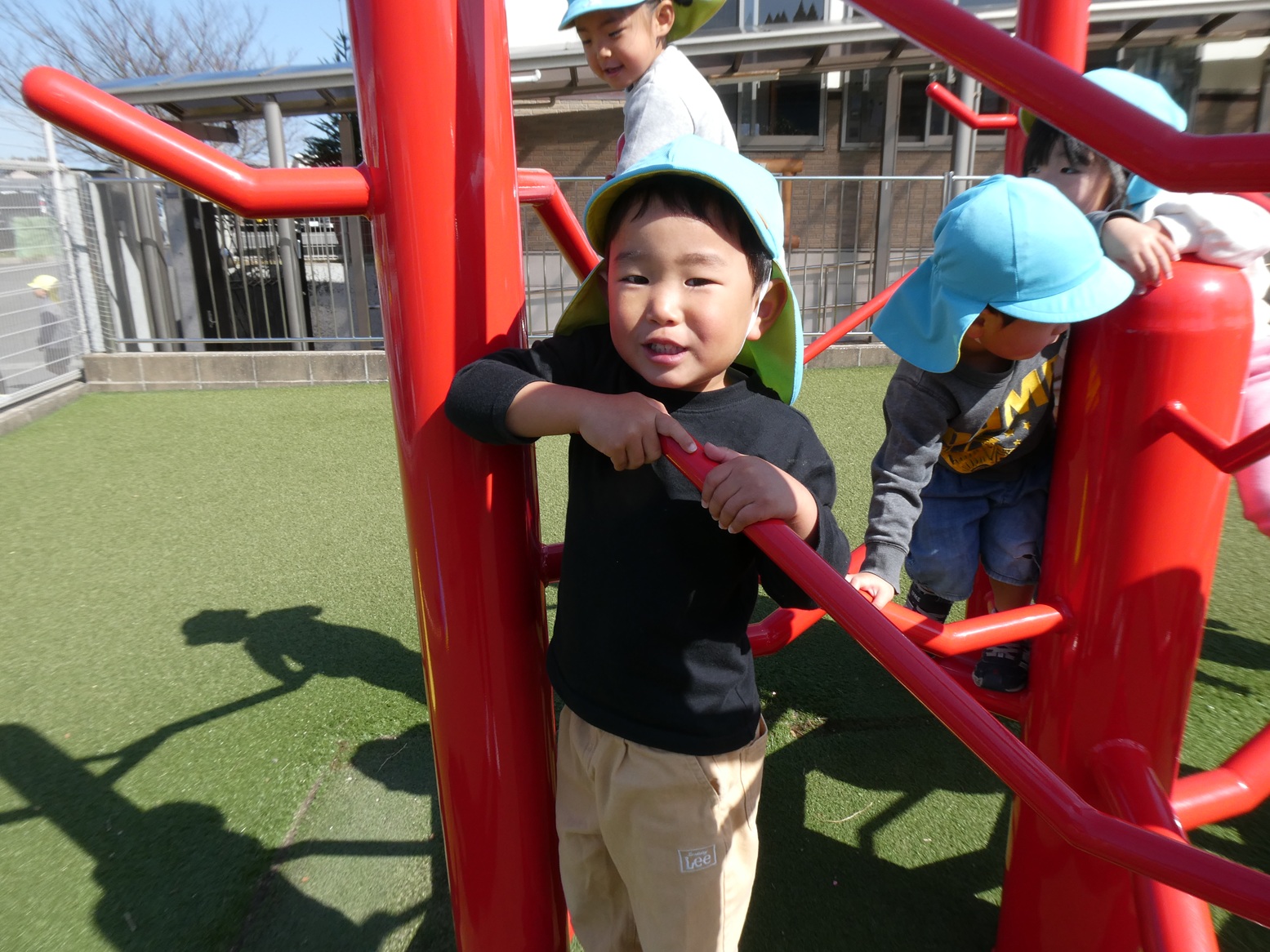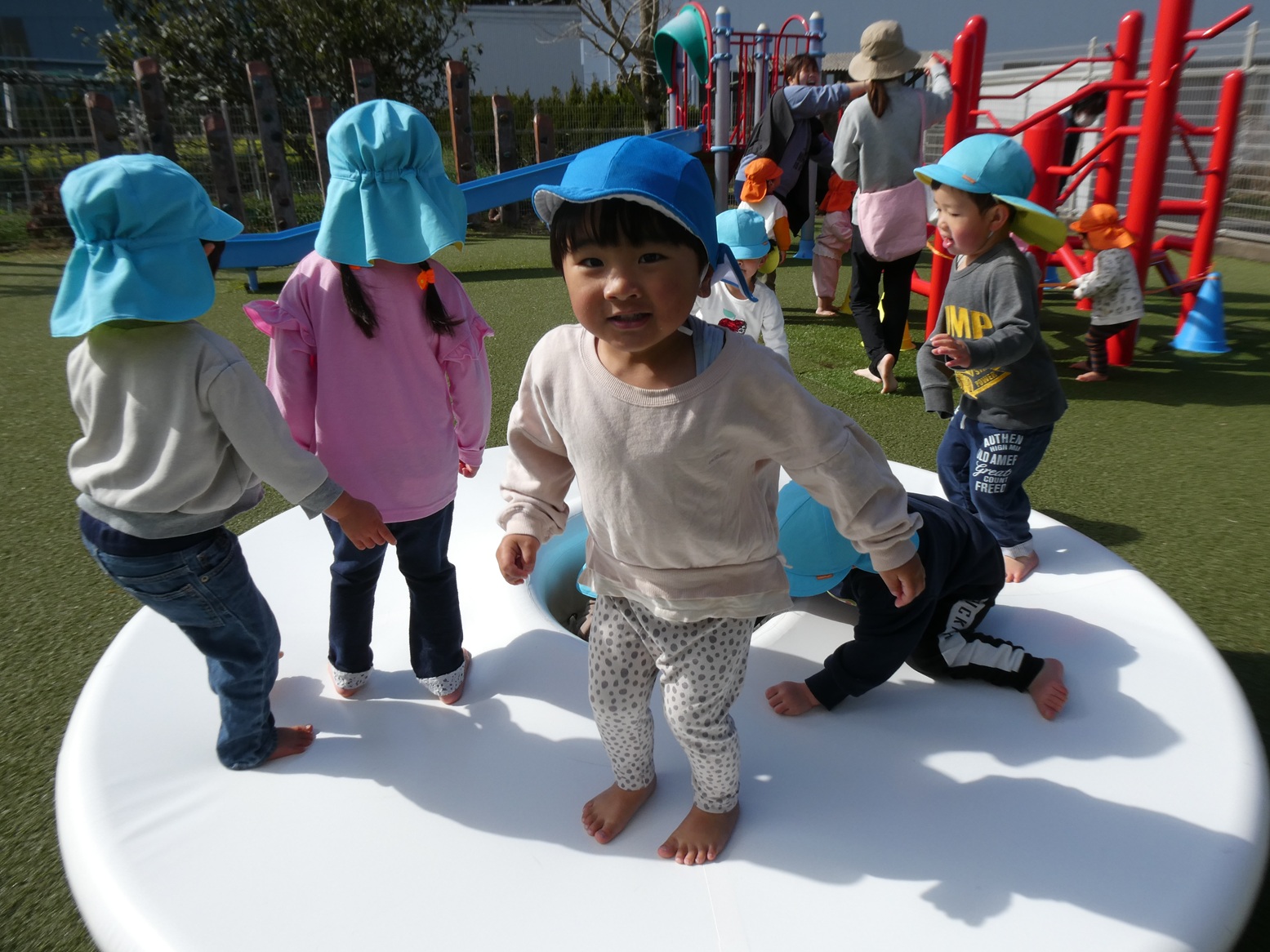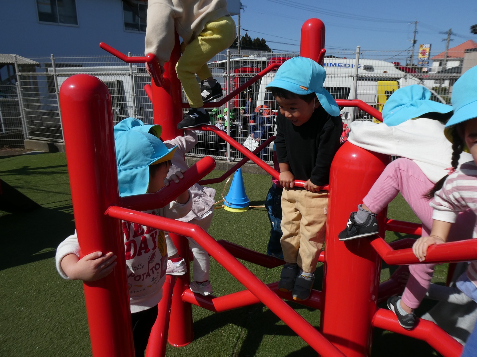 新しい遊具のジャングルジムとトランポリンがだいすきなぱんだぐみさん! ジャングルジムでは、上まで登って「せんせいすごいでしょ~」、「みてみて!」と得意気な子や「おりれないよ~」と助けを求める子など・・・かわいい姿がいっぱい!! お友だち同士で刺激を受け、お互いに真似をしたり、教え合ったりする様子を見ながら成長を感じています☆ トランポリンでは、いーっぱいジャンプしてる子どもたちです♡ 晴れた日は、毎日お外で元気にいっぱい遊んでいます!!