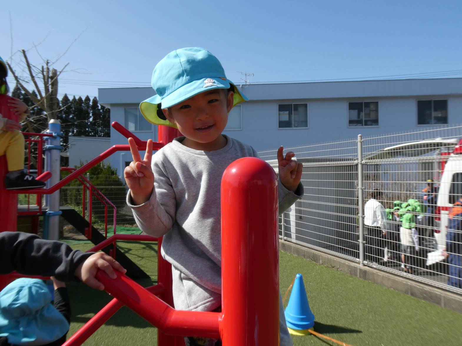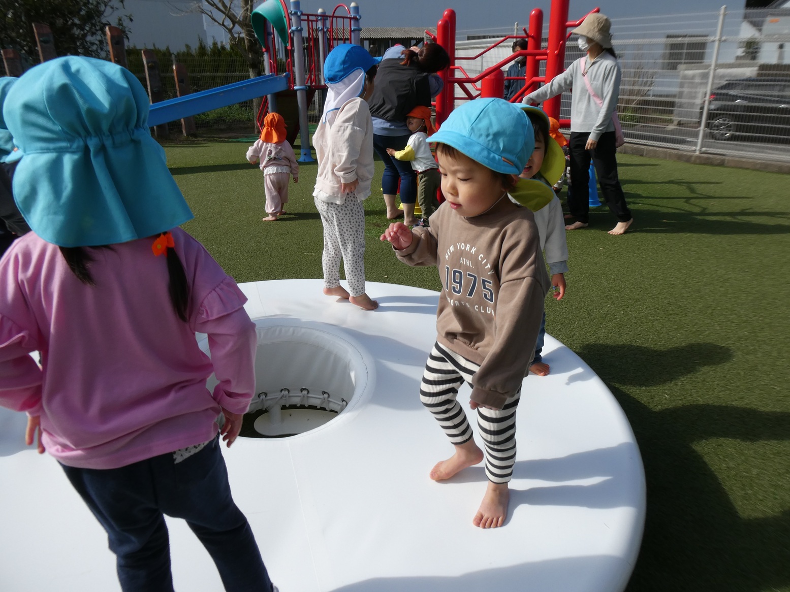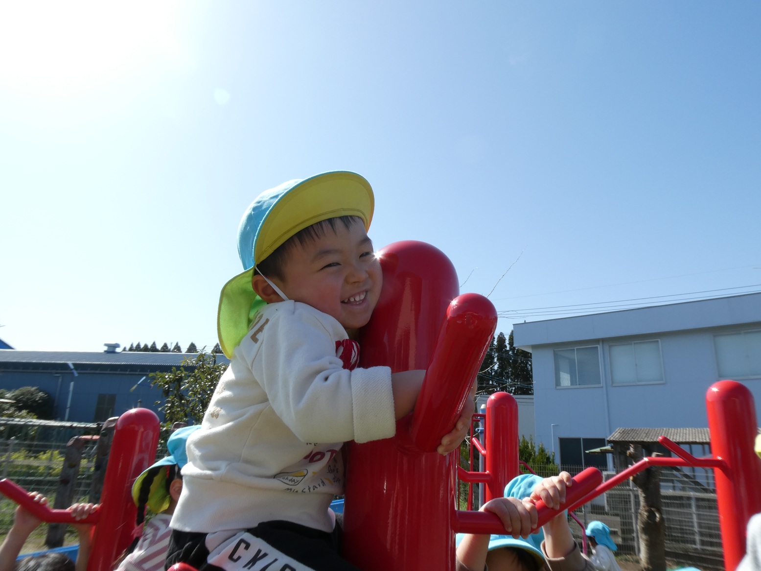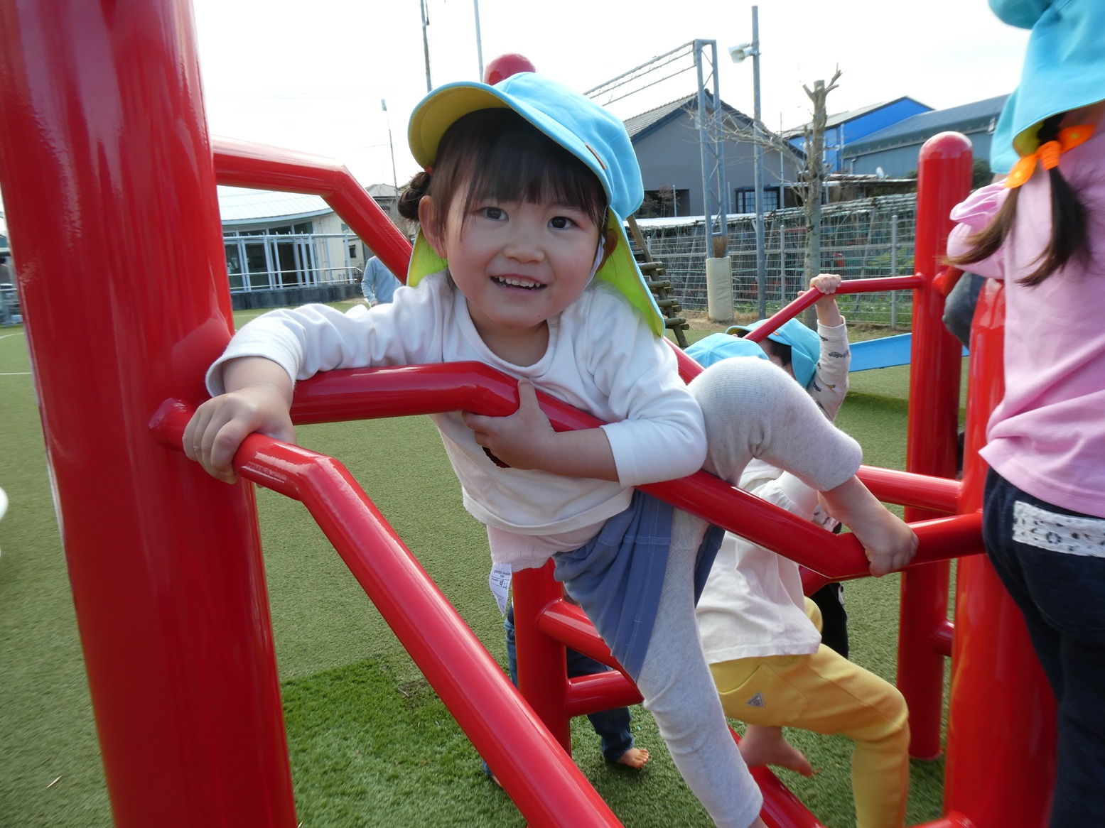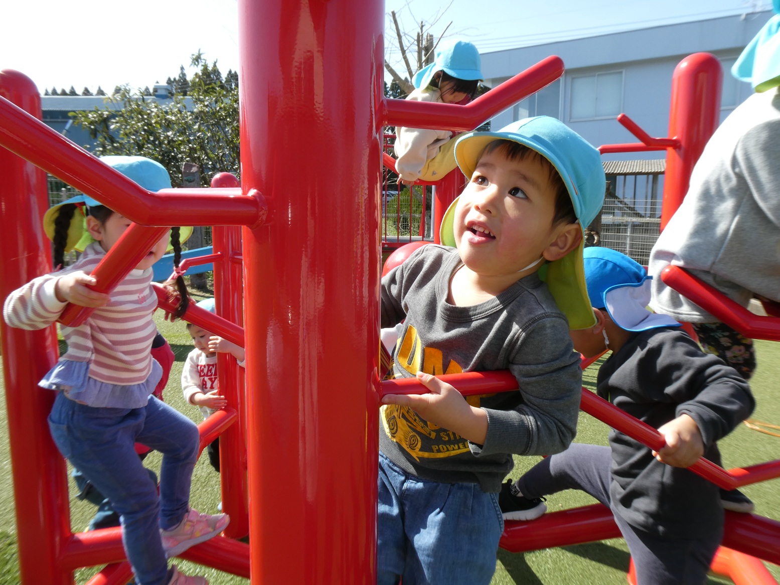 新しい遊具のジャングルジムとトランポリンがだいすきなぱんだぐみさん! ジャングルジムでは、上まで登って「せんせいすごいでしょ~」、「みてみて!」と得意気な子や「おりれないよ~」と助けを求める子など・・・かわいい姿がいっぱい!! お友だち同士で刺激を受け、お互いに真似をしたり、教え合ったりする様子を見ながら成長を感じています☆ トランポリンでは、いーっぱいジャンプしてる子どもたちです♡ 晴れた日は、毎日お外で元気にいっぱい遊んでいます!!