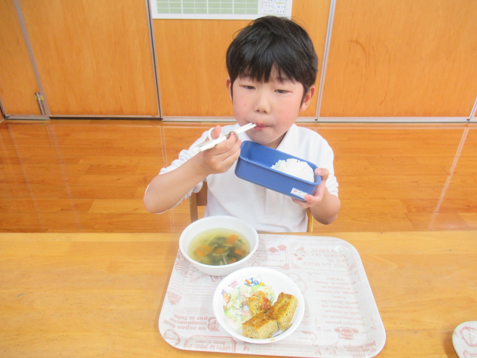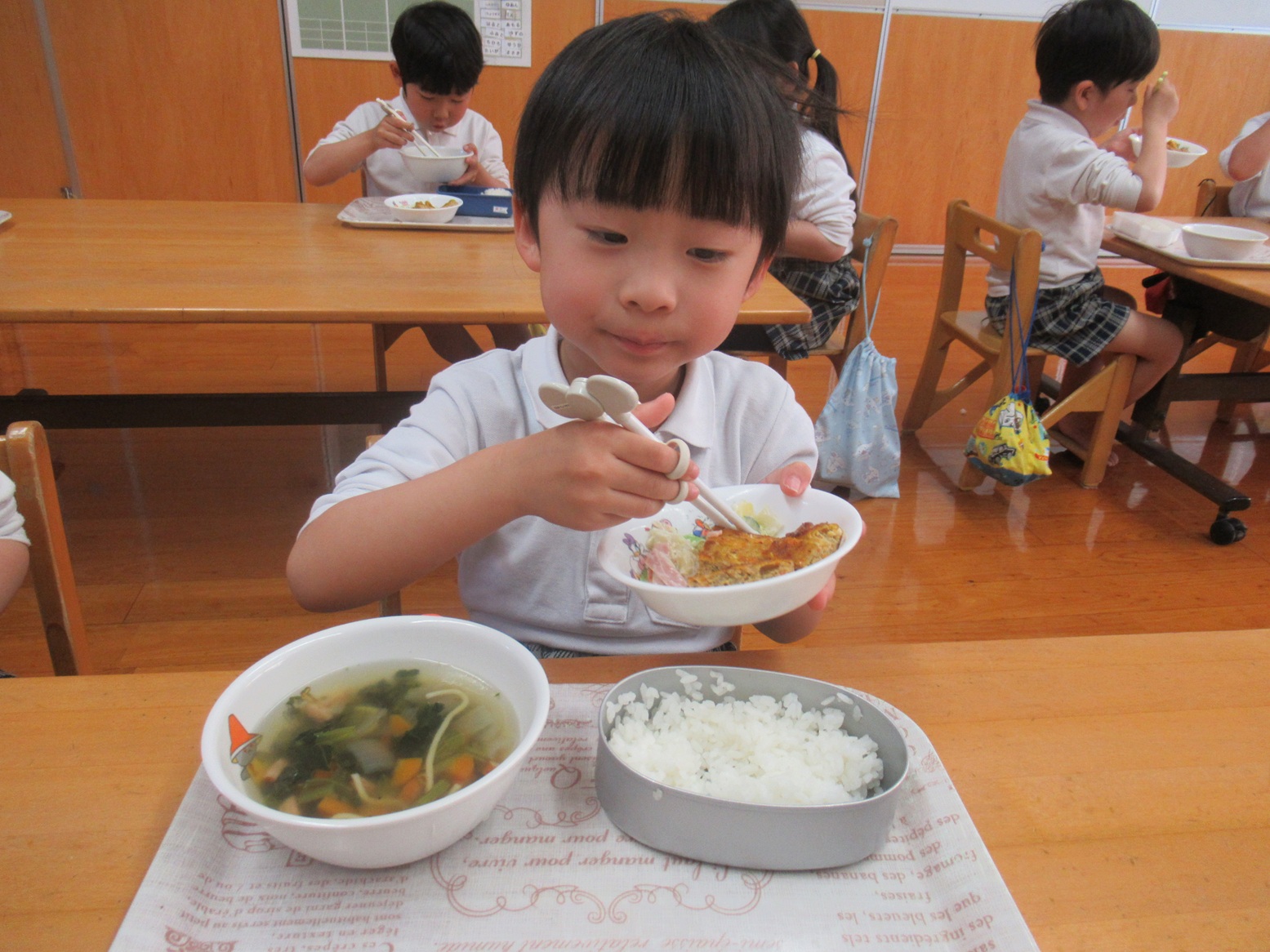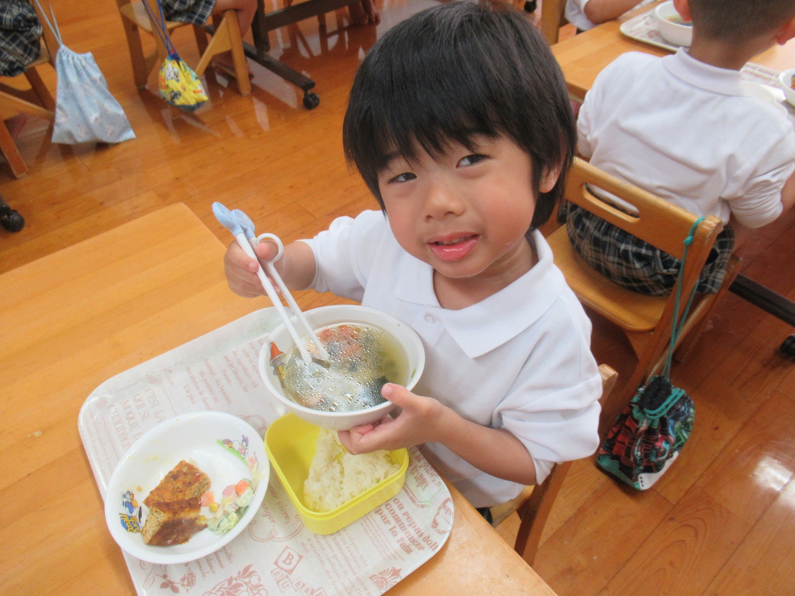 給食でも「かっこいい姿勢で食べられるよ!」「もう、うさぎ組さんだもんね!」と、張り切って食べる子どもたち。