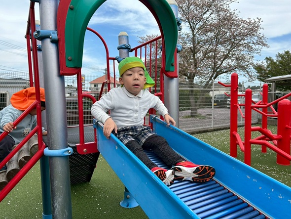 走った後は、滑り台で遊び、一緒にお外で遊んでいたいぬグループさんへ、「先にしていいよ。」と譲ってあげる、お兄ちゃんな一面が見られました✨