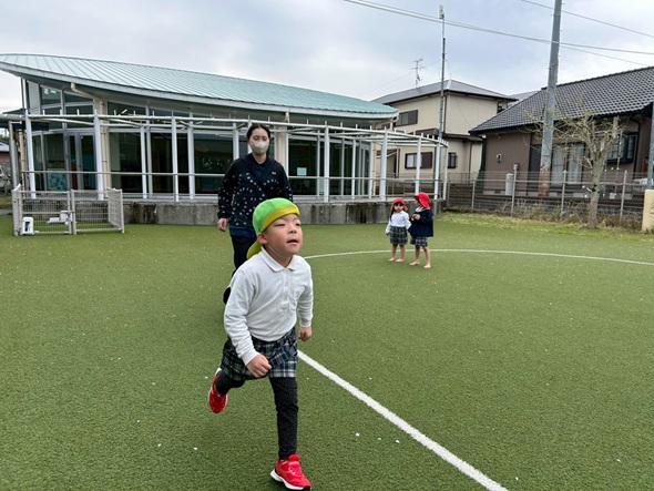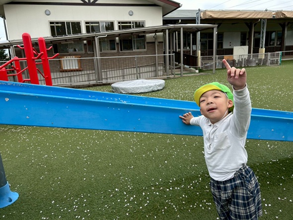 風が吹き、桜の花びらが舞うと、「先生見て!お花綺麗だね!」と、指をさしながら春の景色も楽しみ、時間いっぱい身体を動かすことができていましたよ♪