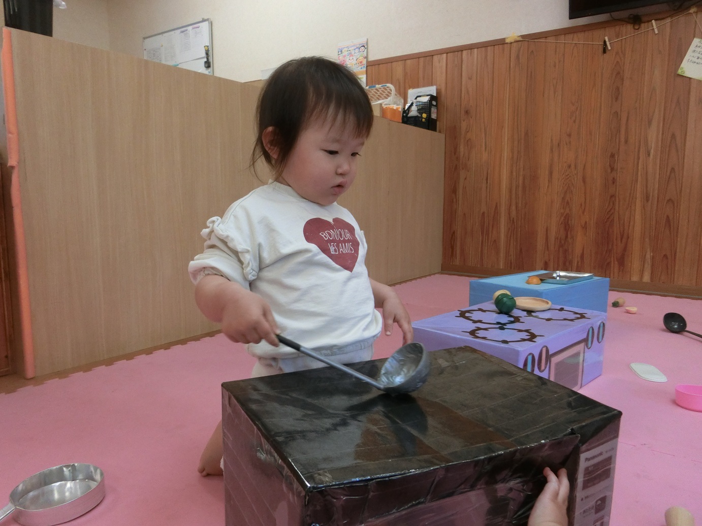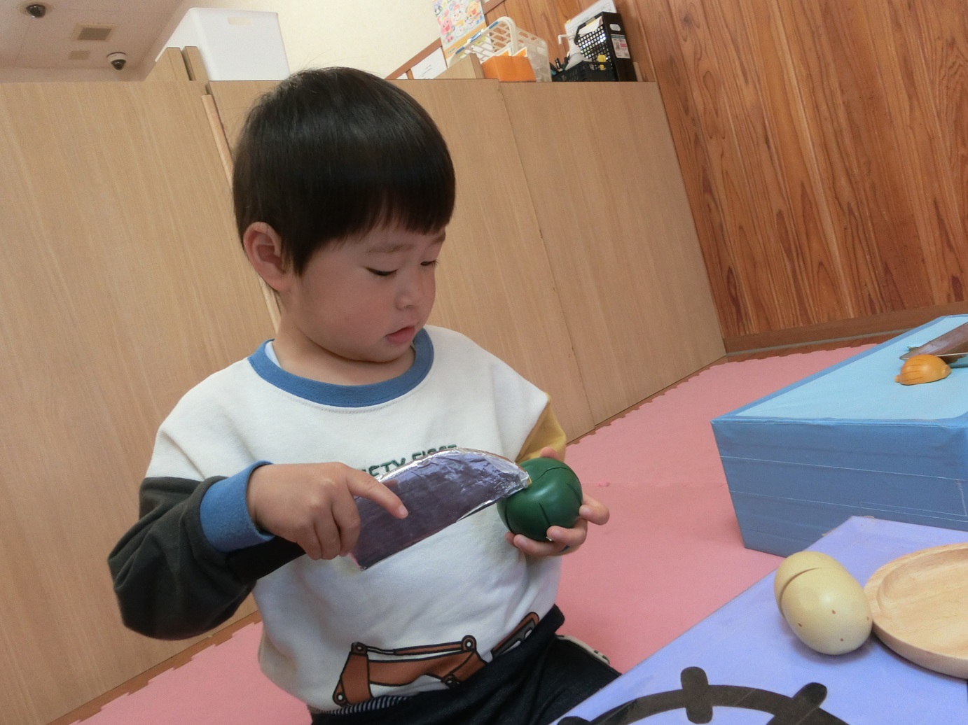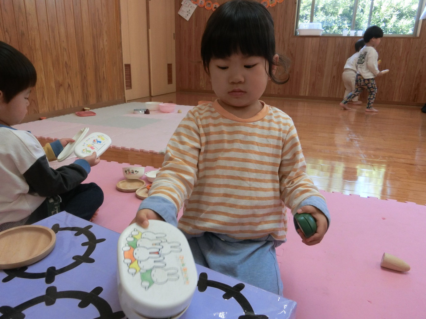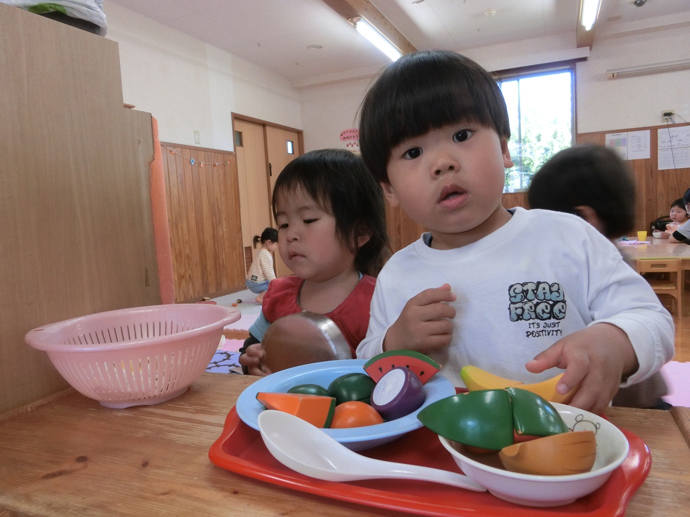 ぱんだ組になり新しい友だちが増え12名でスタートしました! 新年度が始まって、色んな遊びを楽しんでいるぱんだ組さんです。 室内遊びでは、ままごと遊びが好きな子どもたち。 ままごとの玩具を出すと大喜びです。 好きな食べ物を見つけてくると「先生バナナ~♡」と教えてくれたり、お父さんお母さんの真似をして「ご飯できたよ~!」と持ってきたりままごと遊びが上手なぱんだ組さんです。 1年間でたくさんの思い出を作っていけたらと思いますのでよろしくお願いします!