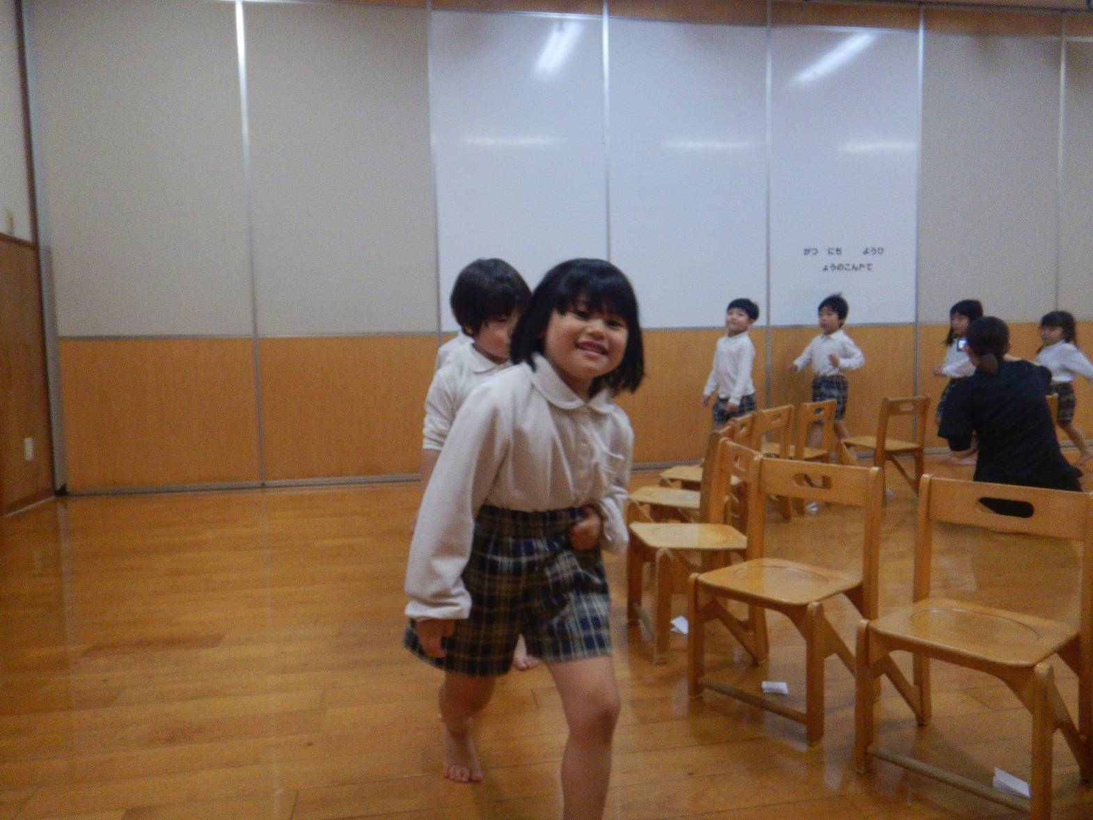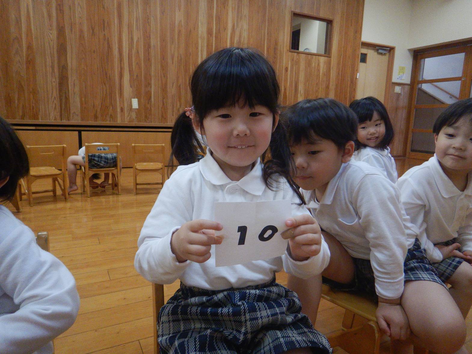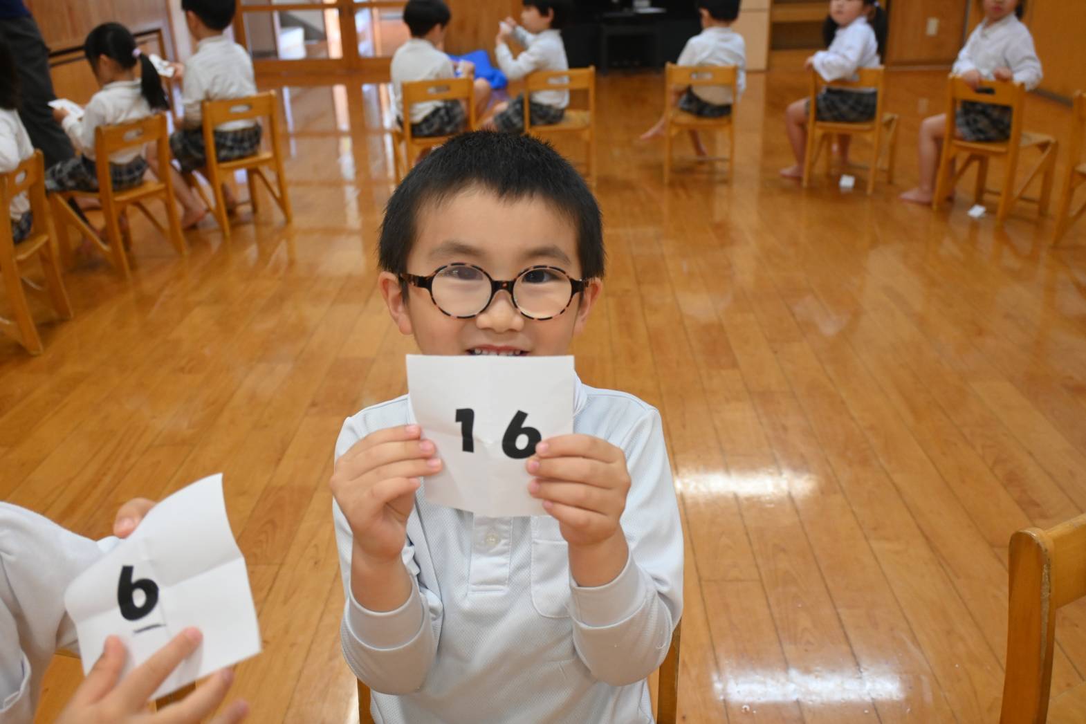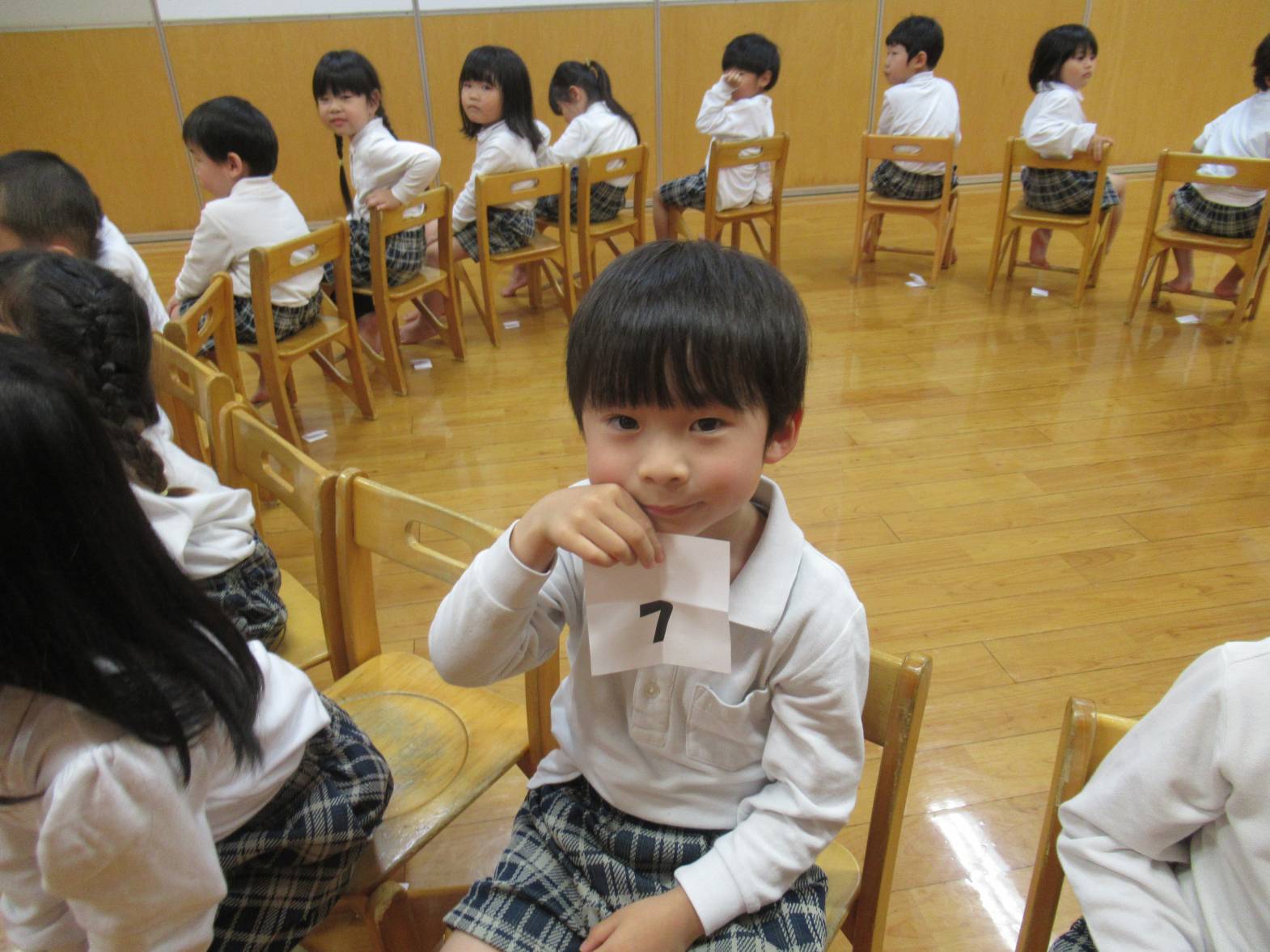 今日は親子レクリエーションの席のくじ引きを行いました。 音楽に合わせて椅子の周りをくるくる回ります。 音楽が止まると空いている椅子に座って「何番かな?」とわくわくした表情の子どもたち。 くじを開くと「8番だ!」「16番だった。」と嬉しそうに教えてくれる姿が見られました。 「親子レクリエーション楽しみだね!」「ママとパパにカッコいいところをみせるぞ!」と親子レクリエーションに向けて気合いが入る子どもたちでした。