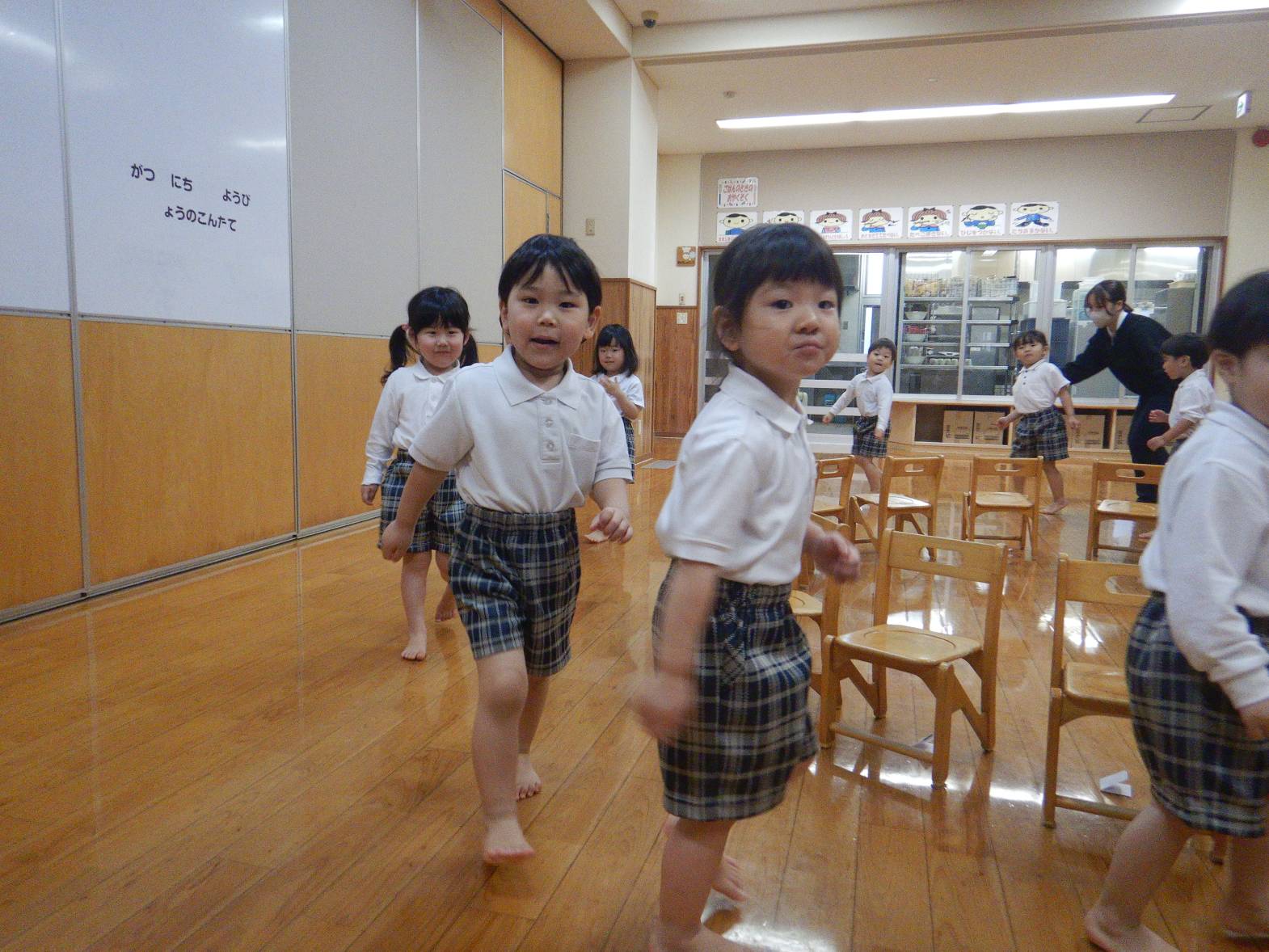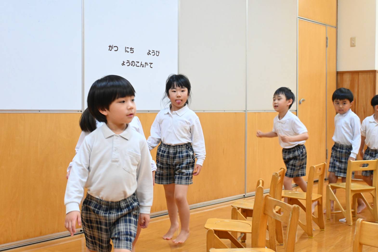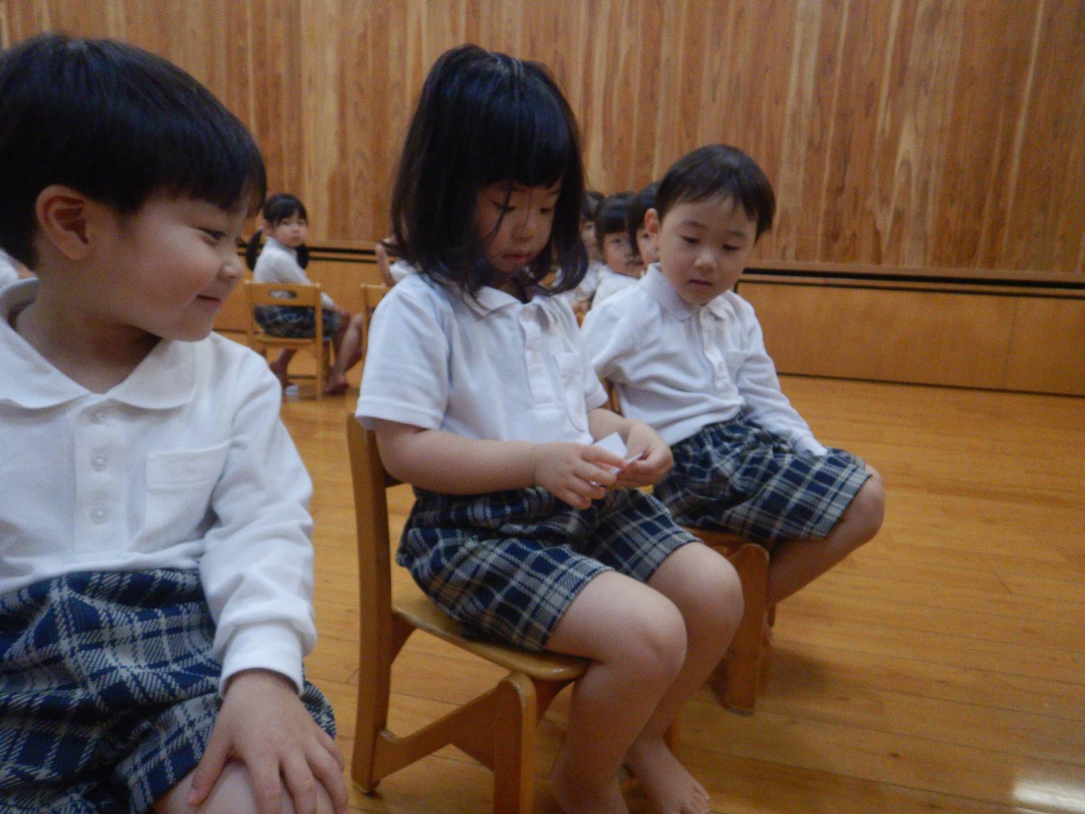 今日は親子レクリエーションの席のくじ引きを行いました。 音楽に合わせて椅子の周りをくるくる回ります。 音楽が止まると空いている椅子に座って「何番かな?」とわくわくした表情の子どもたち。 くじを開くと「8番だ!」「16番だった。」と嬉しそうに教えてくれる姿が見られました。 「親子レクリエーション楽しみだね!」「ママとパパにカッコいいところをみせるぞ!」と親子レクリエーションに向けて気合いが入る子どもたちでした。