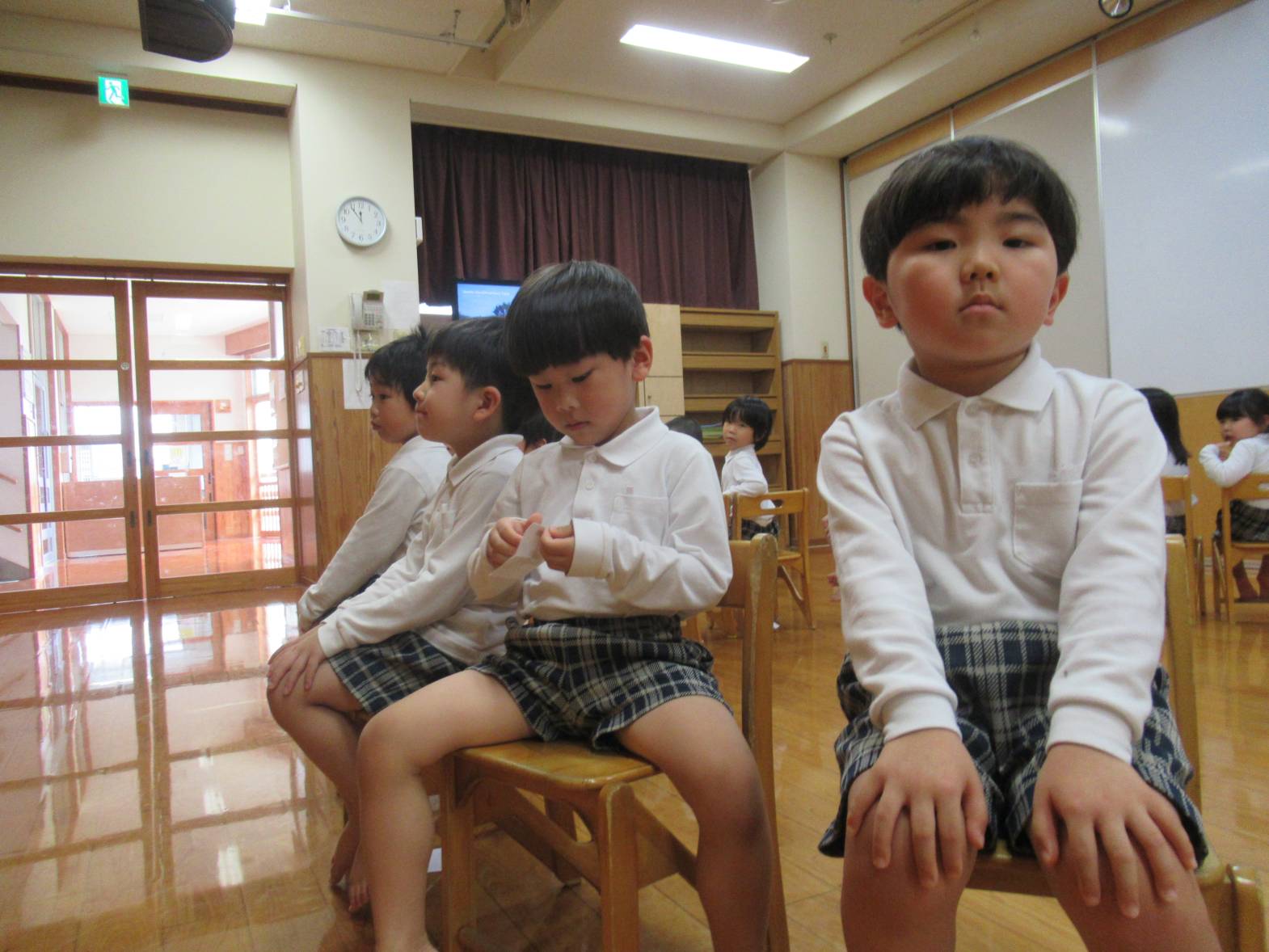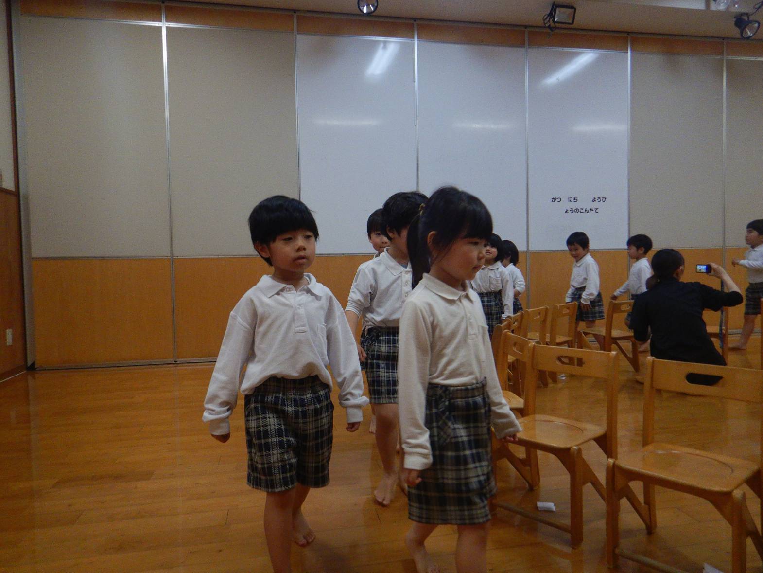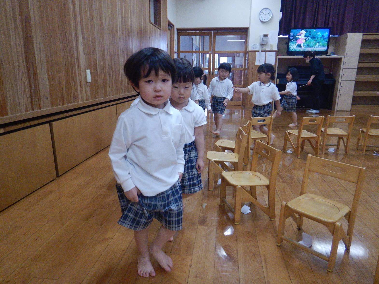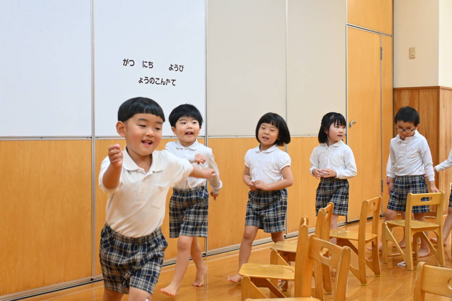 今日は親子レクリエーションの席のくじ引きを行いました。 音楽に合わせて椅子の周りをくるくる回ります。 音楽が止まると空いている椅子に座って「何番かな?」とわくわくした表情の子どもたち。 くじを開くと「8番だ!」「16番だった。」と嬉しそうに教えてくれる姿が見られました。 「親子レクリエーション楽しみだね!」「ママとパパにカッコいいところをみせるぞ!」と親子レクリエーションに向けて気合いが入る子どもたちでした。