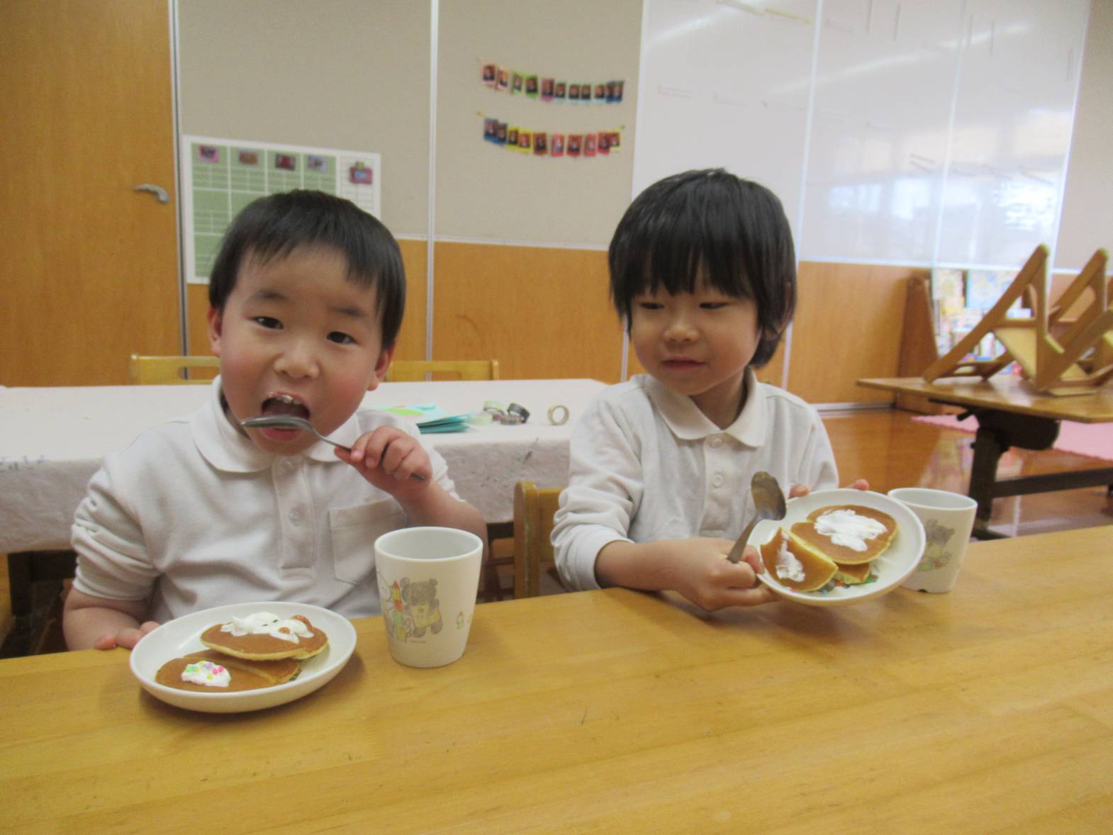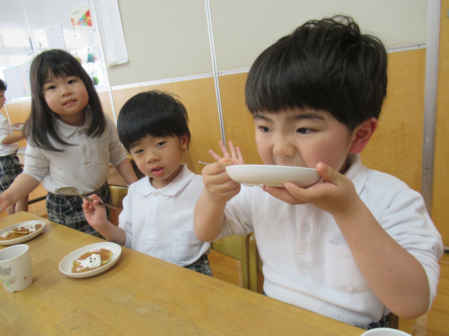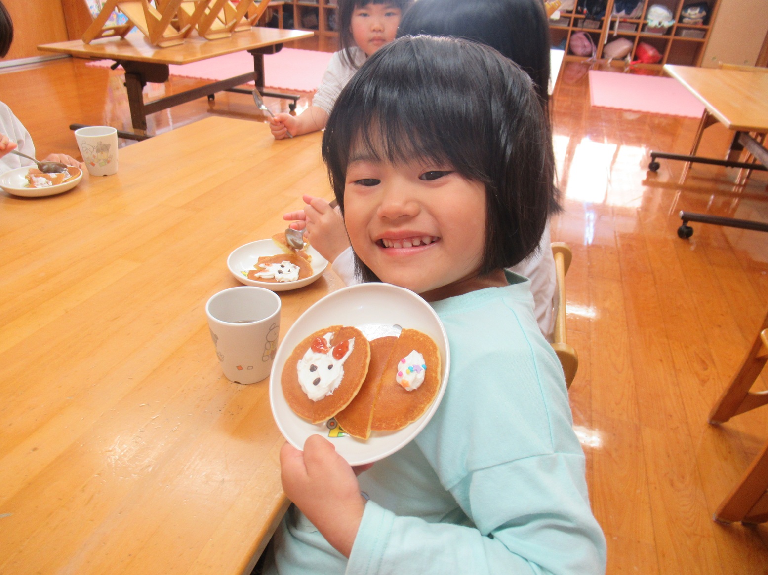 今週は、子どもたちの大好きなわくわくメニューの日。 給食ではちゅーっりぷの形をしたご飯が出ました。 「ちゅりーっぷだ!」「可愛いね。」と楽しそうに話をする姿が見られました。 おやつではイースターにちなんだうさぎさんのお顔が付いたパンケーキでした。 「うさぎさんだ!」「美味しいね。」とお口いっぱいに頬張るうさぎ組さんでした。