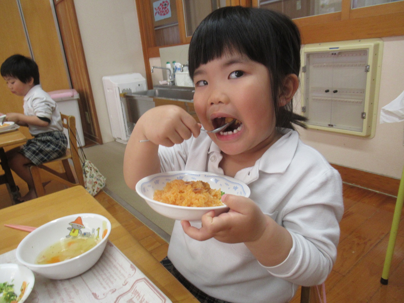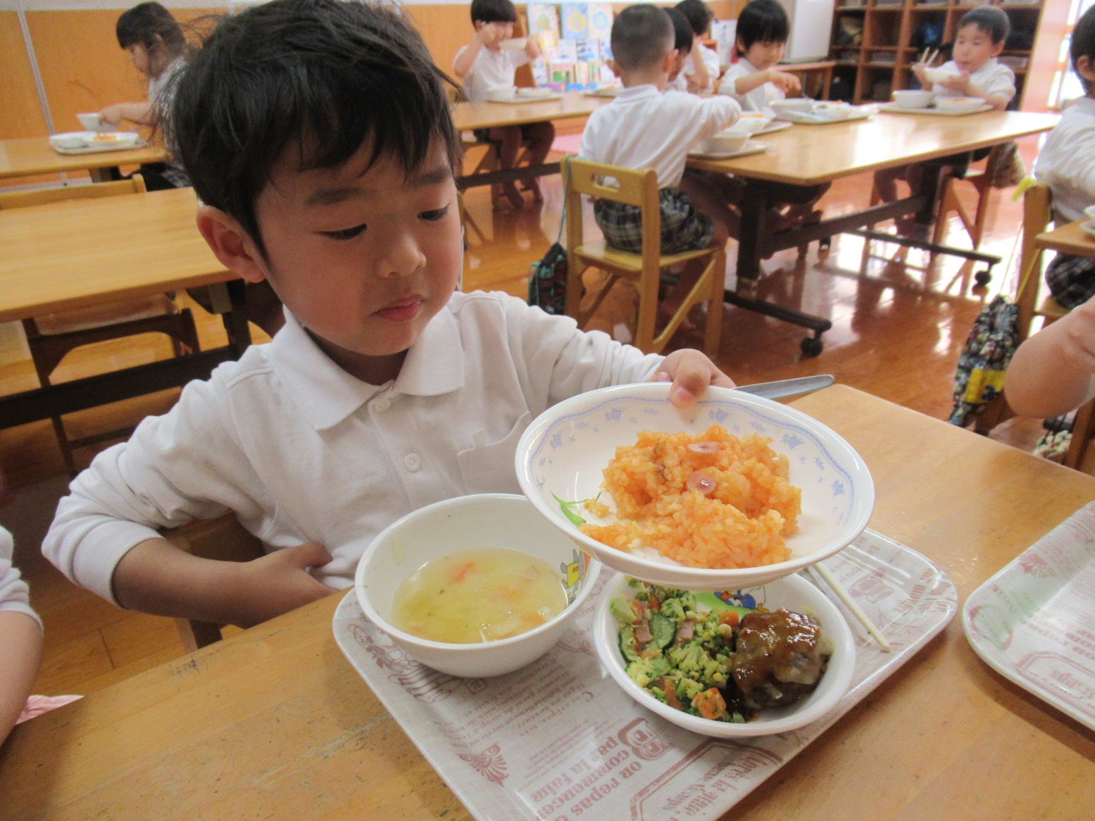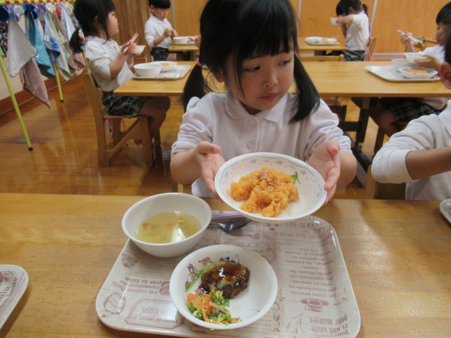 今週は、子どもたちの大好きなわくわくメニューの日。 給食ではちゅーっりぷの形をしたご飯が出ました。 「ちゅりーっぷだ!」「可愛いね。」と楽しそうに話をする姿が見られました。 おやつではイースターにちなんだうさぎさんのお顔が付いたパンケーキでした。 「うさぎさんだ!」「美味しいね。」とお口いっぱいに頬張るうさぎ組さんでした。