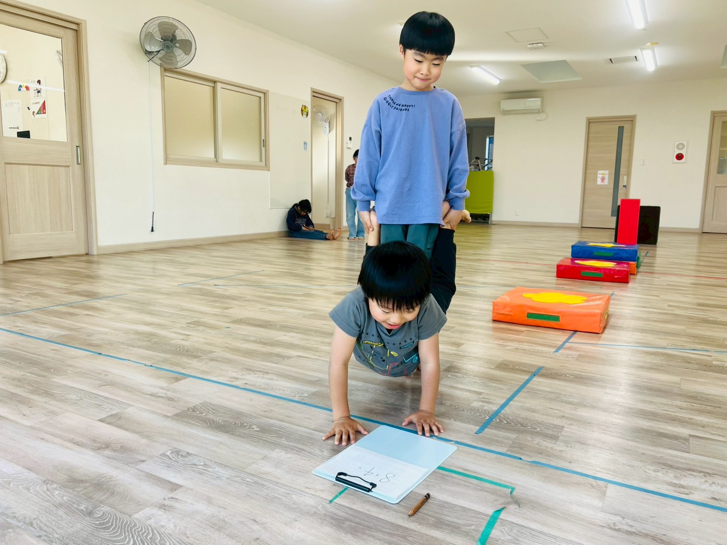 次に、マットやソフトブロックを使って子どもたちにコースを作ってもらい、作ったコースを手押し車をしながら進んでいます!