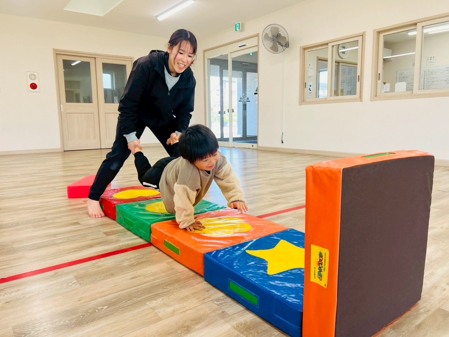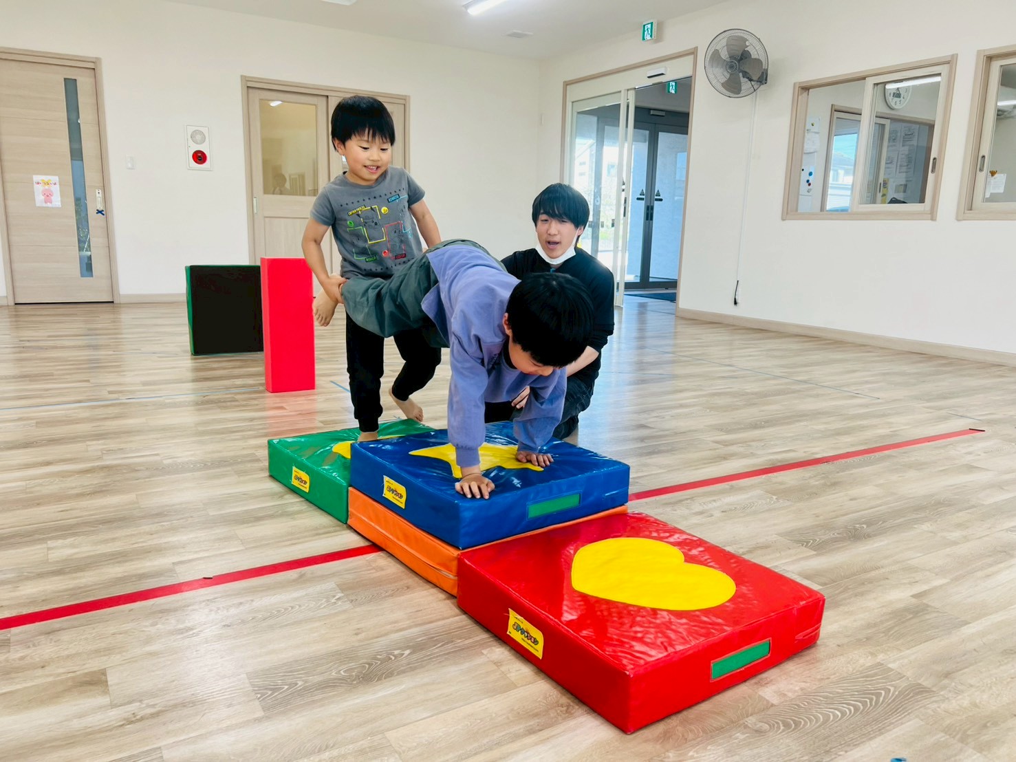 階段状に作られたJPマットを上ったり、大きく手を前に出してソフトブロックを避けたりと、腕だけでなく、腹筋にも力を入れながら取り組む子どもたち☆