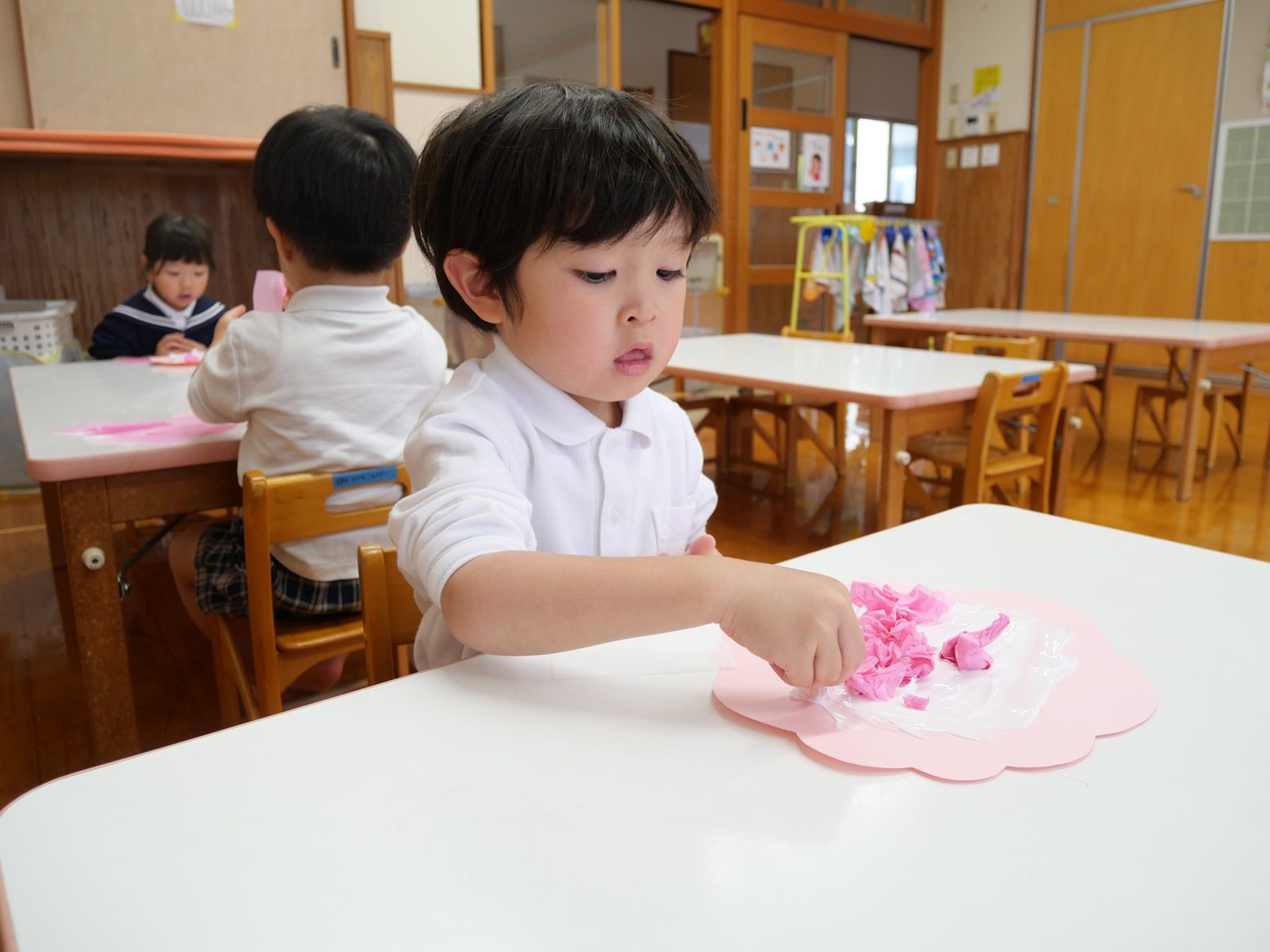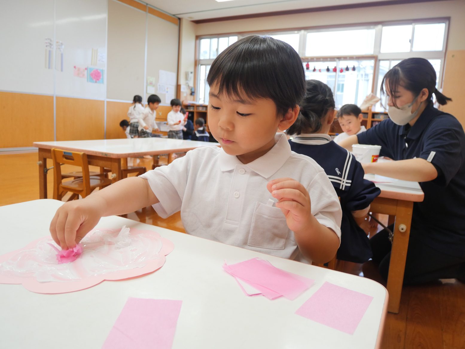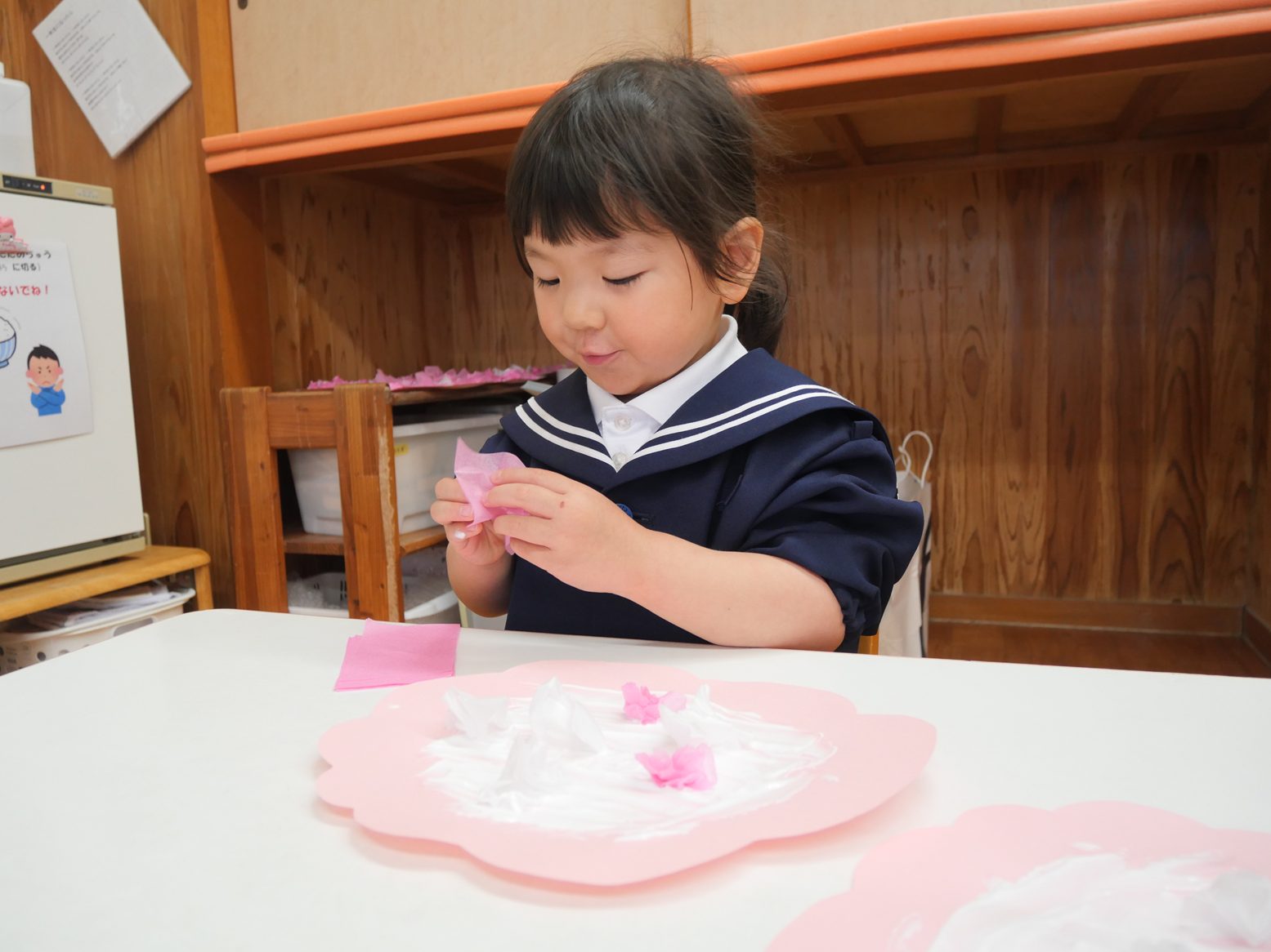 桜の花びらが園庭に舞っている様子を見て、「桜だね。」「すごい!」と嬉しそうな表情の子どもたち。 「たくさんあるね!」「あっ、ここにもあるよ。」と、嬉しそうに花びらを集めていく姿が見られます。 その後、みんなで桜の製作をしました。 「ここに花びらつけよう。」「くしゅ、くしゅ!」と言いながら、好きなところに花びらを咲かせていく姿が見られます。 完成すると「お花が咲いたよ!」「綺麗だね。」と、嬉しそうに話していたりす組さんです。