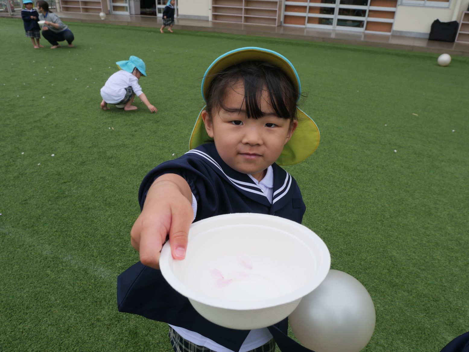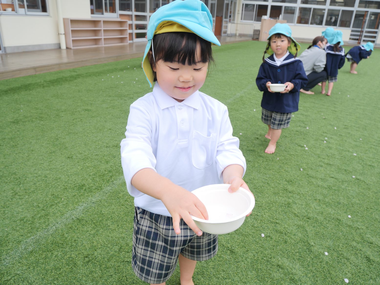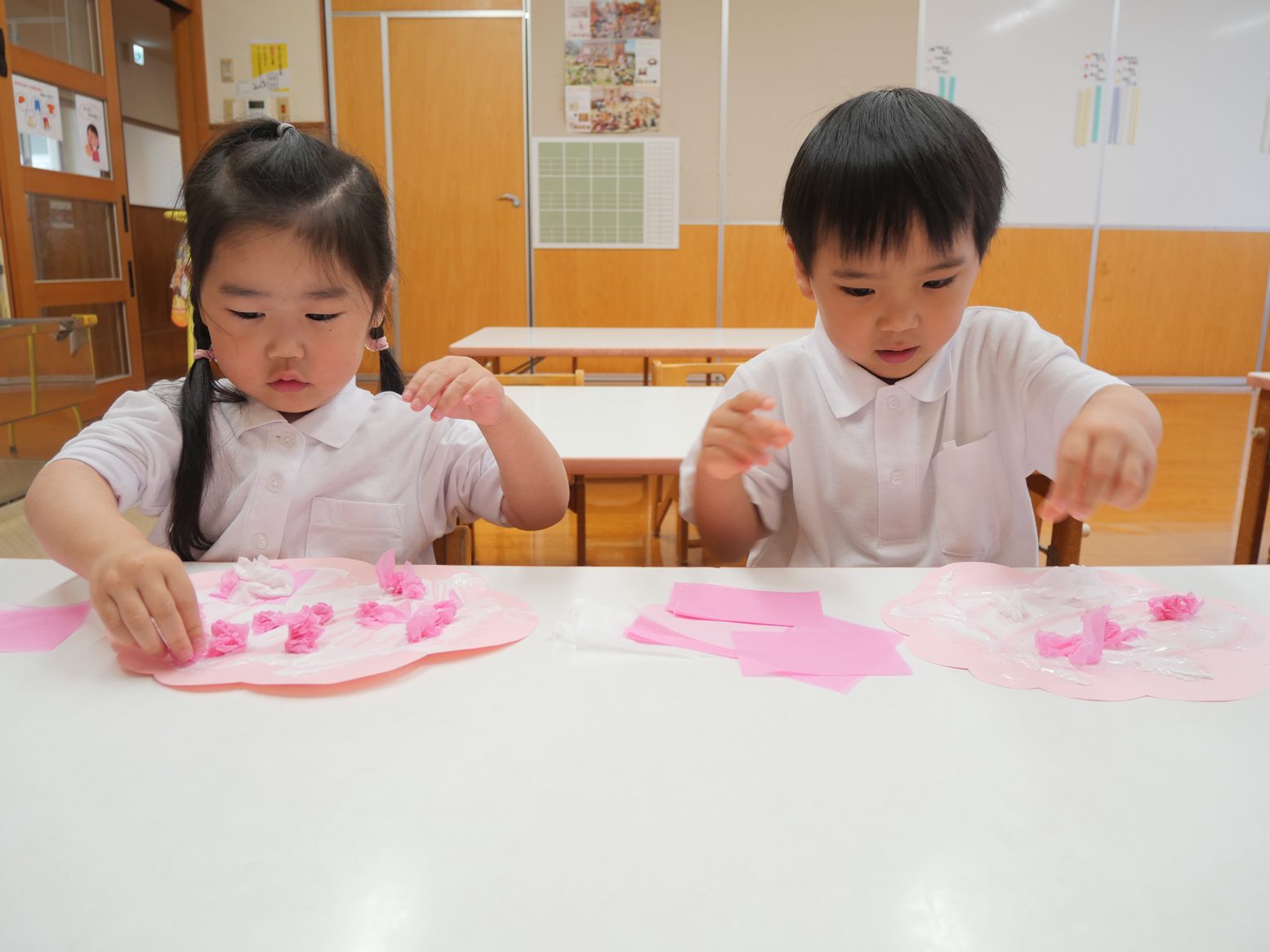 桜の花びらが園庭に舞っている様子を見て、「桜だね。」「すごい!」と嬉しそうな表情の子どもたち。 「たくさんあるね!」「あっ、ここにもあるよ。」と、嬉しそうに花びらを集めていく姿が見られます。 その後、みんなで桜の製作をしました。 「ここに花びらつけよう。」「くしゅ、くしゅ!」と言いながら、好きなところに花びらを咲かせていく姿が見られます。 完成すると「お花が咲いたよ!」「綺麗だね。」と、嬉しそうに話していたりす組さんです。