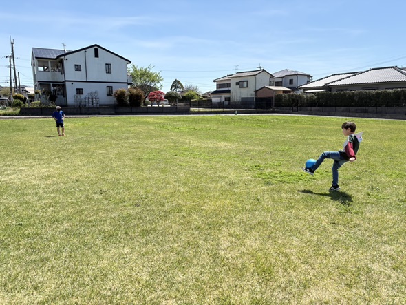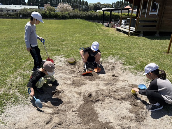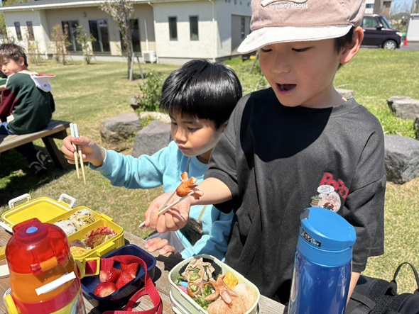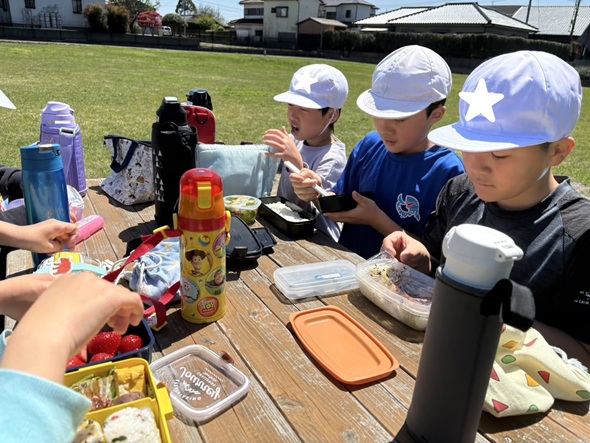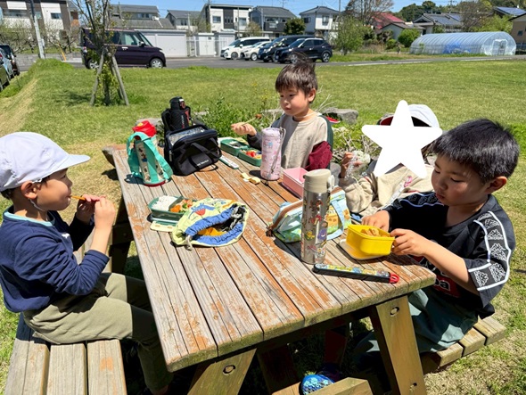 キッズガーデンの芝生へ出かけ、春の気持ちの良い青空の下でピクニックをしました。 みんなでお弁当を広げると、「見て見て~!」、「このお弁当、僕も作ったんだ!」、「おいしそうだね!」とお弁当を見せ合いながら、笑顔いっぱいに頬張る姿が見られました。 新学期を迎え、新しいお友だちも仲間入りし、少し緊張した表情も見られましたが、芝生で一緒に身体を動かす中で、自然と笑顔が広がり、すっかり打ち解けた子どもたち! 春の風を感じながら、のびのびと過ごす素敵なピクニックになりました♪