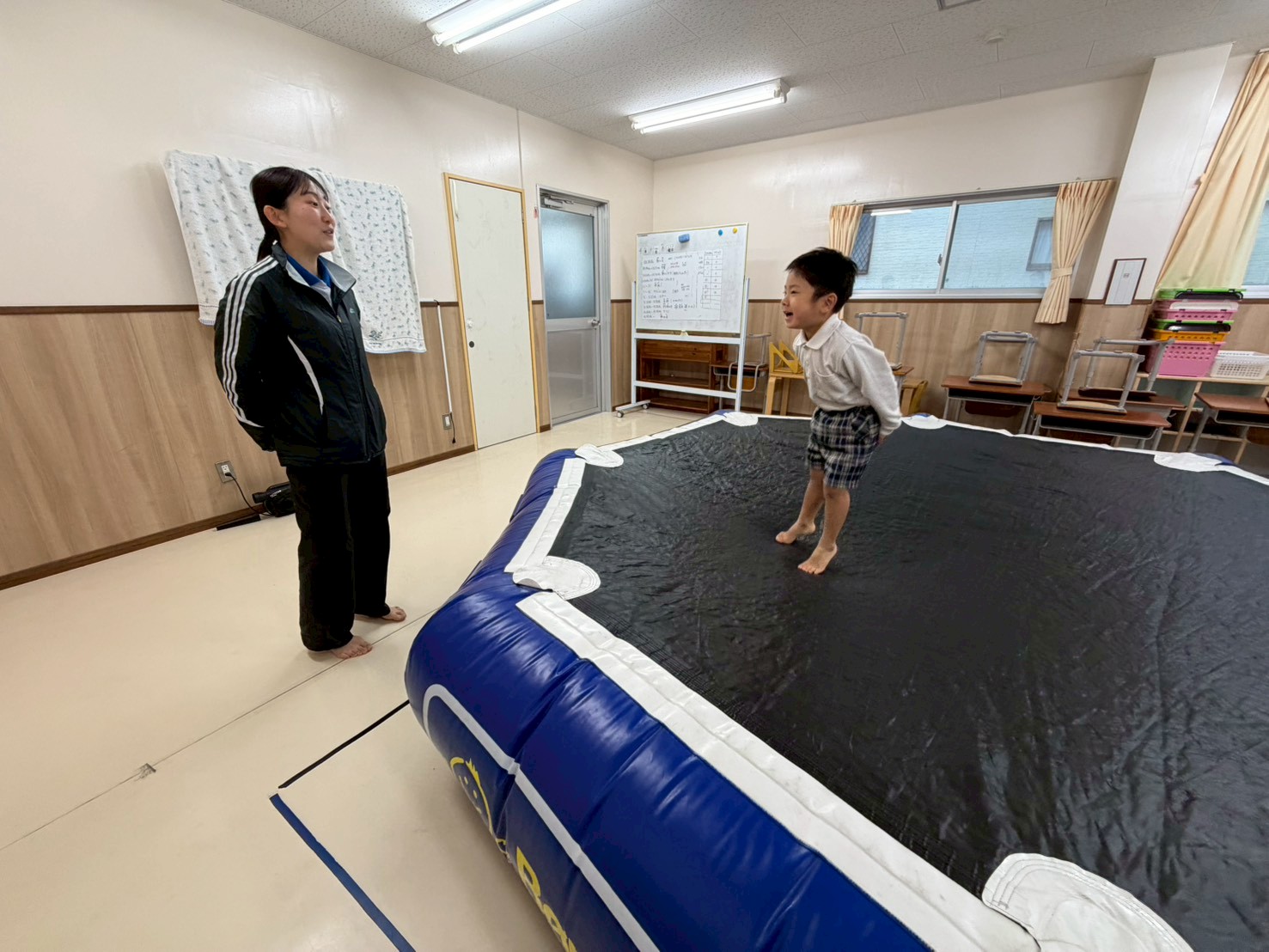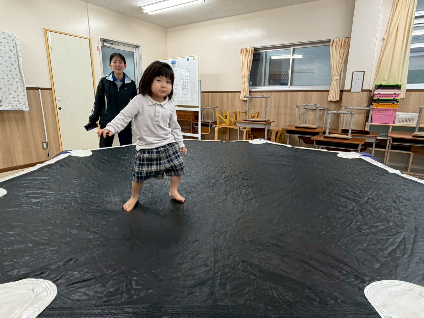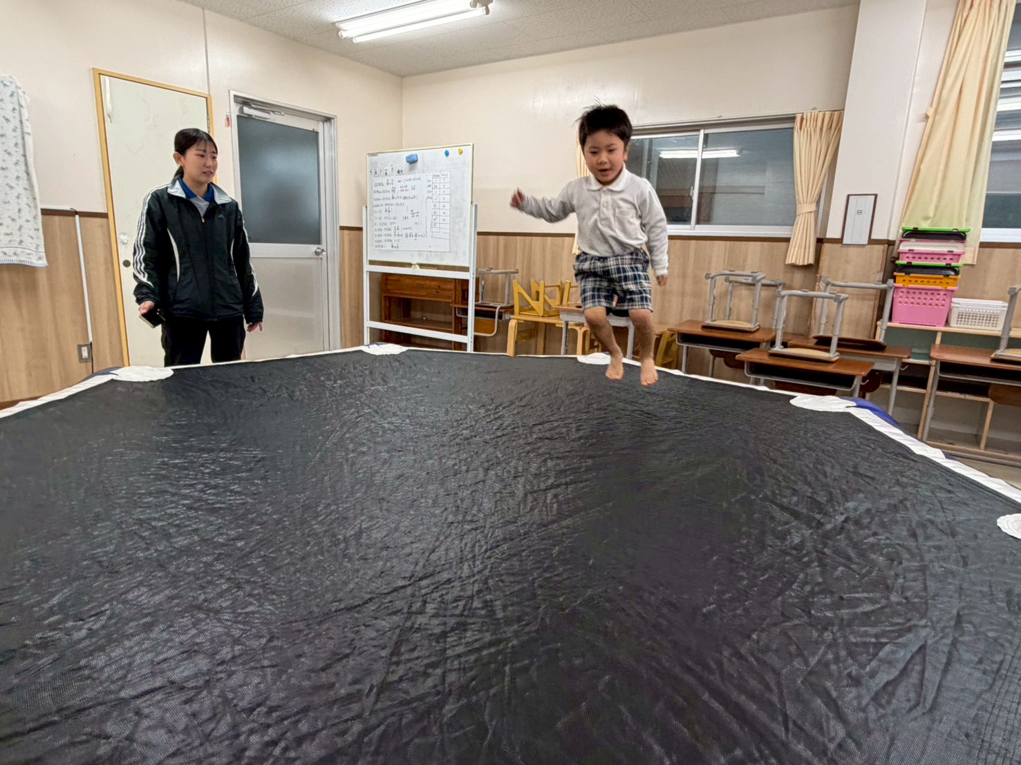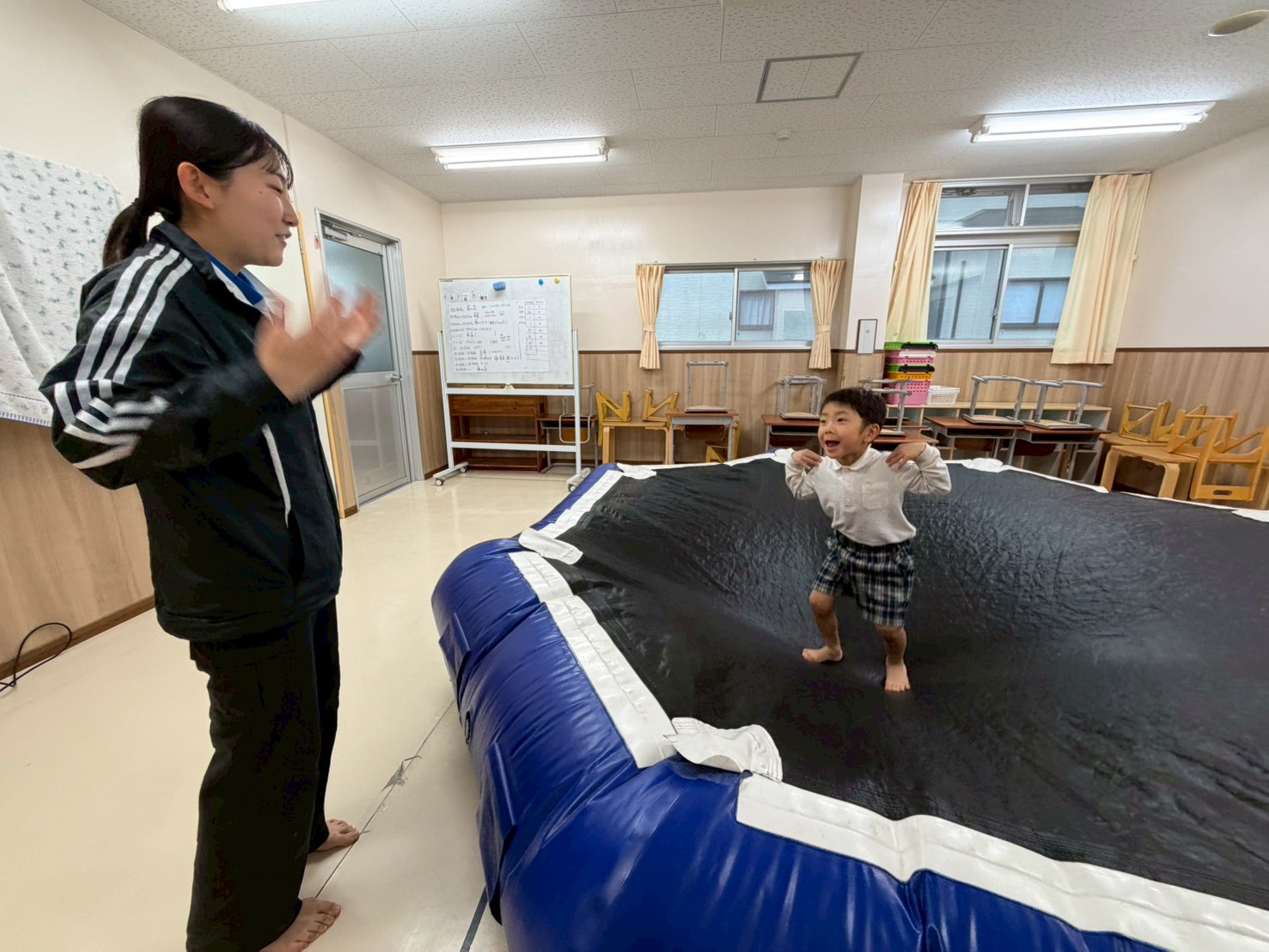 トランポリンを行いました! 楽しみながら体幹やバランス感覚を養うことをねらいとして取り組んでいます。 初めは、30秒間飛び続けることに挑戦です! 両足を大きく上げながら、勢いよくジャンプする子どもたち! 最後は、ジャンプしながら職員の動きを真似することもできたとらグループさんでした♪