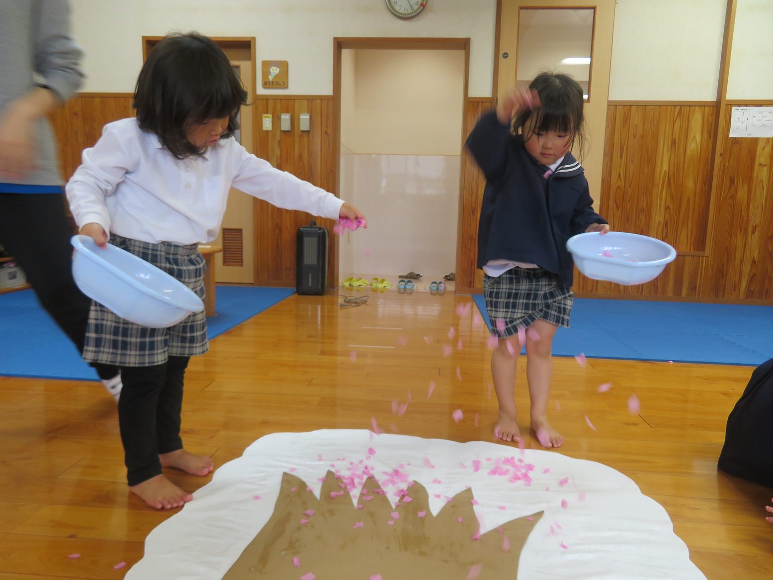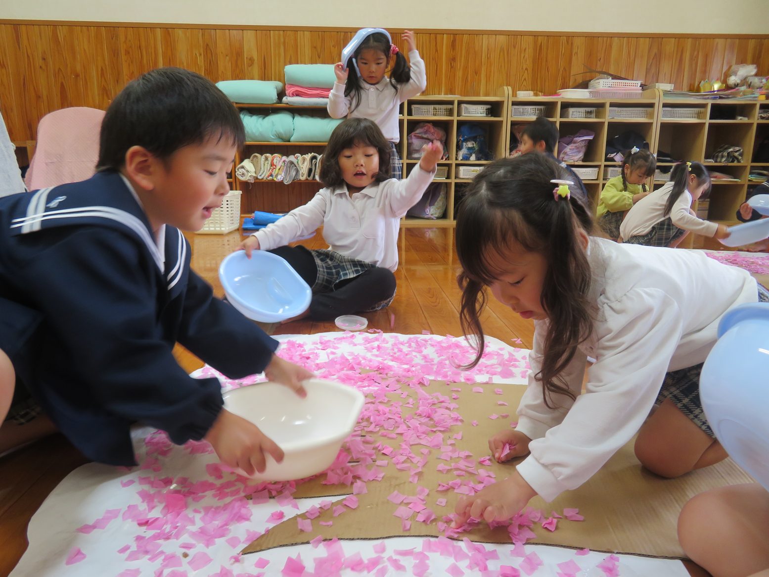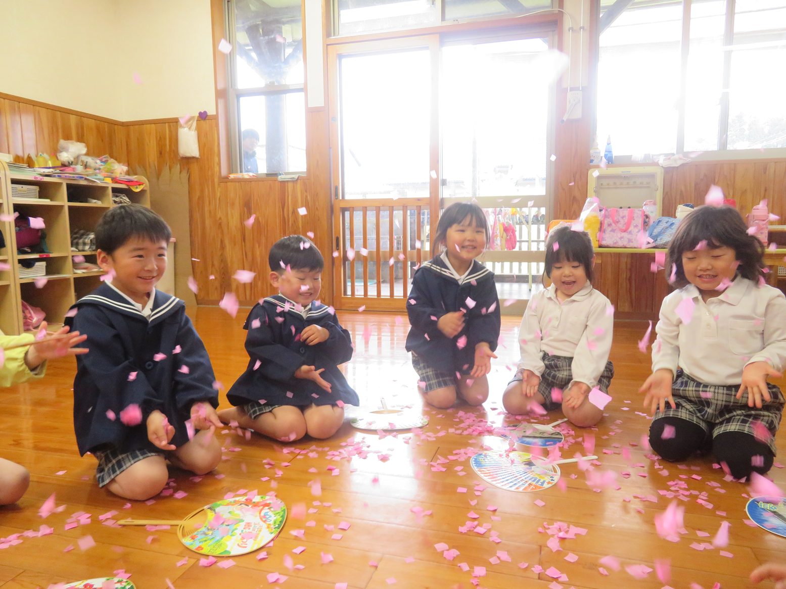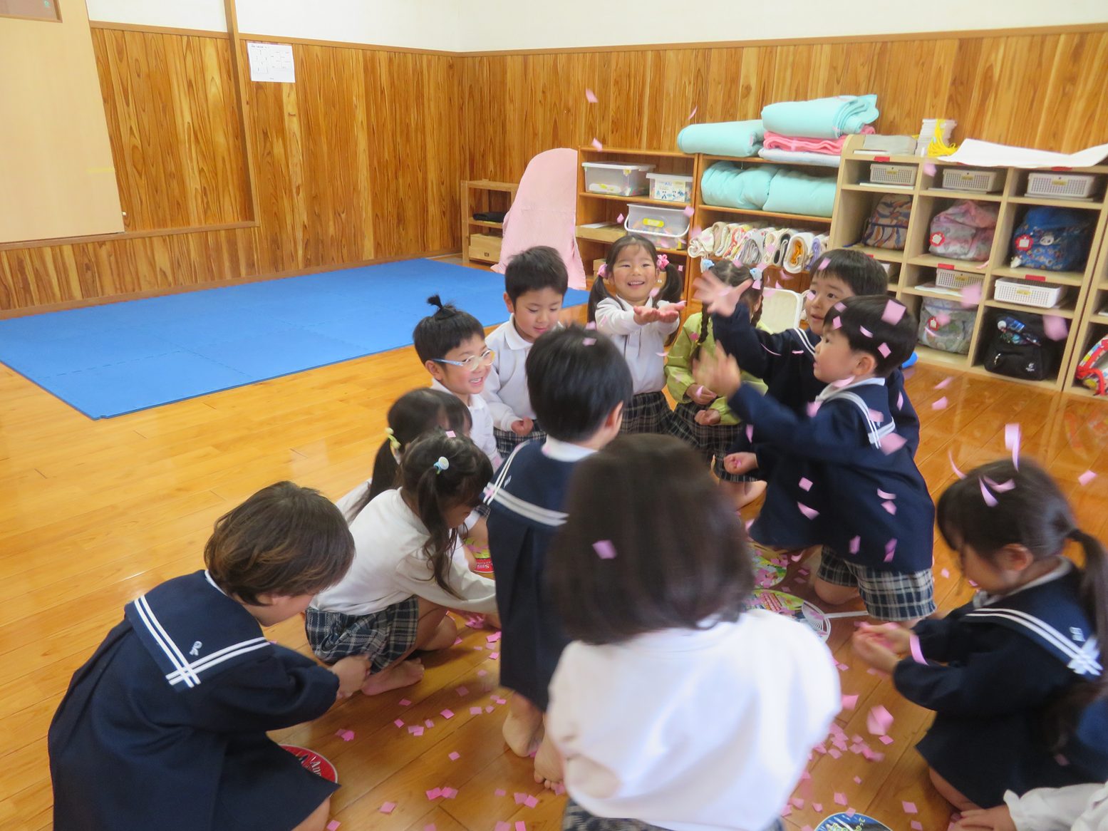 また、舞い落ちた花紙を集めて、「3,2,1!」の掛け声に合わせて打ち上げたり、うちわで床に散らばった花紙をパタパタと扇いで舞わせたり花紙遊びは終始大盛り上がりです。