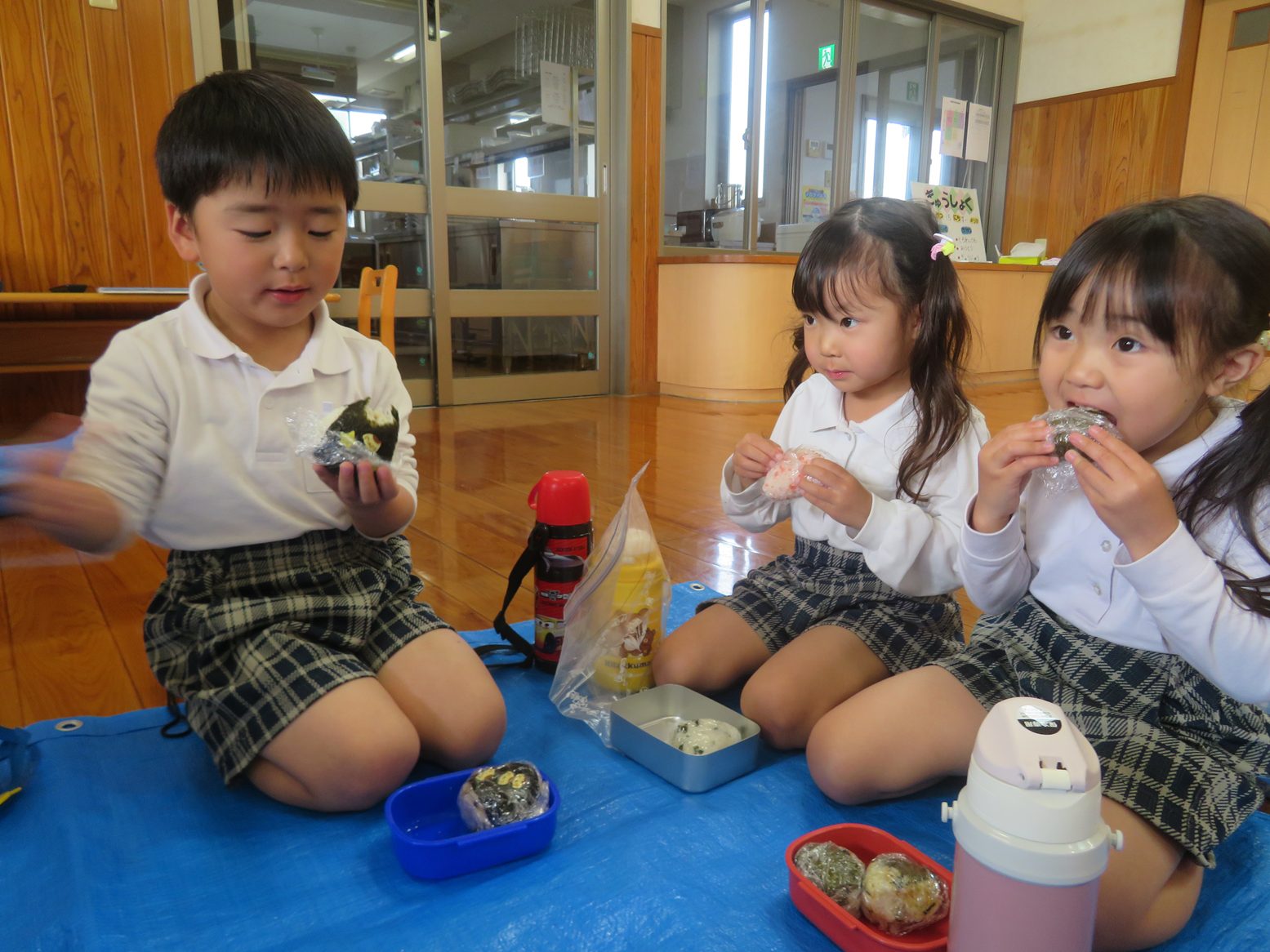 保護者の方に作ってもらったおむすびを嬉しそうに頬張り食べる子どもたちでした。