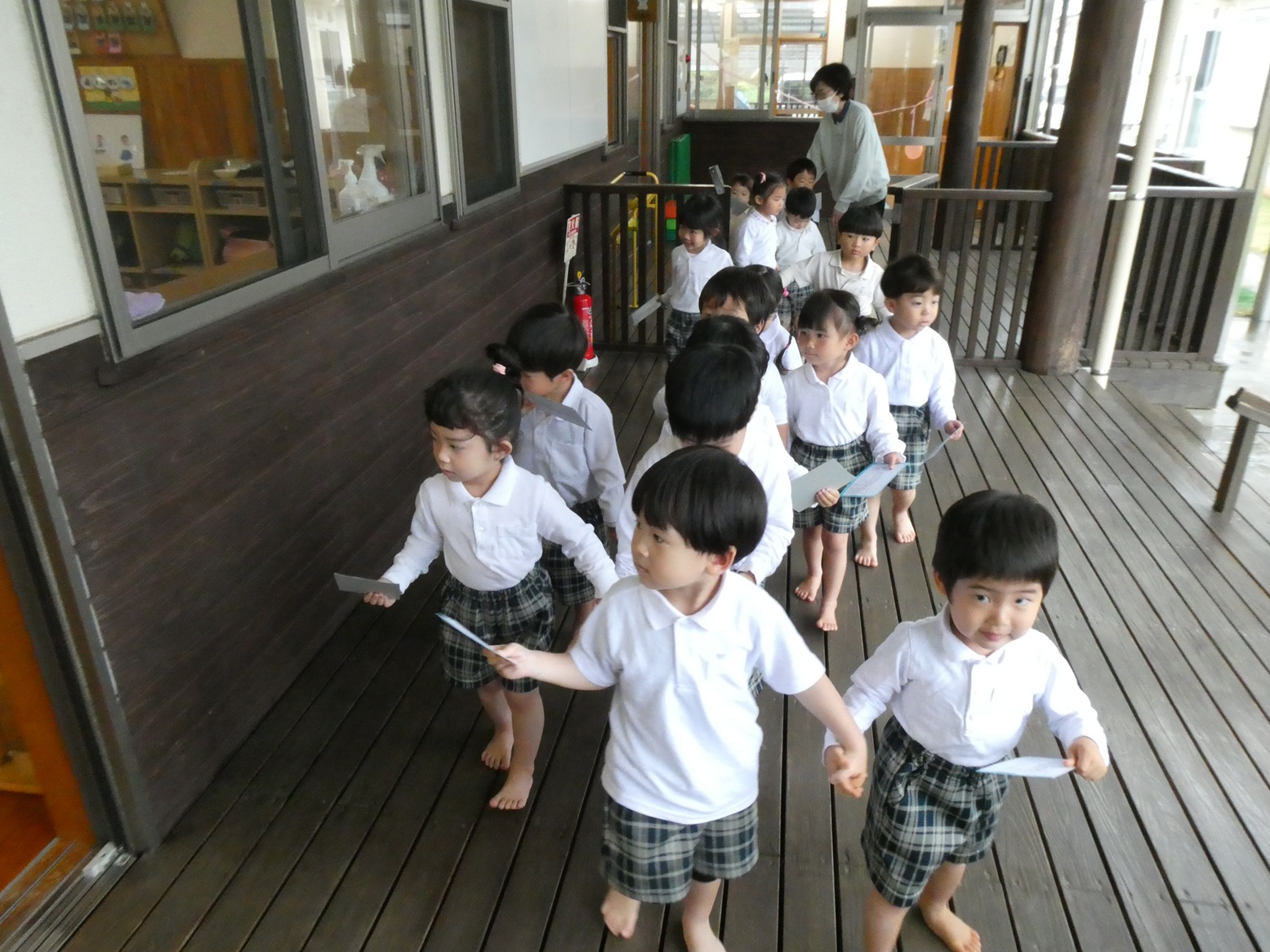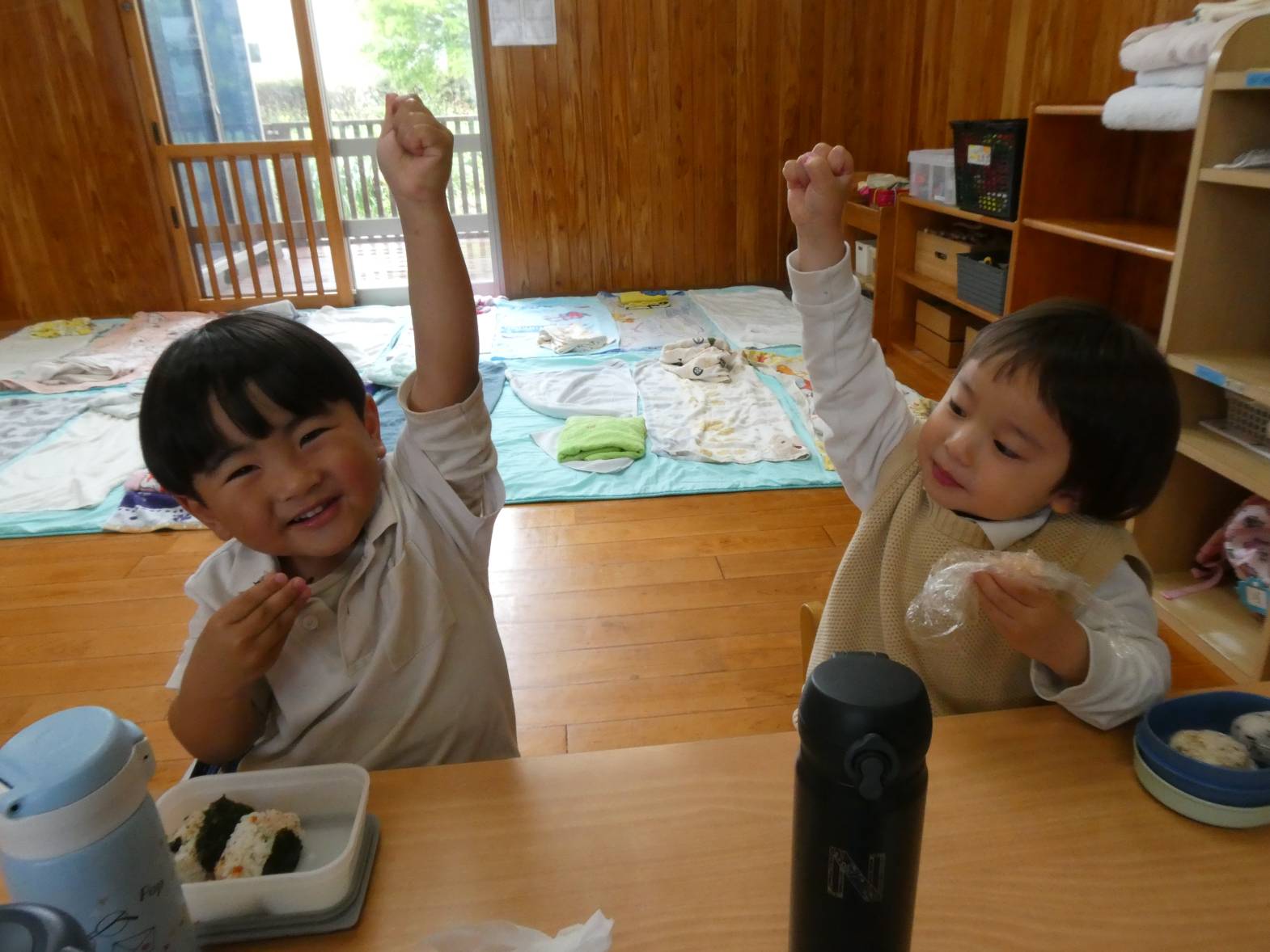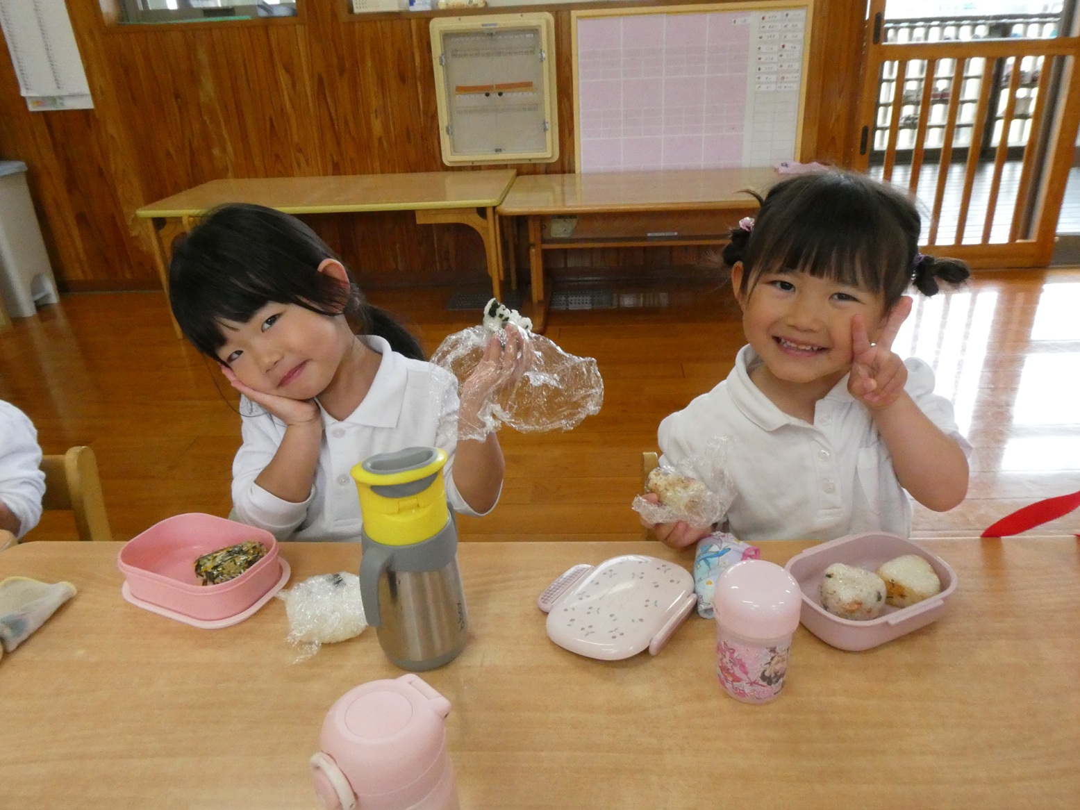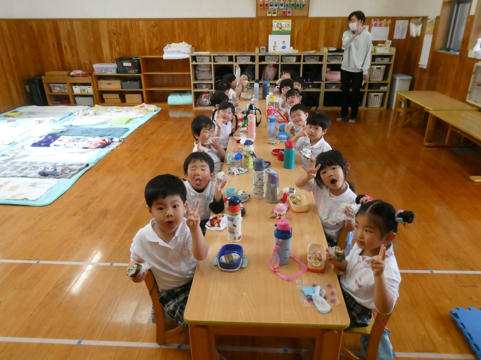 今日は雨で園庭で食べることができなかったので、お部屋の中でみんなで並んで食べることに!「おいしいね~」とかわいいお話がたくさん聞こえてきました!