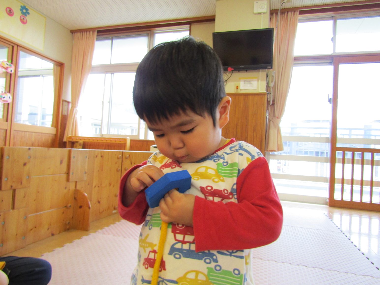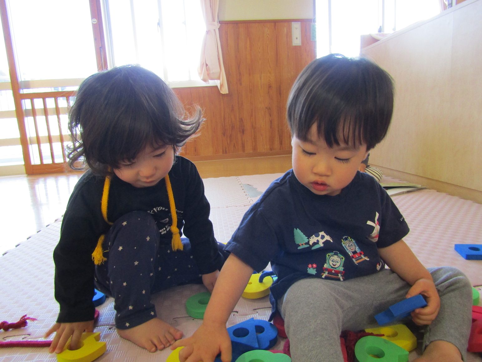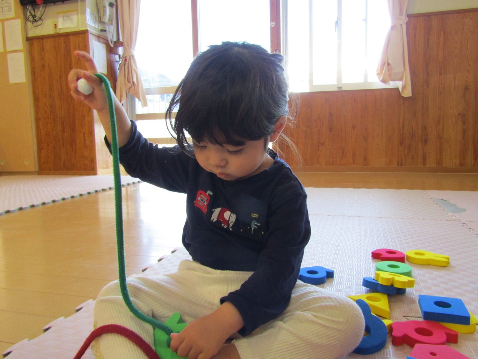 こあら組さんになり新しいおもちゃに目をキラキラさせている子どもたち。 紐を通しを出すと猫やうさぎの形を見て「にゃんにゃん!」、「わあー!」と友だちとのやり取りも楽しんでいます。 形を見て楽しんでいたこあら組さんもいつの間にか紐に通すことが上手に!! 真剣な顔をして通す姿が可愛らしいです♡ たくさんの形を通し、長くなった紐を見てニコニコの子どもたちです。