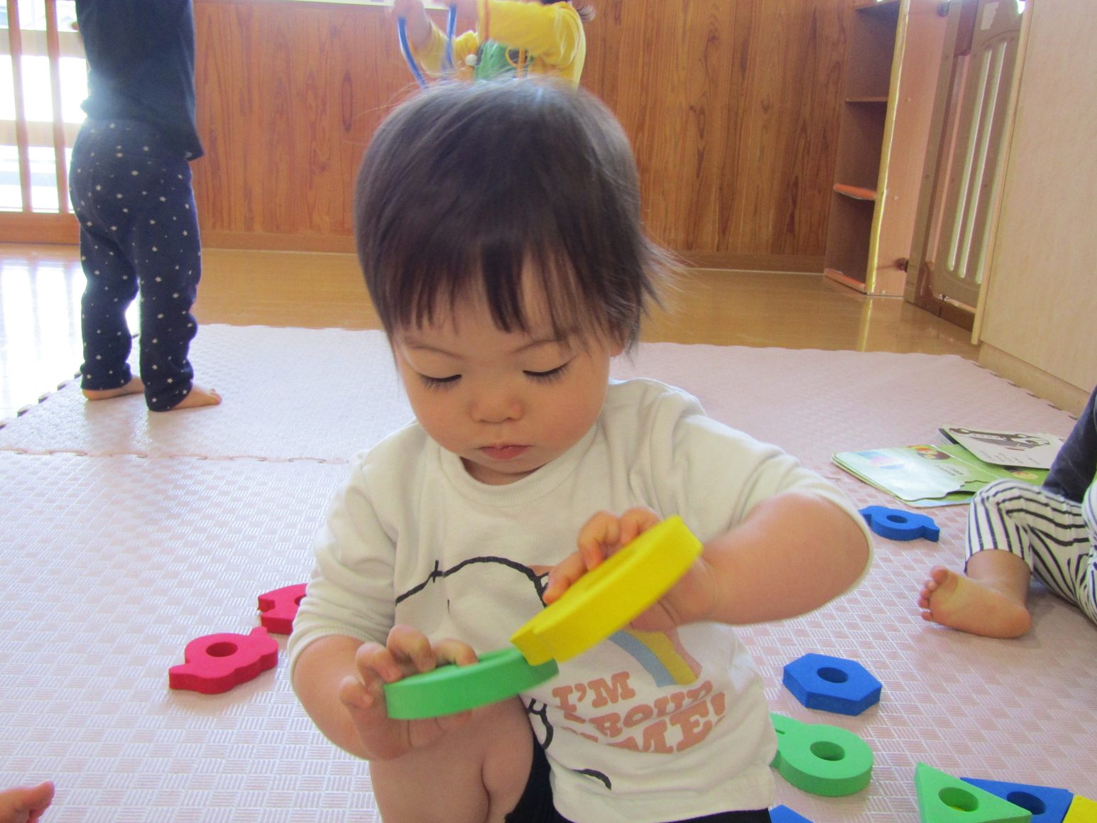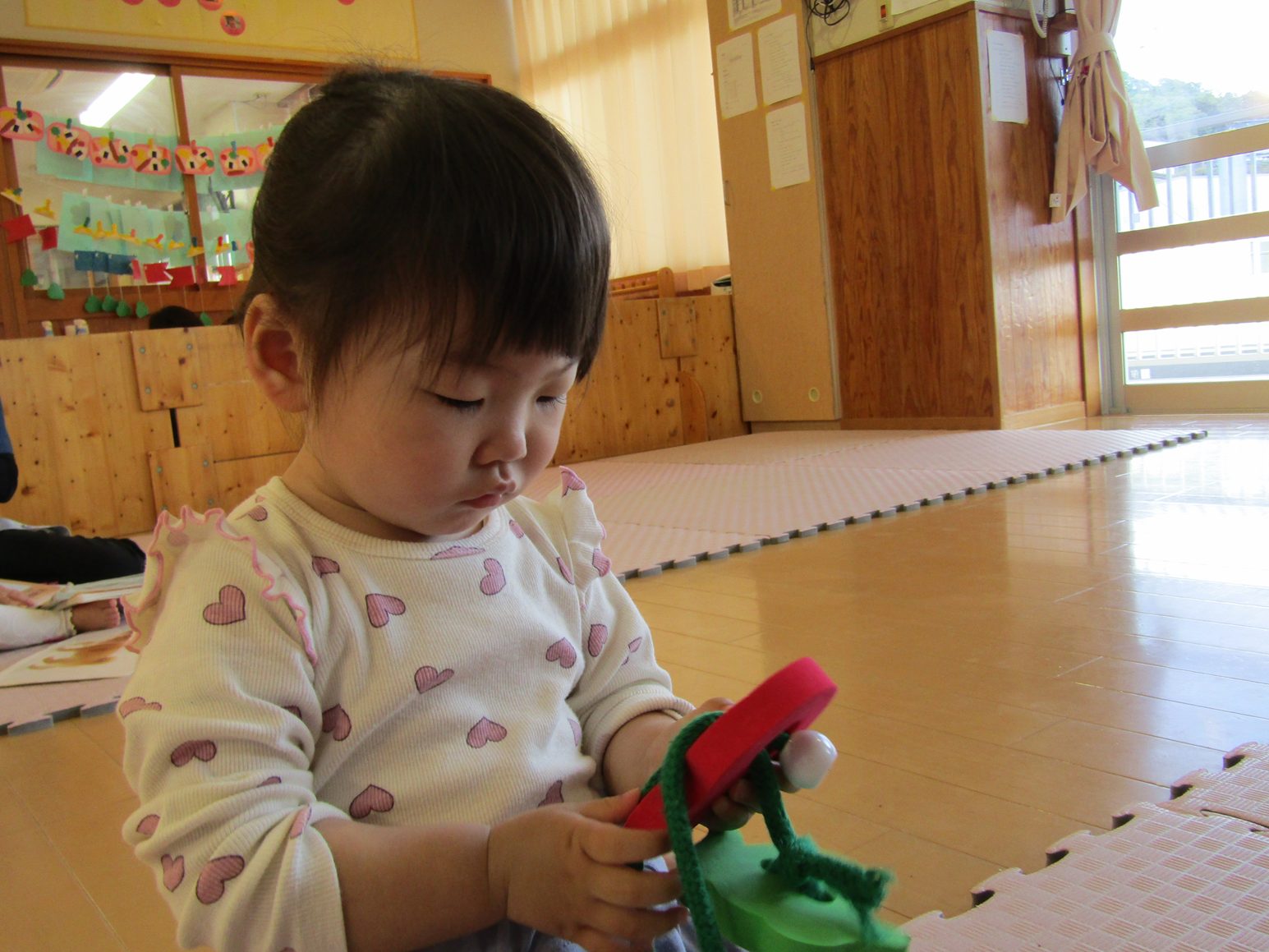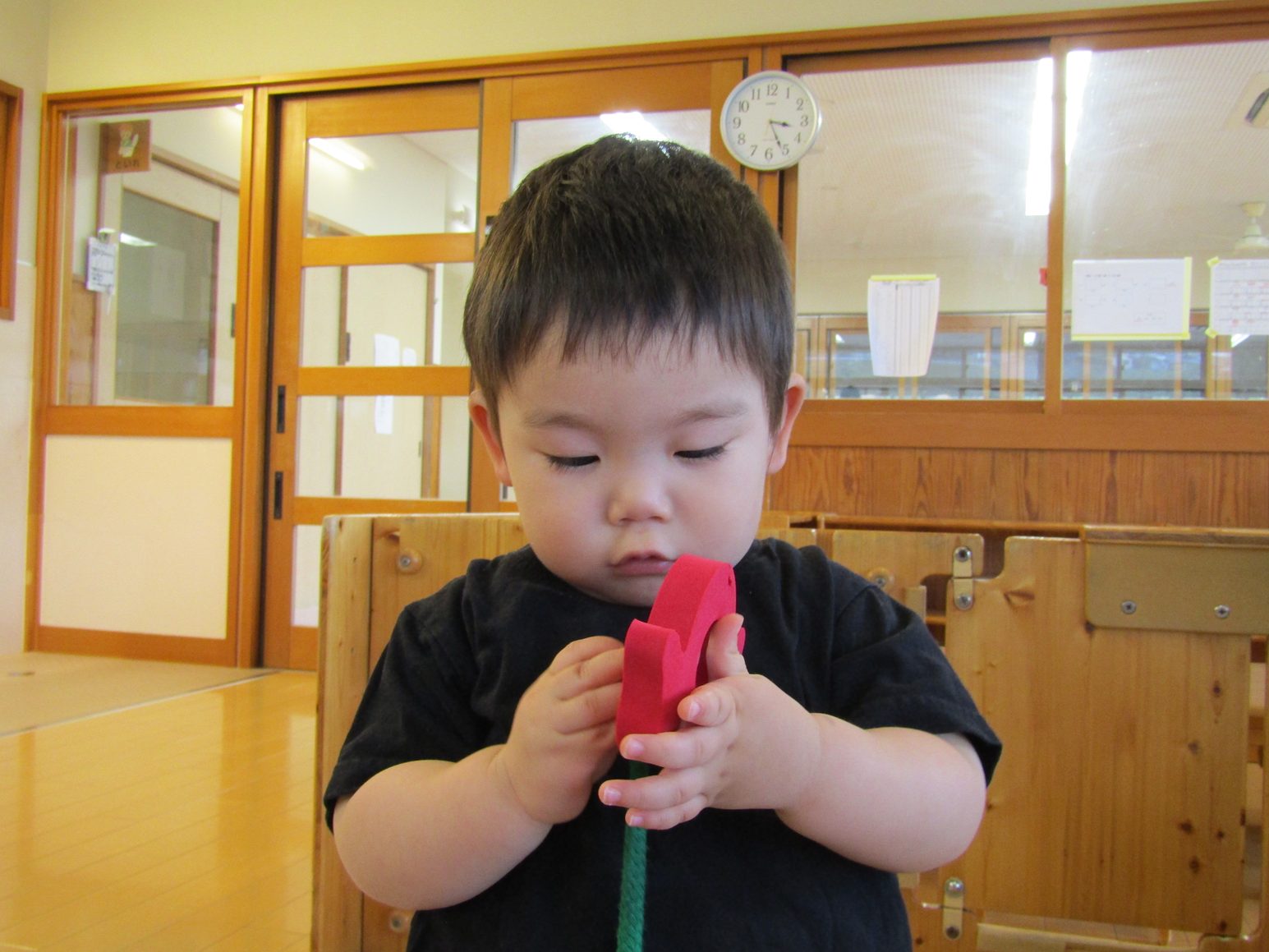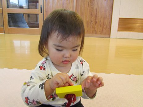 こあら組さんになり新しいおもちゃに目をキラキラさせている子どもたち。 紐を通しを出すと猫やうさぎの形を見て「にゃんにゃん!」、「わあー!」と友だちとのやり取りも楽しんでいます。 形を見て楽しんでいたこあら組さんもいつの間にか紐に通すことが上手に!! 真剣な顔をして通す姿が可愛らしいです♡ たくさんの形を通し、長くなった紐を見てニコニコの子どもたちです。