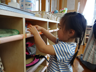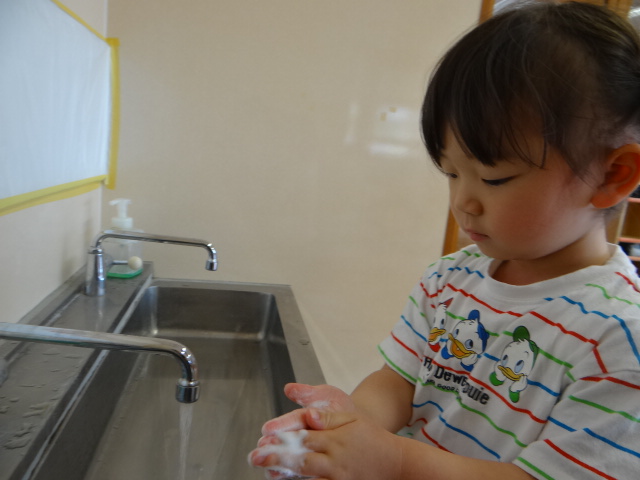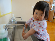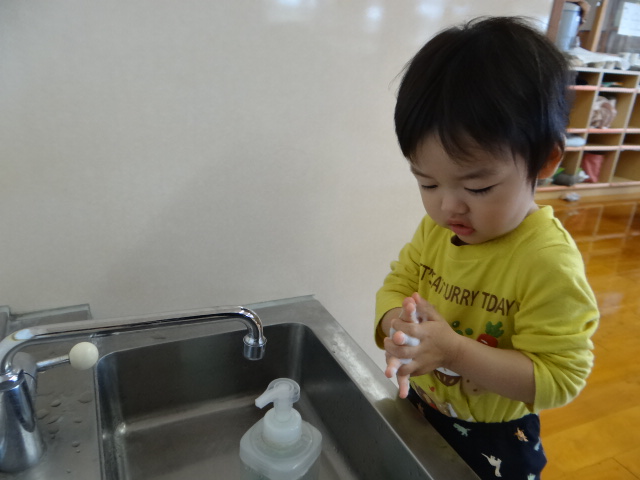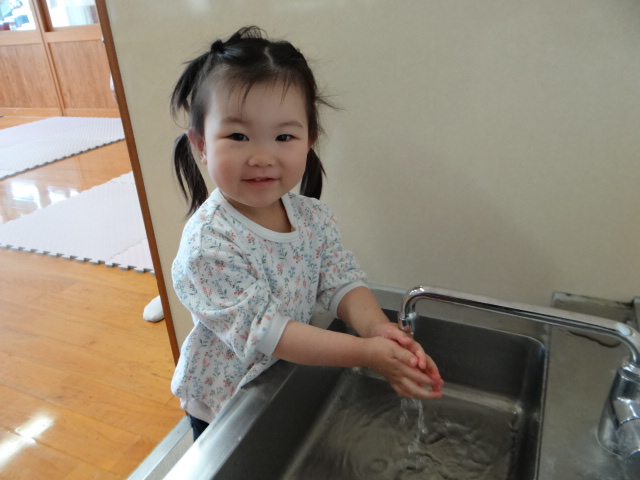 活動の後や、給食・おやつの前に手を洗っているぱんだ組さん。 石鹸を使ってきれいに洗ったり、水でしっかり流したりする姿が見られます。 手をきれいに洗った後は、掛けてある自分のタオルで丁寧に手を拭く子どもたち。 おやつの前に手を洗ったら、自分の棚にタオルを片付けることにも挑戦しています。 「手がピカピカになったよ!」「タオル片付けられたよ!」と嬉しそうな様子で次の活動に移る子どもたちでした。