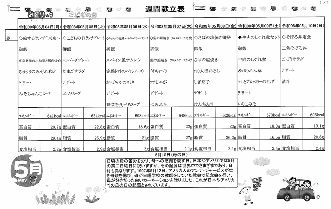 5月4日(月)~5月10日(日)の献立表になります。ぜひご覧ください。