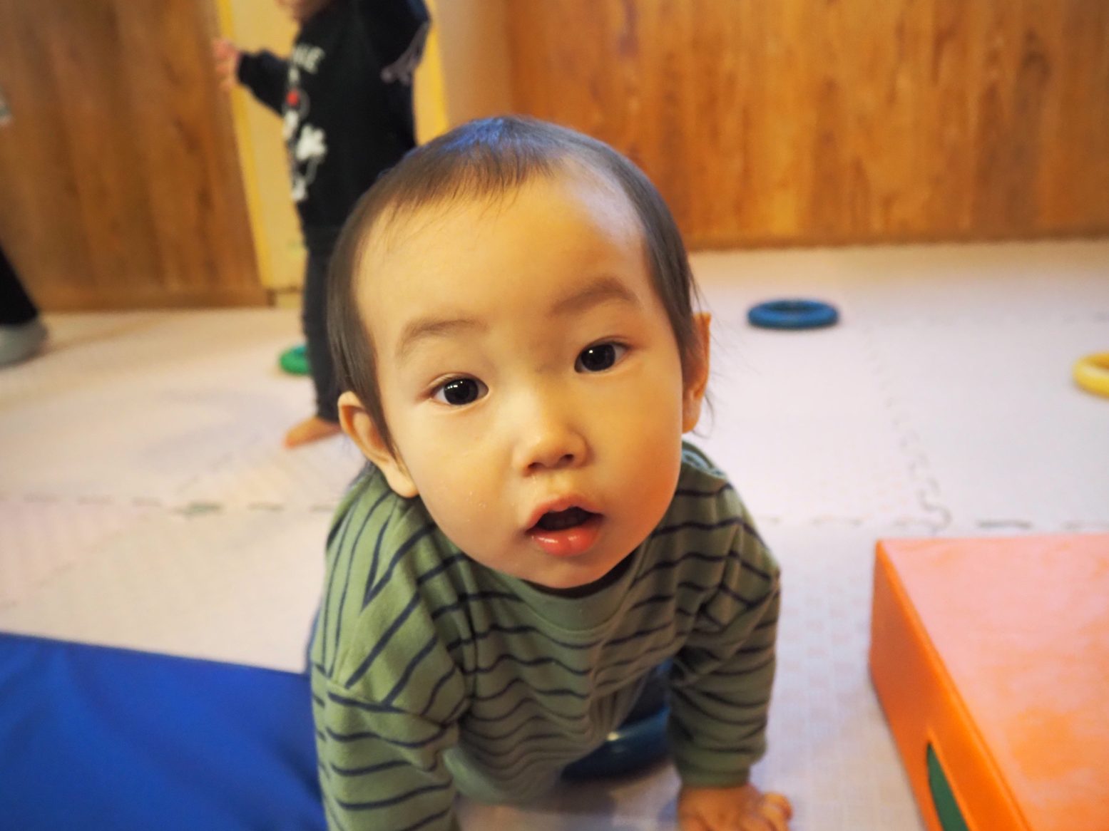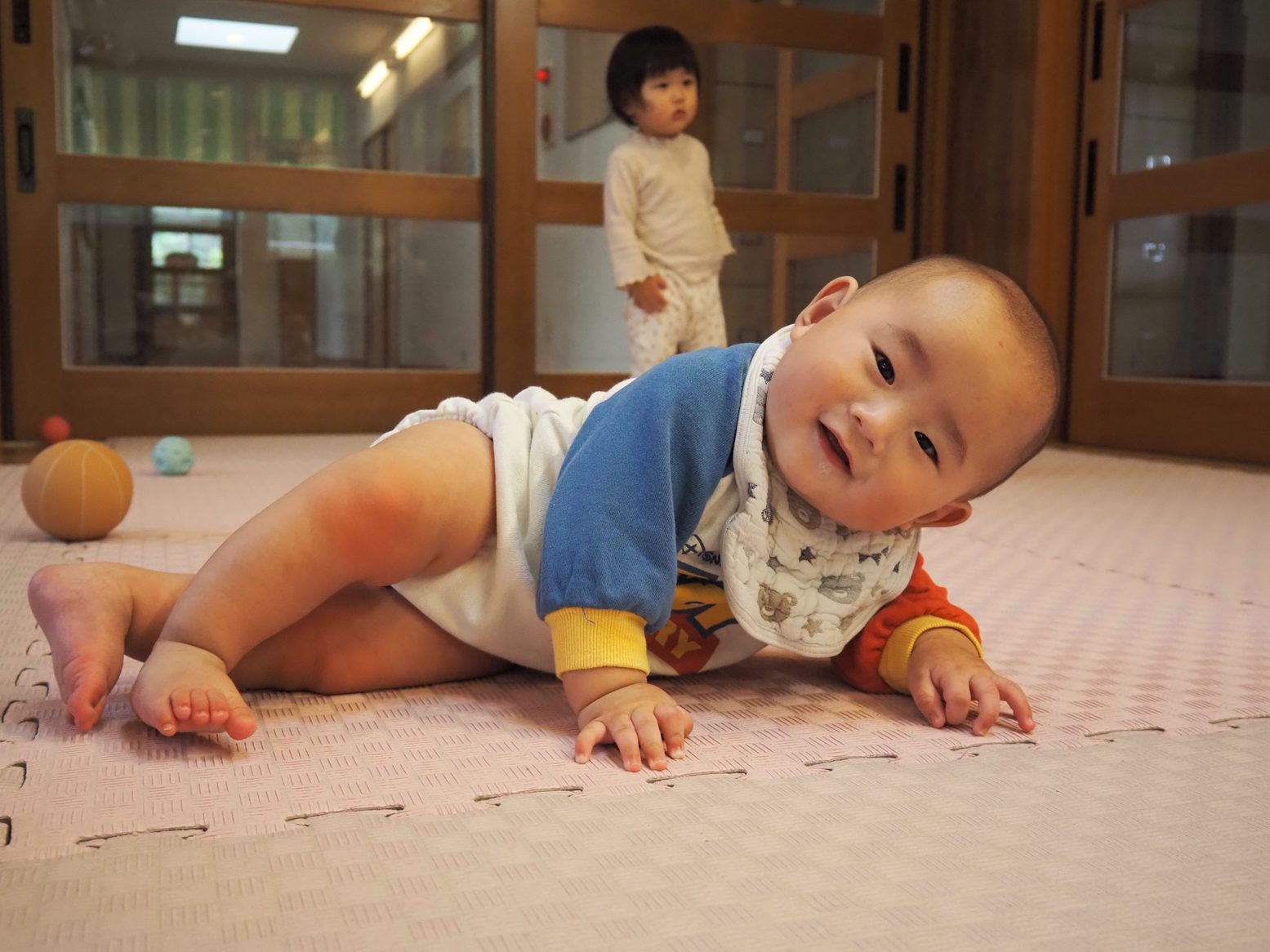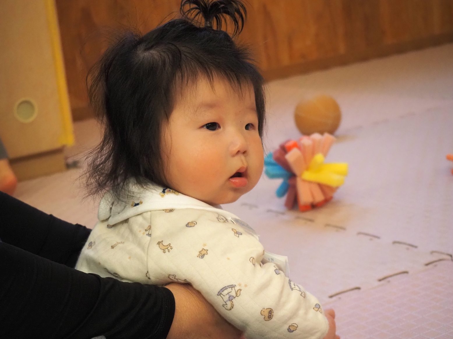 入園してからたくさん泣いていたひよこ組さん。 まだ友だちにつられて泣くこともありますが、少しずつ慣れて活動に参加する姿が見られてきました。 一人一人の成長に応じて一緒に「歩こう~、歩こう~♪」と散歩を楽しんだり、ずり這いをしようと一生懸命頑張ったり、この1カ月だけでも成長がたくさん見られました。 活動中に音楽を流すと体を揺らしたり、一緒に踊ってみたりととても可愛らしいひよこ組さん! 落ち着いたころに活動場所をさらに広げていきたいと思います。