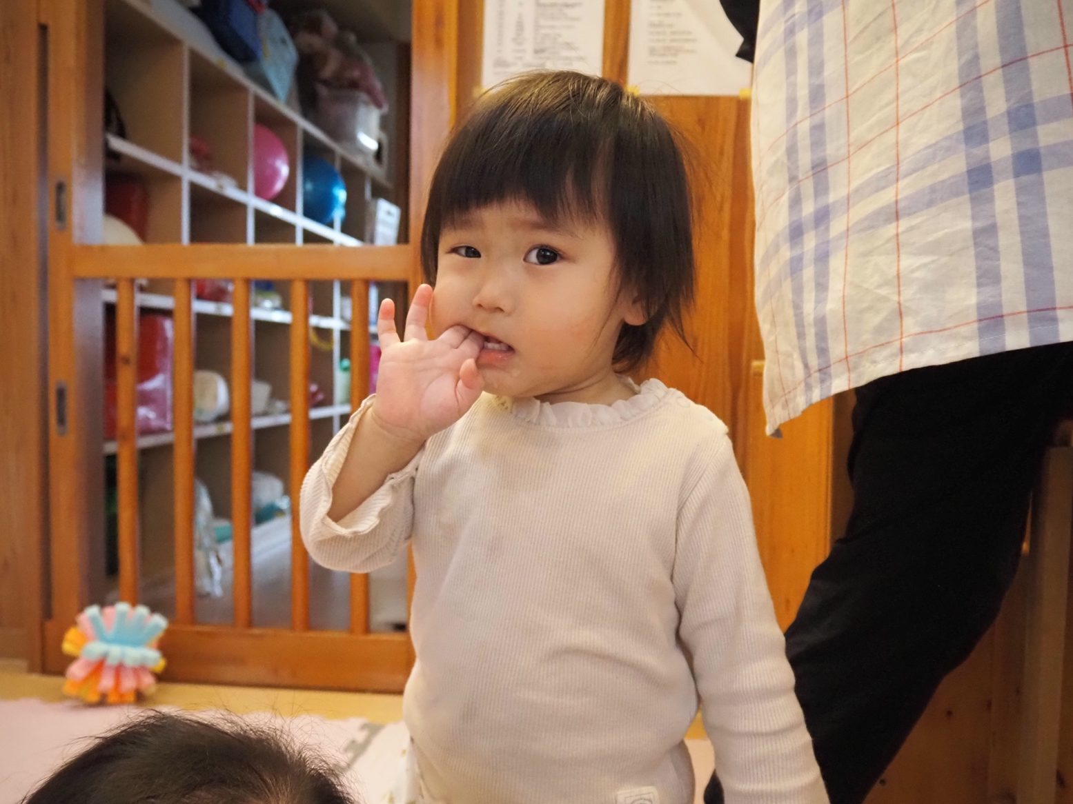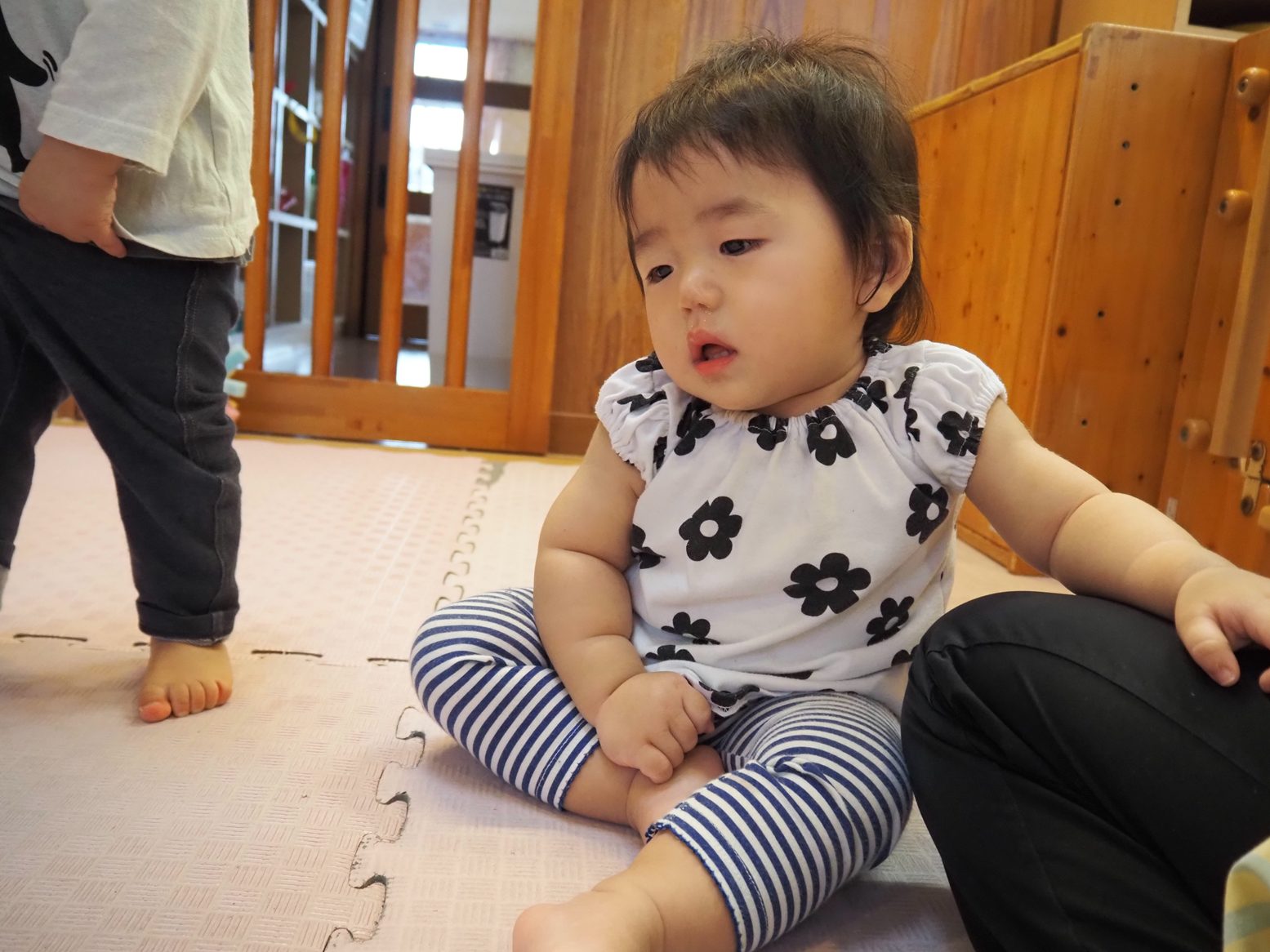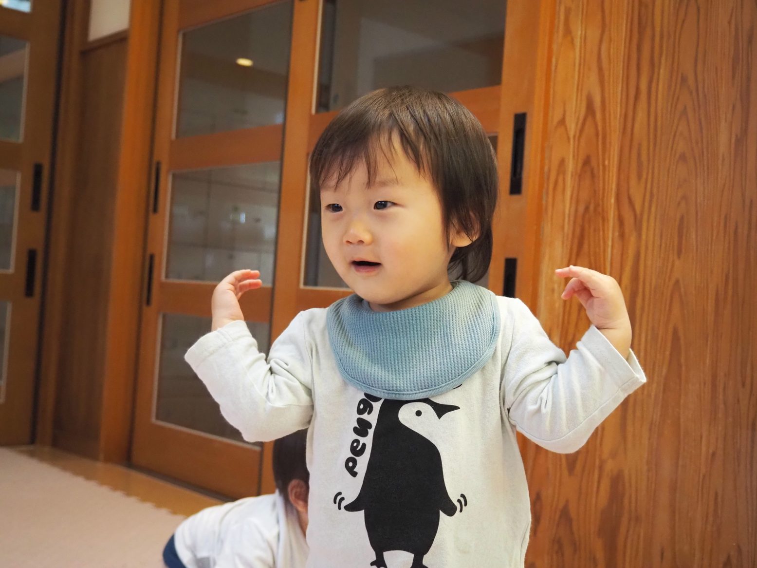 入園してからたくさん泣いていたひよこ組さん。 まだ友だちにつられて泣くこともありますが、少しずつ慣れて活動に参加する姿が見られてきました。 一人一人の成長に応じて一緒に「歩こう~、歩こう~♪」と散歩を楽しんだり、ずり這いをしようと一生懸命頑張ったり、この1カ月だけでも成長がたくさん見られました。 活動中に音楽を流すと体を揺らしたり、一緒に踊ってみたりととても可愛らしいひよこ組さん! 落ち着いたころに活動場所をさらに広げていきたいと思います。