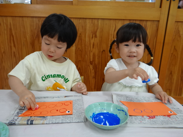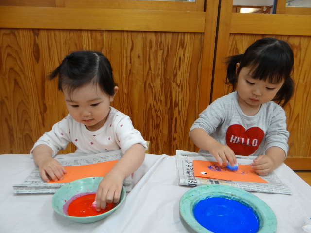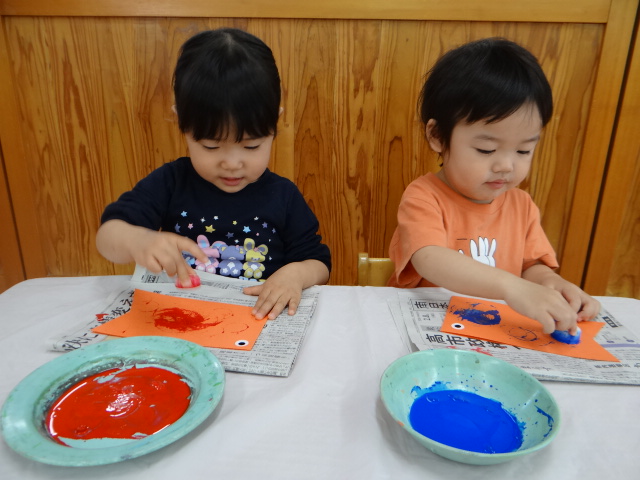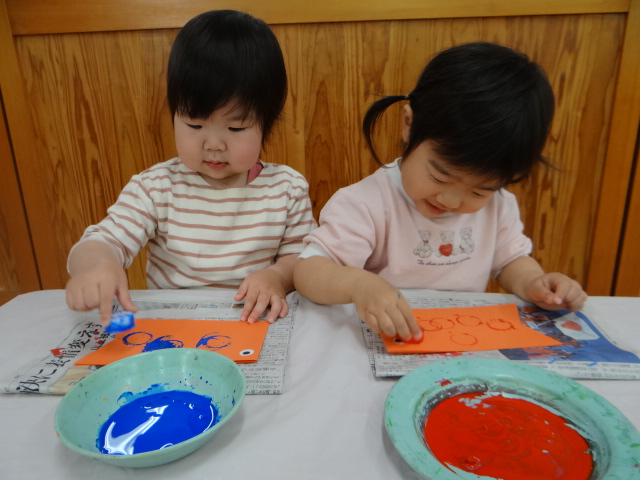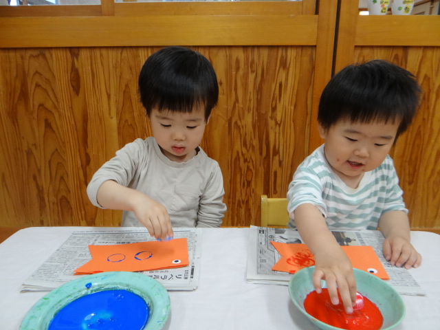 子どもの日に向けてこいのぼり製作をしたぱんだ組さん。 丸シールでこいのぼりの目を作ったり、ペットボトルのキャップを使ってウロコの模様を作ったりすることに挑戦! 「目ができたよ!」「スタンプペタペタ!」と嬉しそうに取り組む姿が見られます。 作り終わると、「上手にできたよ!」「楽しかった!」と満足そうな子どもたち。 今後も製作等の活動を通して、季節ならではの行事に親しみや興味を持つことができるようにしていきたいと思います。