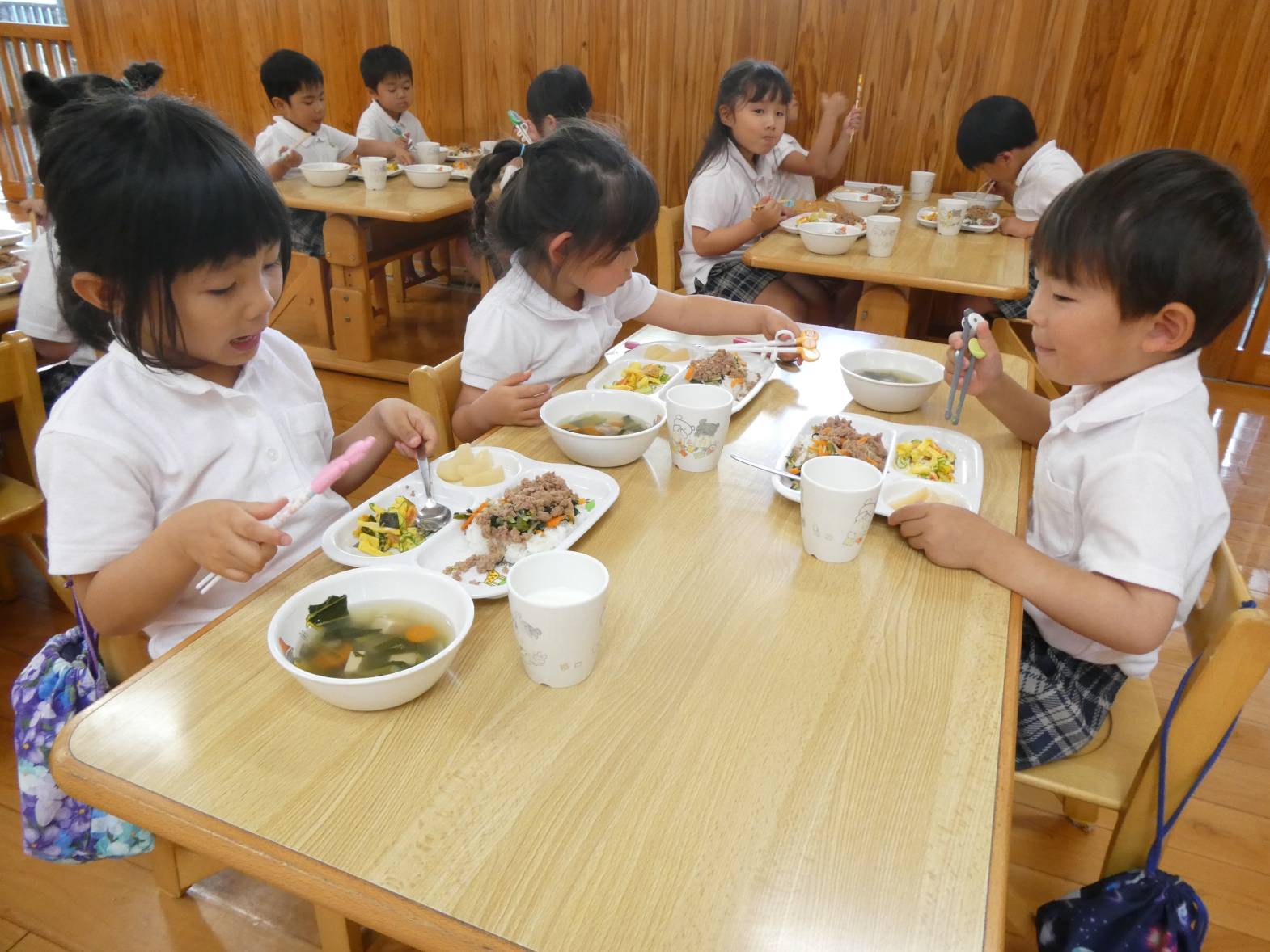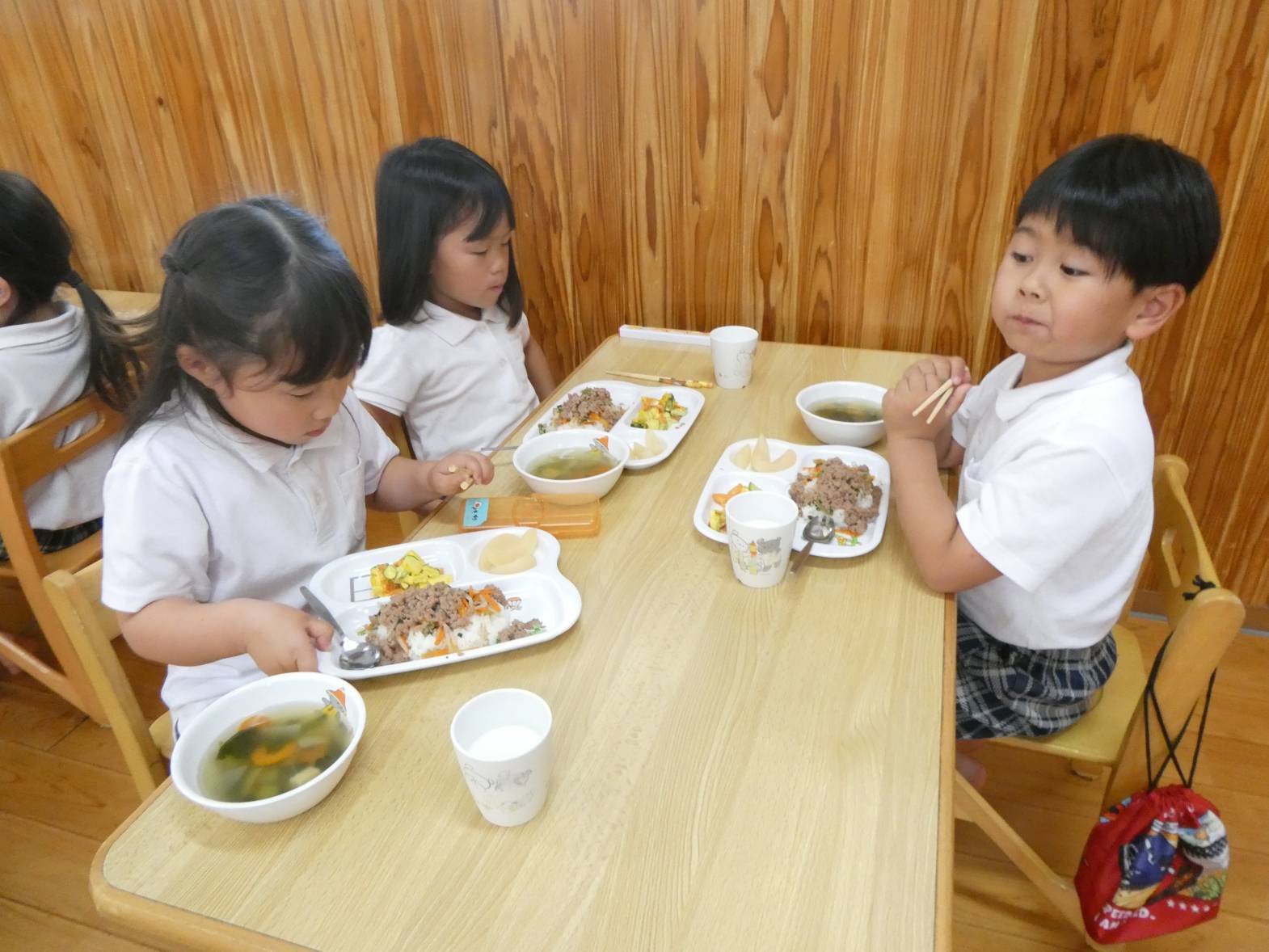 デザートに桃があり、「冷たくて美味しいね!」と友だち同士で会話が弾みながらわくわくメニューを楽しんでいた子どもたちです!