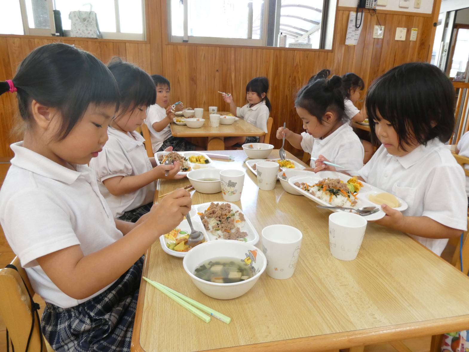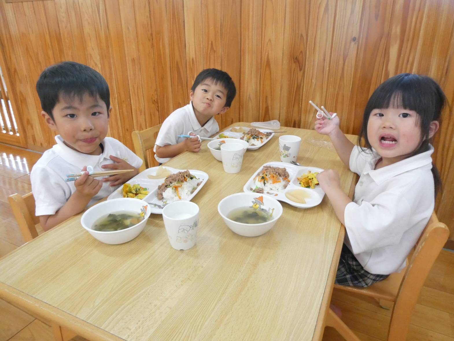 いただきますの挨拶をすると、ビビンバを勢いよく食べ進めていく子どもたち。