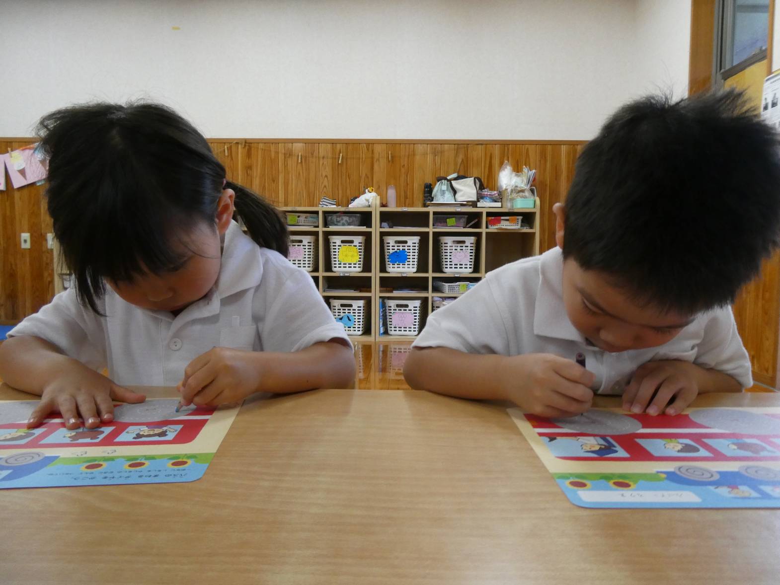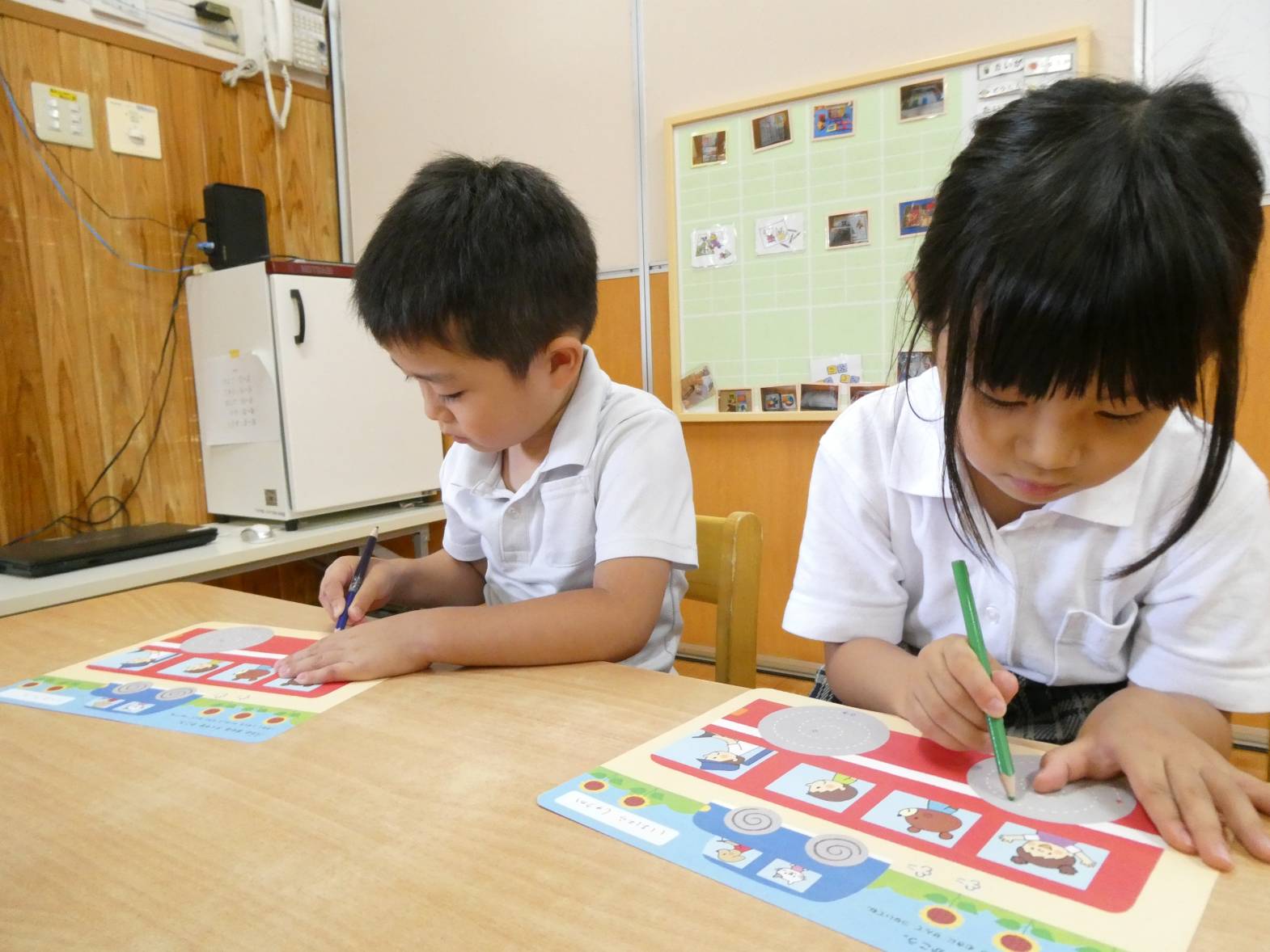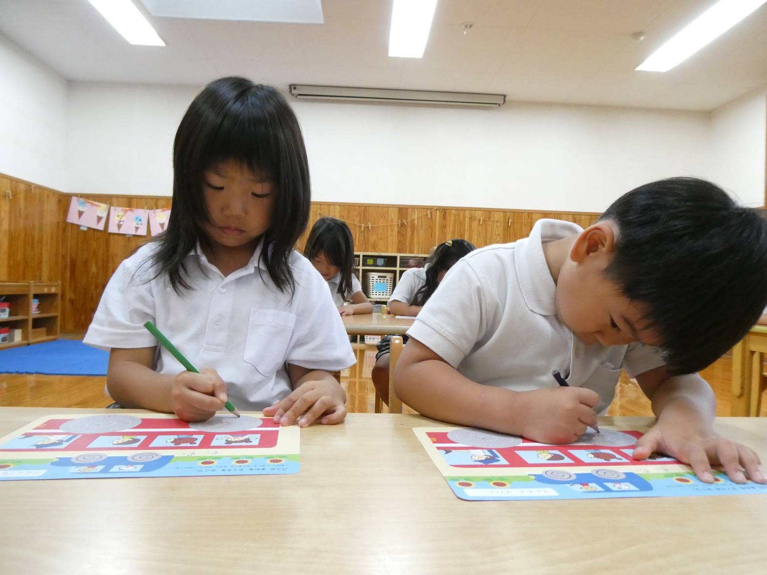月間絵本の中についている点線をなぞるページがあり、子どもたちから「先生、これやりたい!」と、声が上がったため早速やってみることにしました。