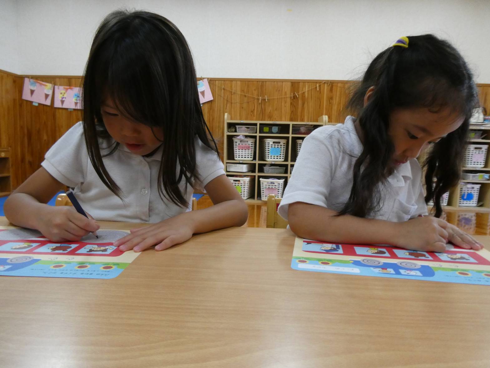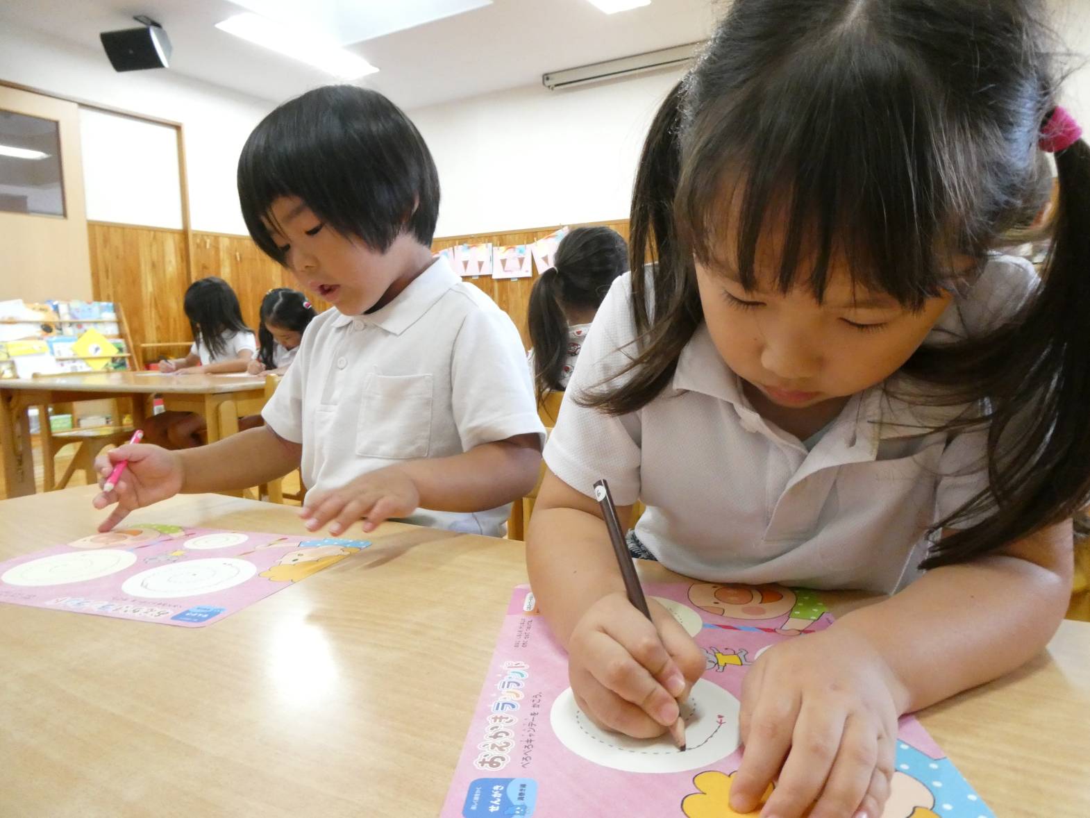 鉛筆の持ち方の確認も終わり、早速みんなで取り組みます。