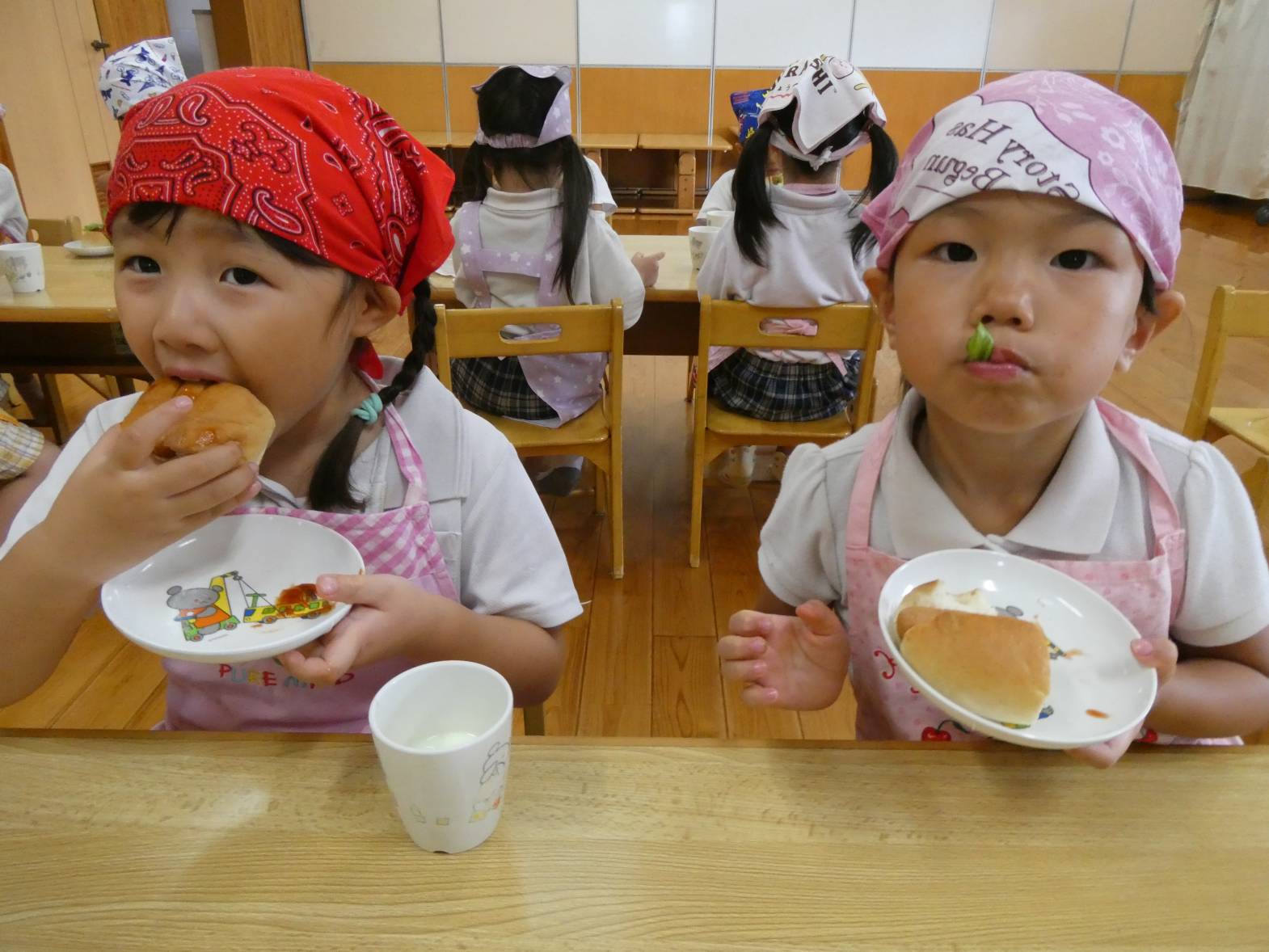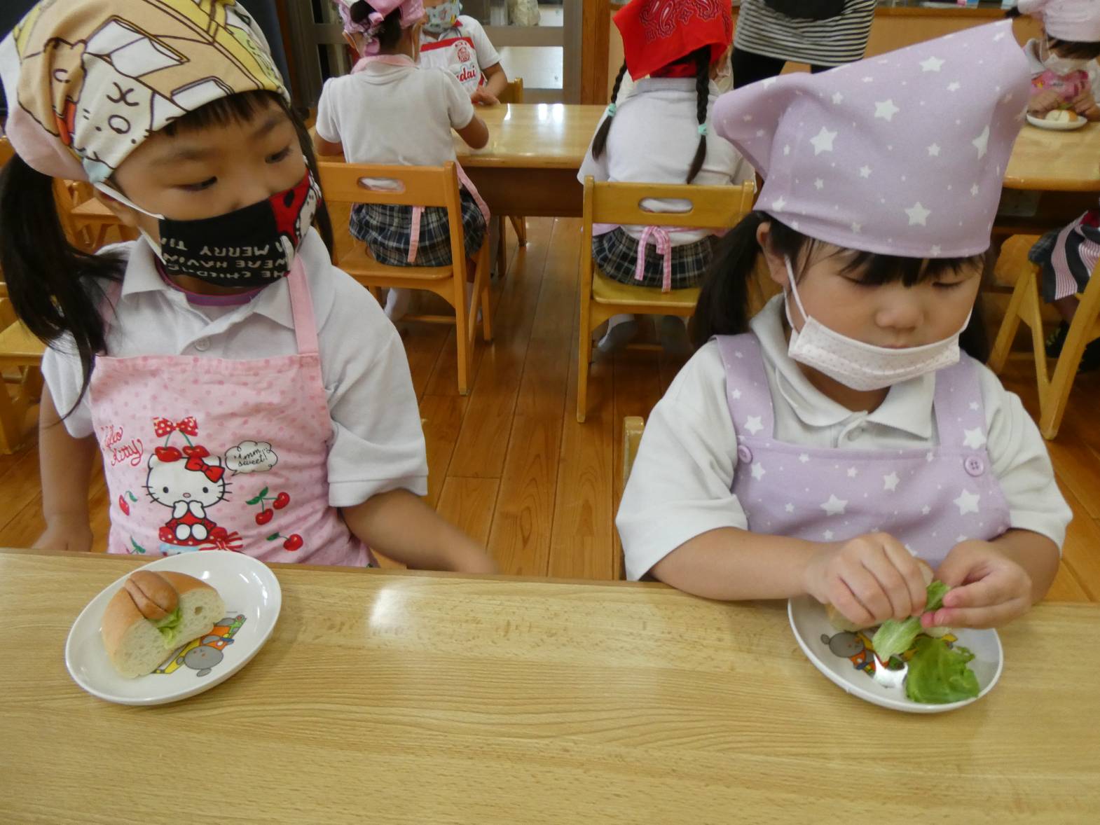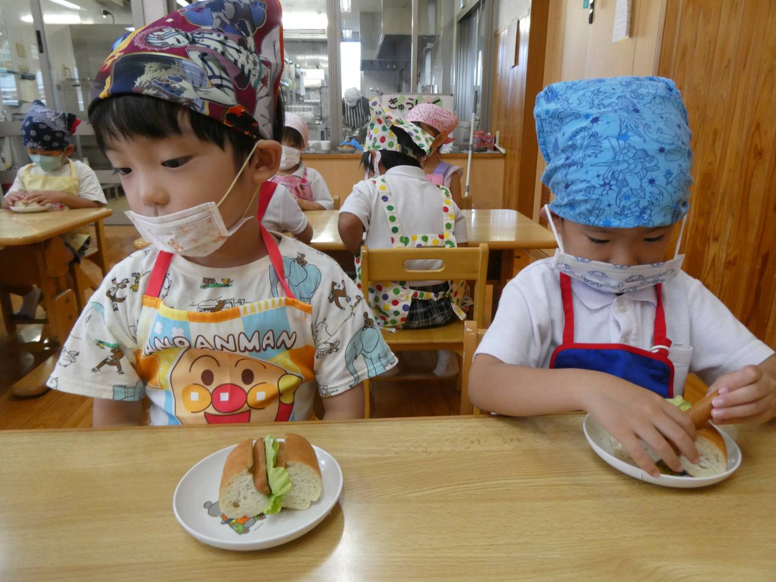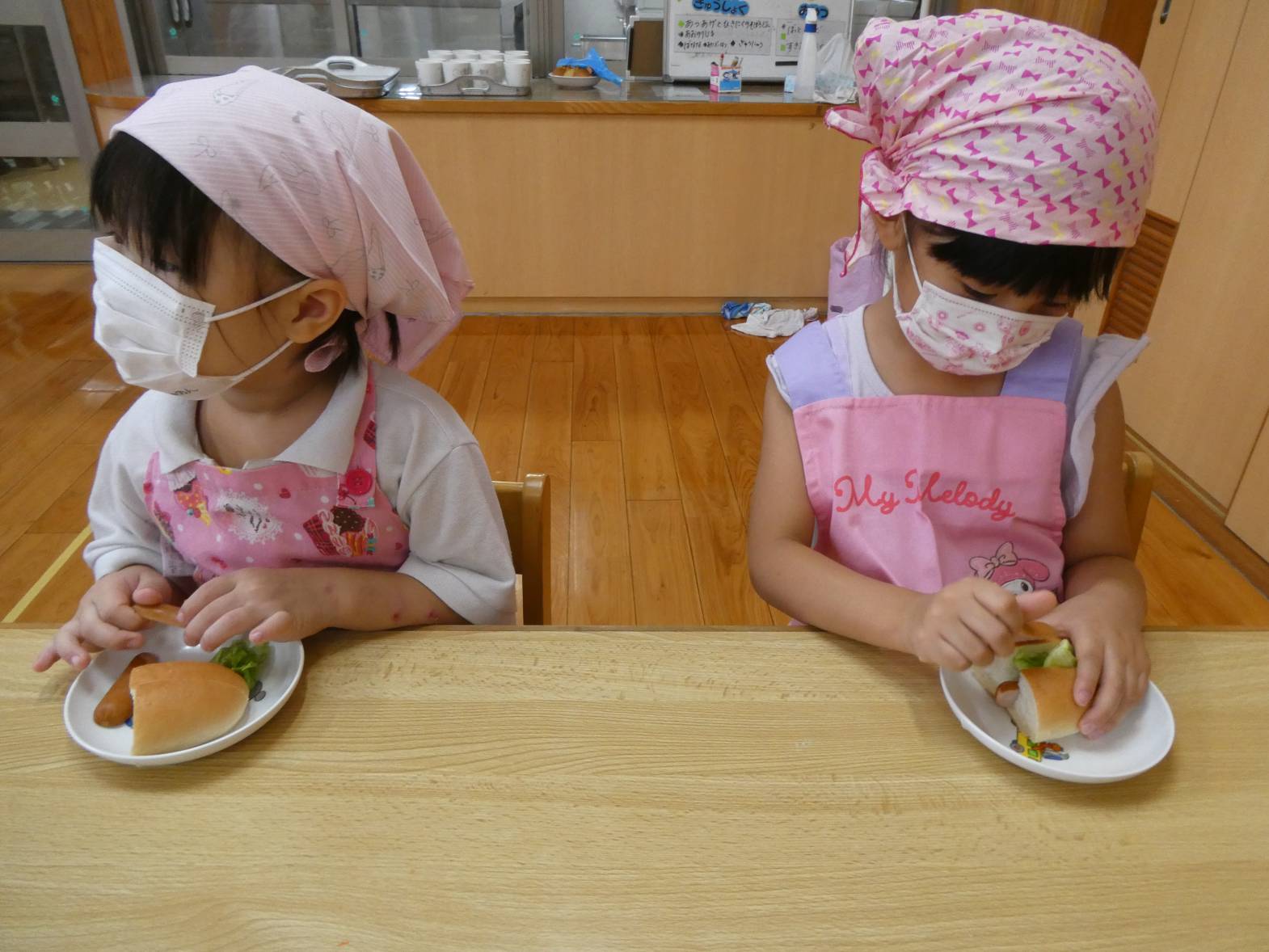 先日、クッキングがありました。 この日をとても楽しみにしていた子どもたち。 早速、ホットドッグの作り方を聞いていきます。 パンにレタスを挟み、その上にソーセージをのせていきます。 「レタス挟むの難しいね~。」と苦戦しながらも頑張っている子どもたち。 最後にケチャップをぬって完成です! 友だちのホットドッグを見て、「○○ちゃんの上手~!」とお互いに褒め合う様子が見られました。 自分たちで作ったホットドッグが美味しかったようで、あっという間に完食したうさぎ組さんです!