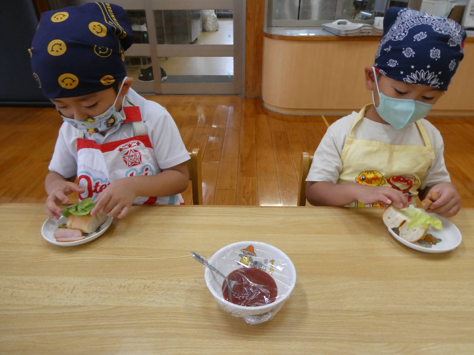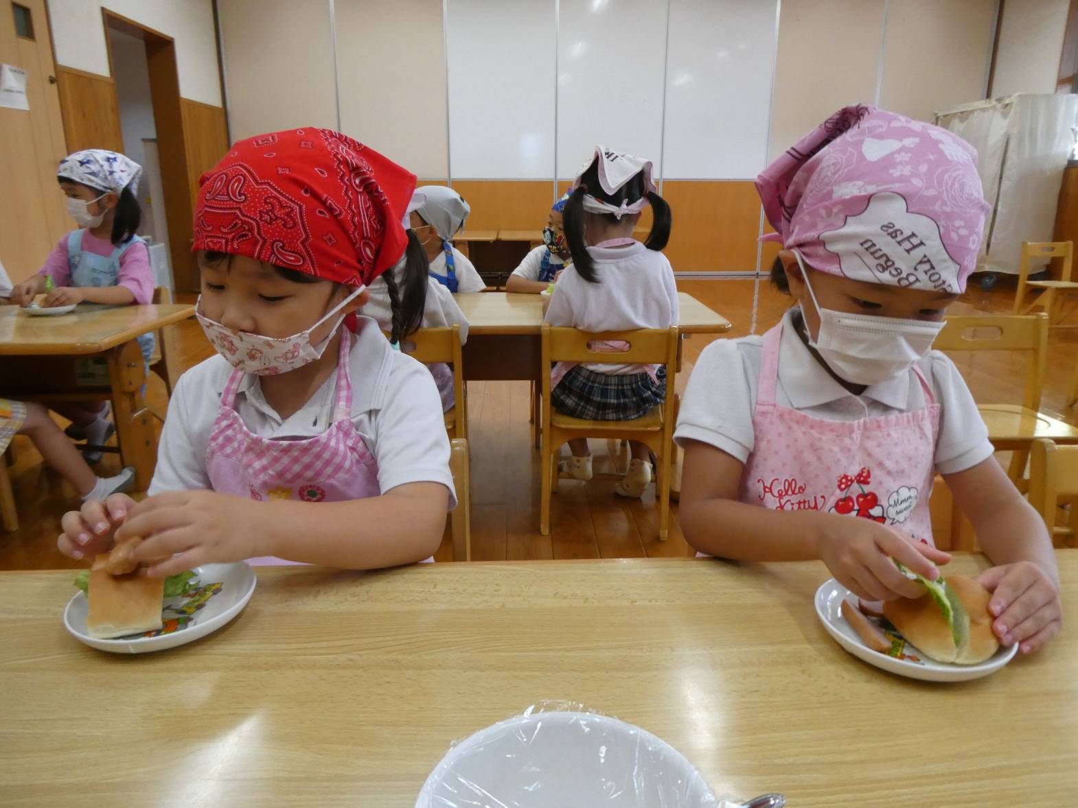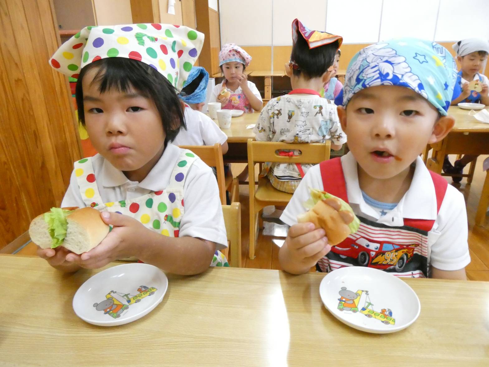 先日、クッキングがありました。 この日をとても楽しみにしていた子どもたち。 早速、ホットドッグの作り方を聞いていきます。 パンにレタスを挟み、その上にソーセージをのせていきます。 「レタス挟むの難しいね~。」と苦戦しながらも頑張っている子どもたち。 最後にケチャップをぬって完成です! 友だちのホットドッグを見て、「○○ちゃんの上手~!」とお互いに褒め合う様子が見られました。 自分たちで作ったホットドッグが美味しかったようで、あっという間に完食したうさぎ組さんです!