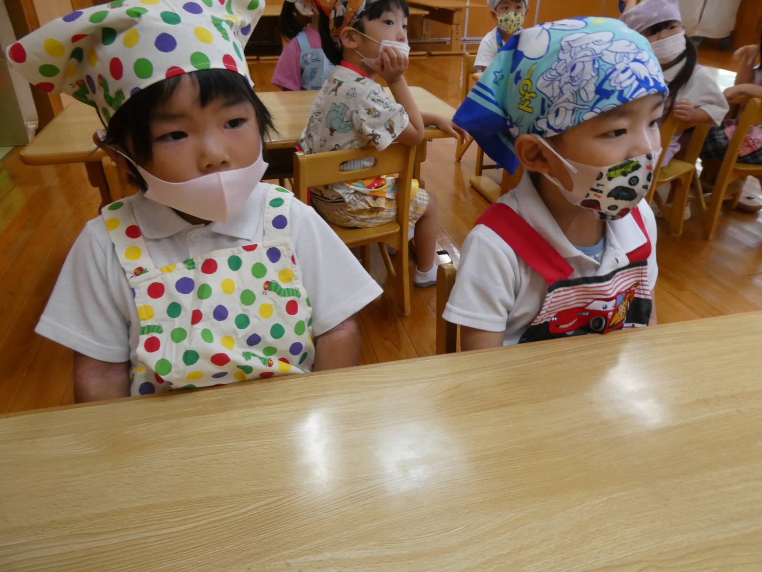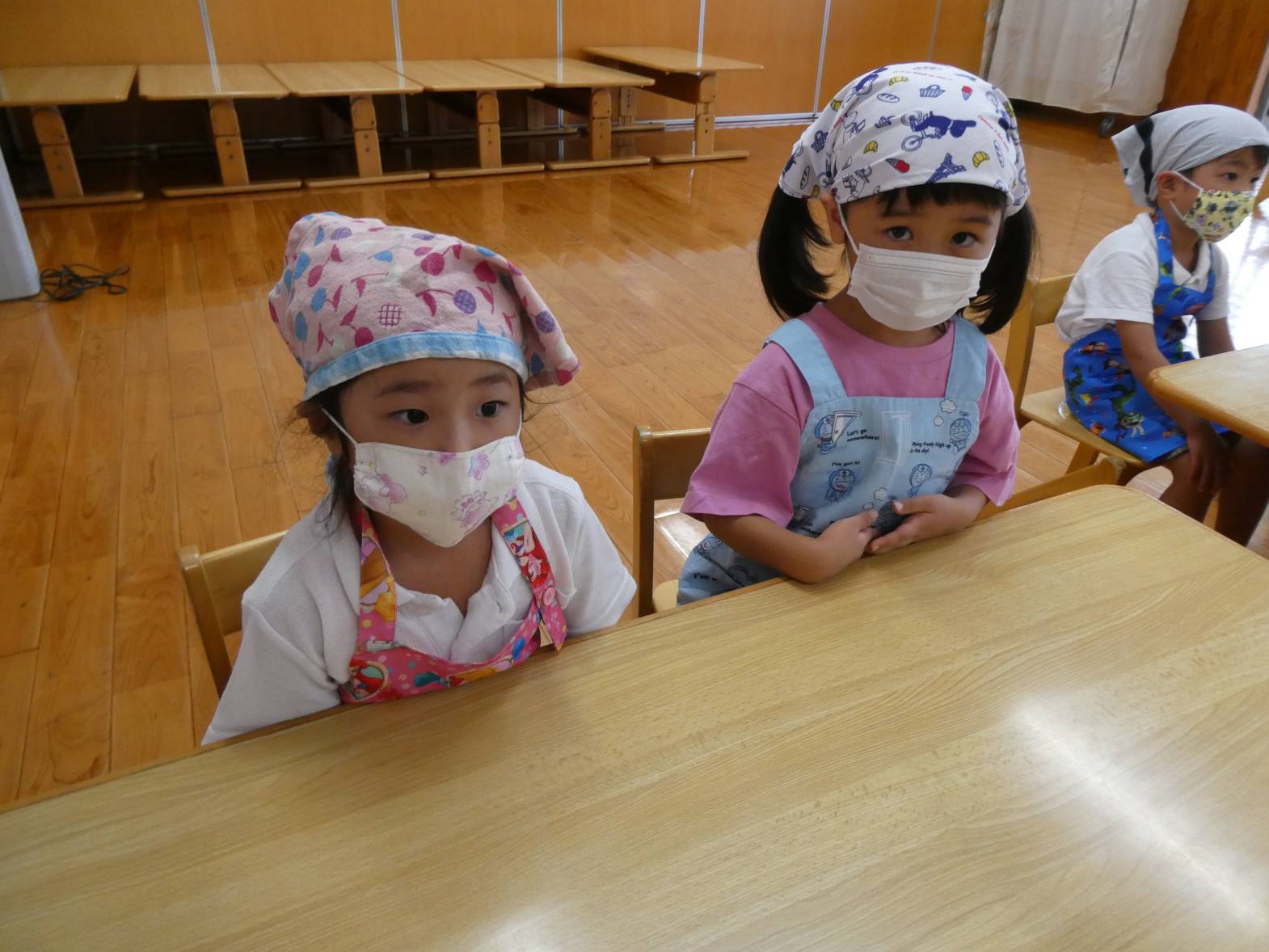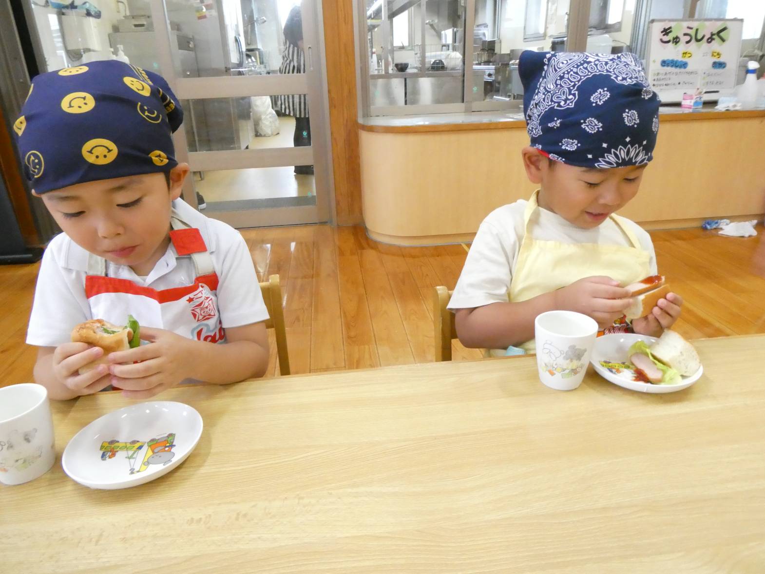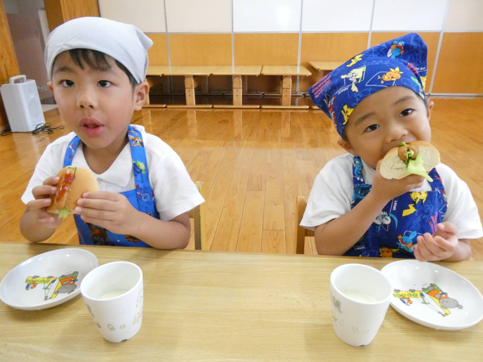 先日、クッキングがありました。 この日をとても楽しみにしていた子どもたち。 早速、ホットドッグの作り方を聞いていきます。 パンにレタスを挟み、その上にソーセージをのせていきます。 「レタス挟むの難しいね~。」と苦戦しながらも頑張っている子どもたち。 最後にケチャップをぬって完成です! 友だちのホットドッグを見て、「○○ちゃんの上手~!」とお互いに褒め合う様子が見られました。 自分たちで作ったホットドッグが美味しかったようで、あっという間に完食したうさぎ組さんです!