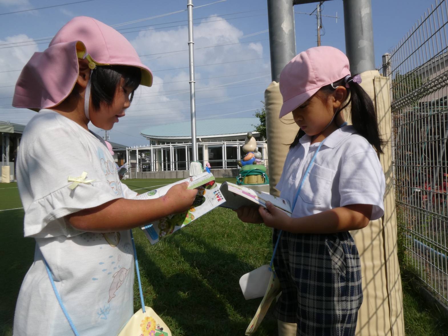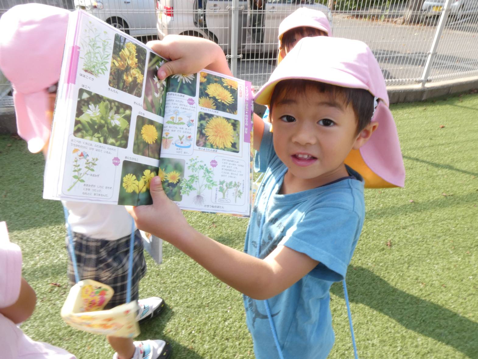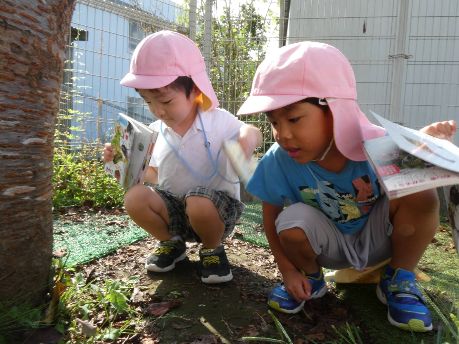 先日、子どもたちから「図鑑を外に持っていきたい!」と声が上がったため、図鑑を持って、外に出かけました。