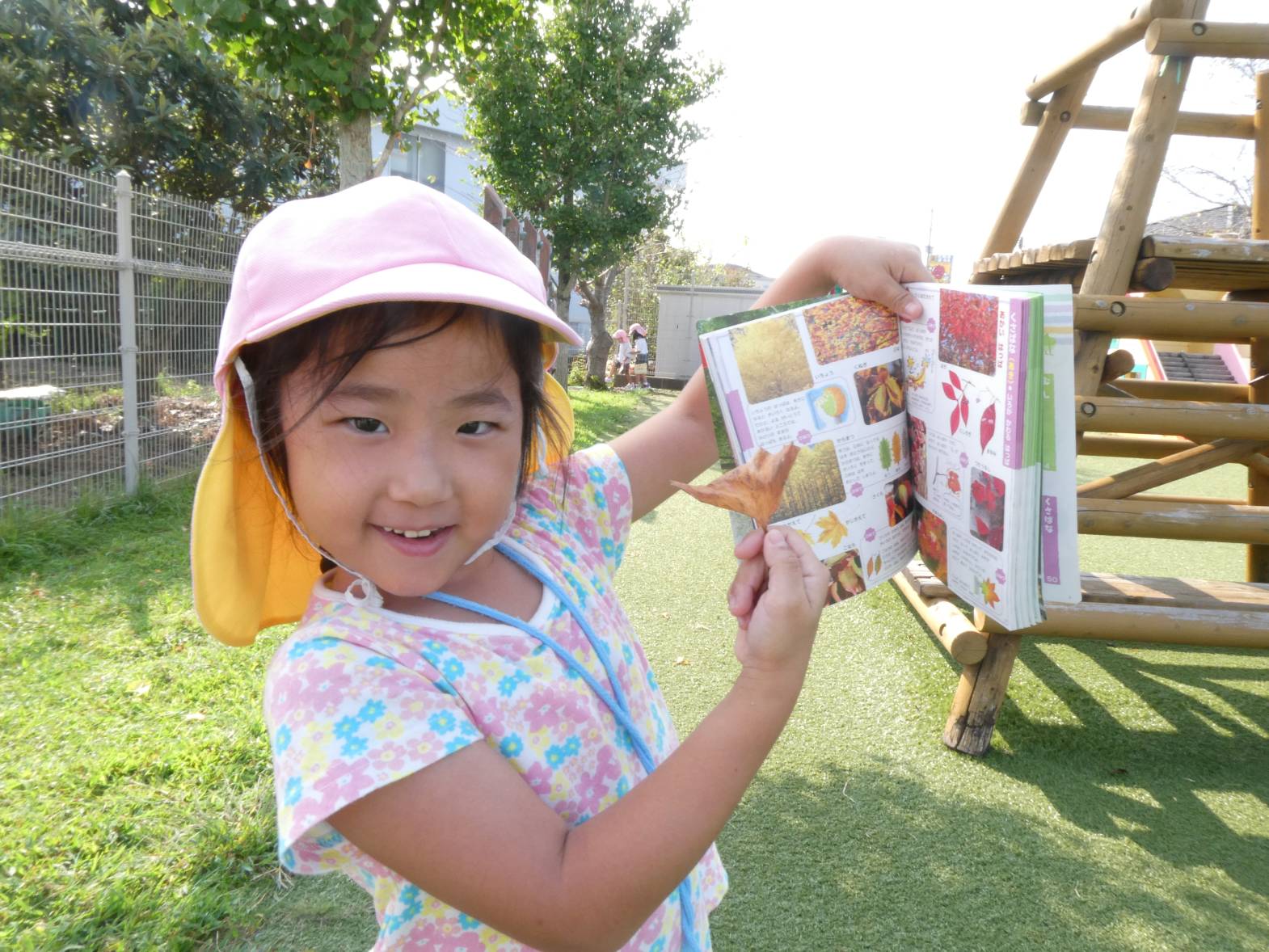 図鑑を取り出し、「拾った葉っぱは図鑑に載ってるかな?」とページをめくりながら一生懸命探す様子も見られました。