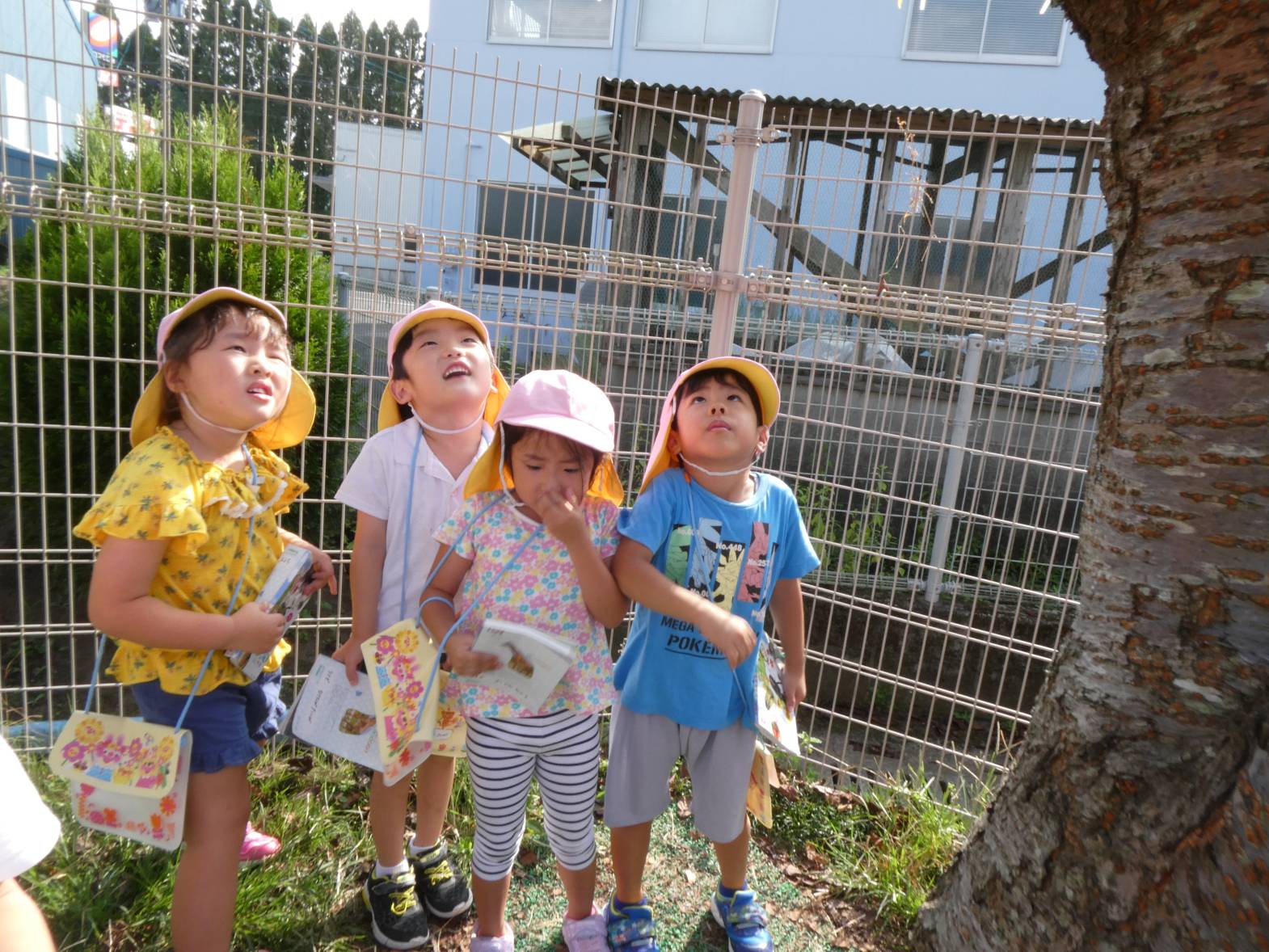 早速園庭へ行くと、「ダンゴムシはいるかな?」、「あっ、トンボが飛んでるよ!」等、わくわくした様子の子どもたち。