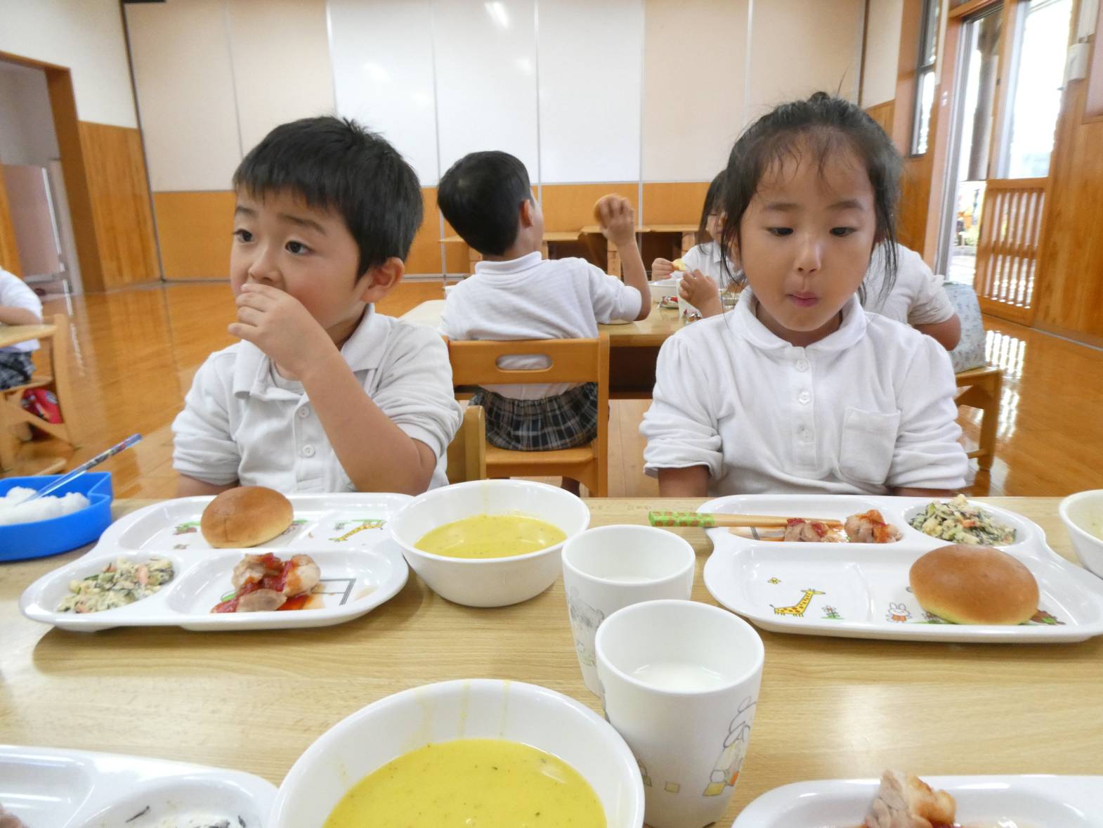 先日は、わくわくメニューでした。 給食が配膳されると、「美味しそう!」、「たくさん好きな食べ物がある~。」と、嬉しそうな様子。 「僕は、パンが大好きなんだ~!」、「私は、カボチャスープが美味しい。」と、好きな物や美味しい物を教えてくれる子どもたち。 大きな口で頬張り、あっという間に食べ終わったうさぎ組さんでした!