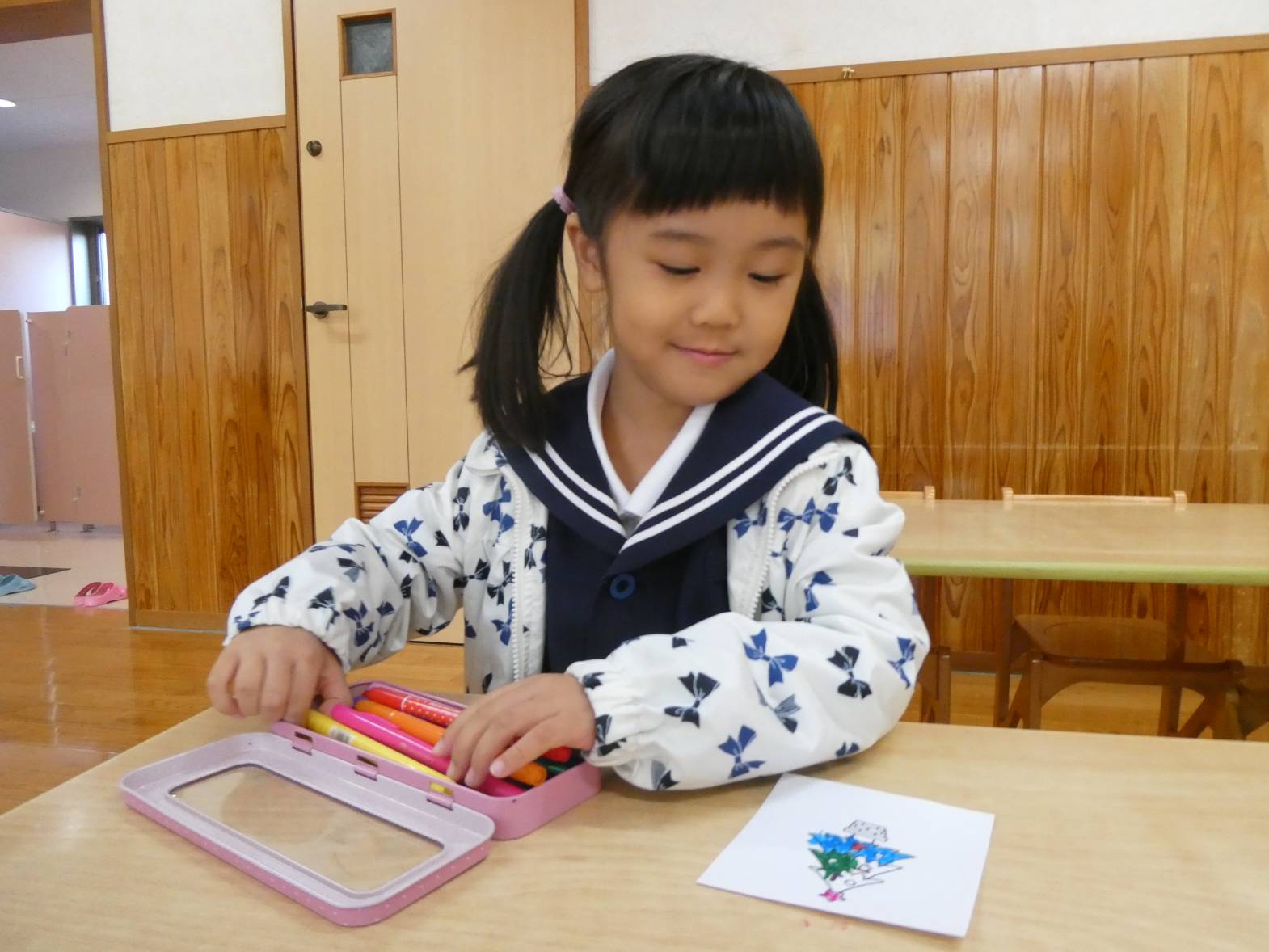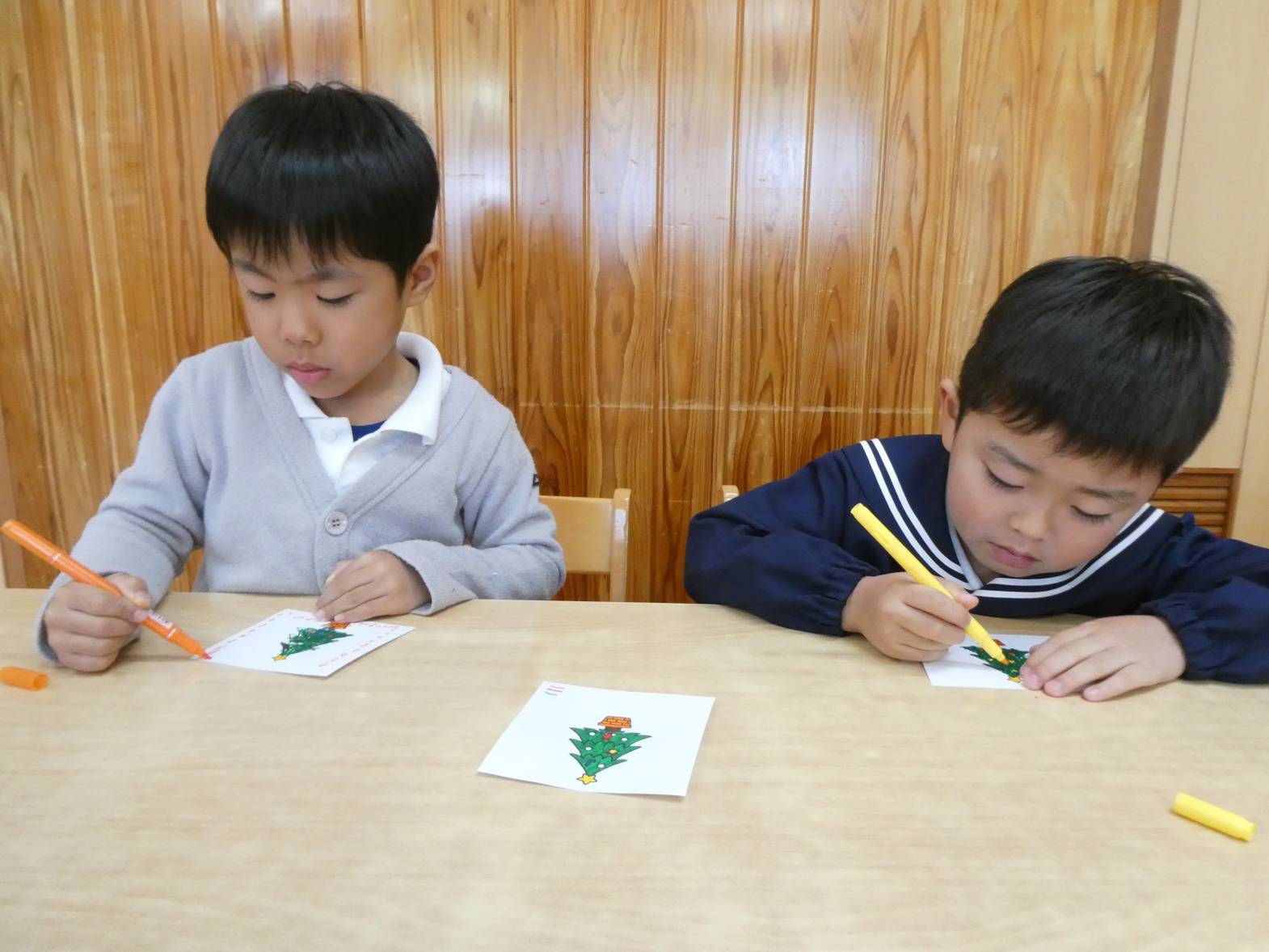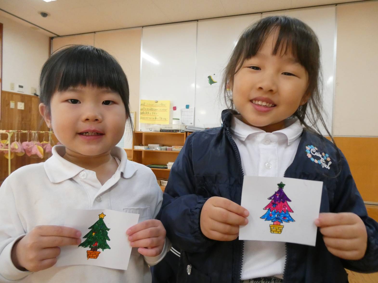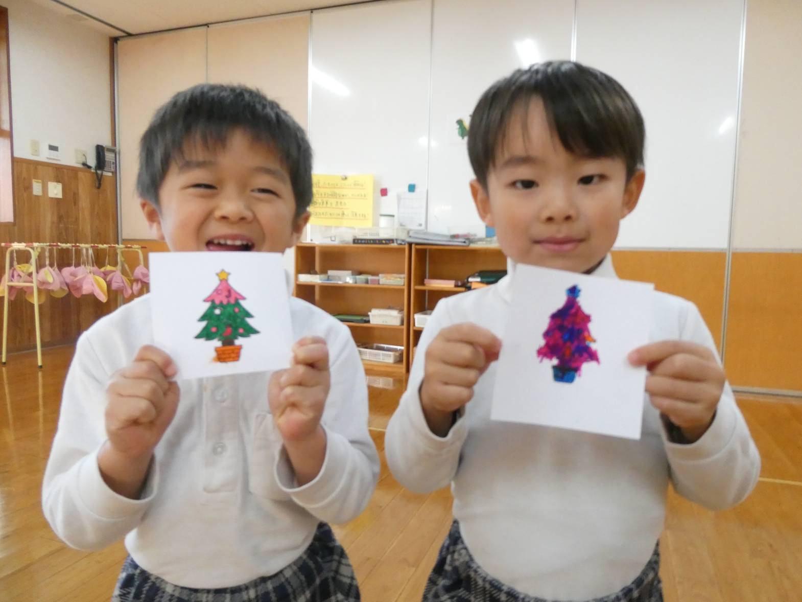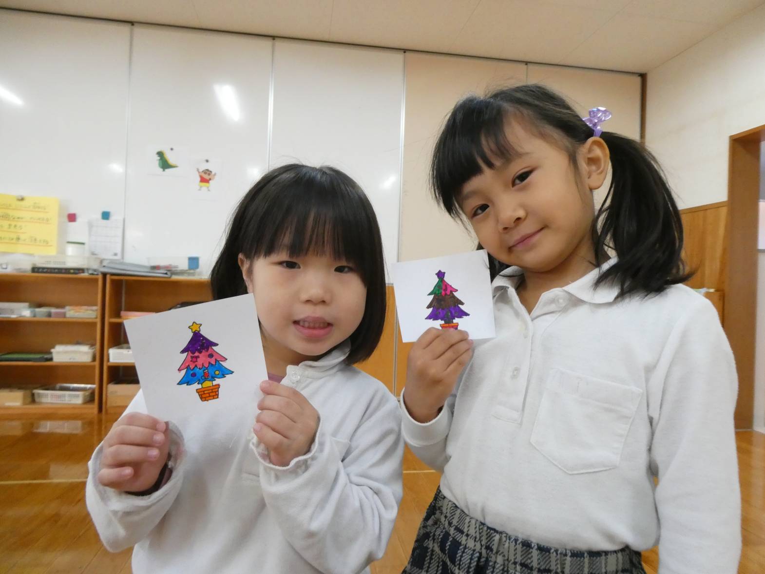 クリスマス製作をしました。 ツリーの絵を好きな色で塗っていく子どもたち。 「私は、カラフルにしよう!」と張り切っています。 線からはみ出さずにきれいに塗ることができてきました。 塗り終わると、一人ひとり違ったツリーが完成して嬉しそうなうさぎ組さんです!