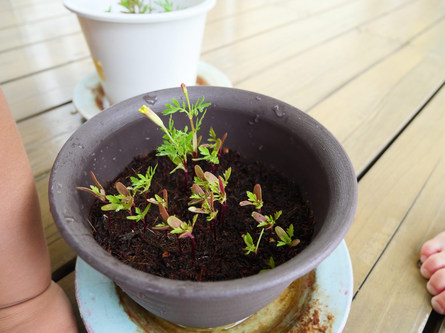 4月に「あお」「むらさき」「しろ」「くろ」チームに分かれて、マリーゴールドの種を植えたうさぎ組さん。毎日たくさん話し掛けながら、水をあげてきました。