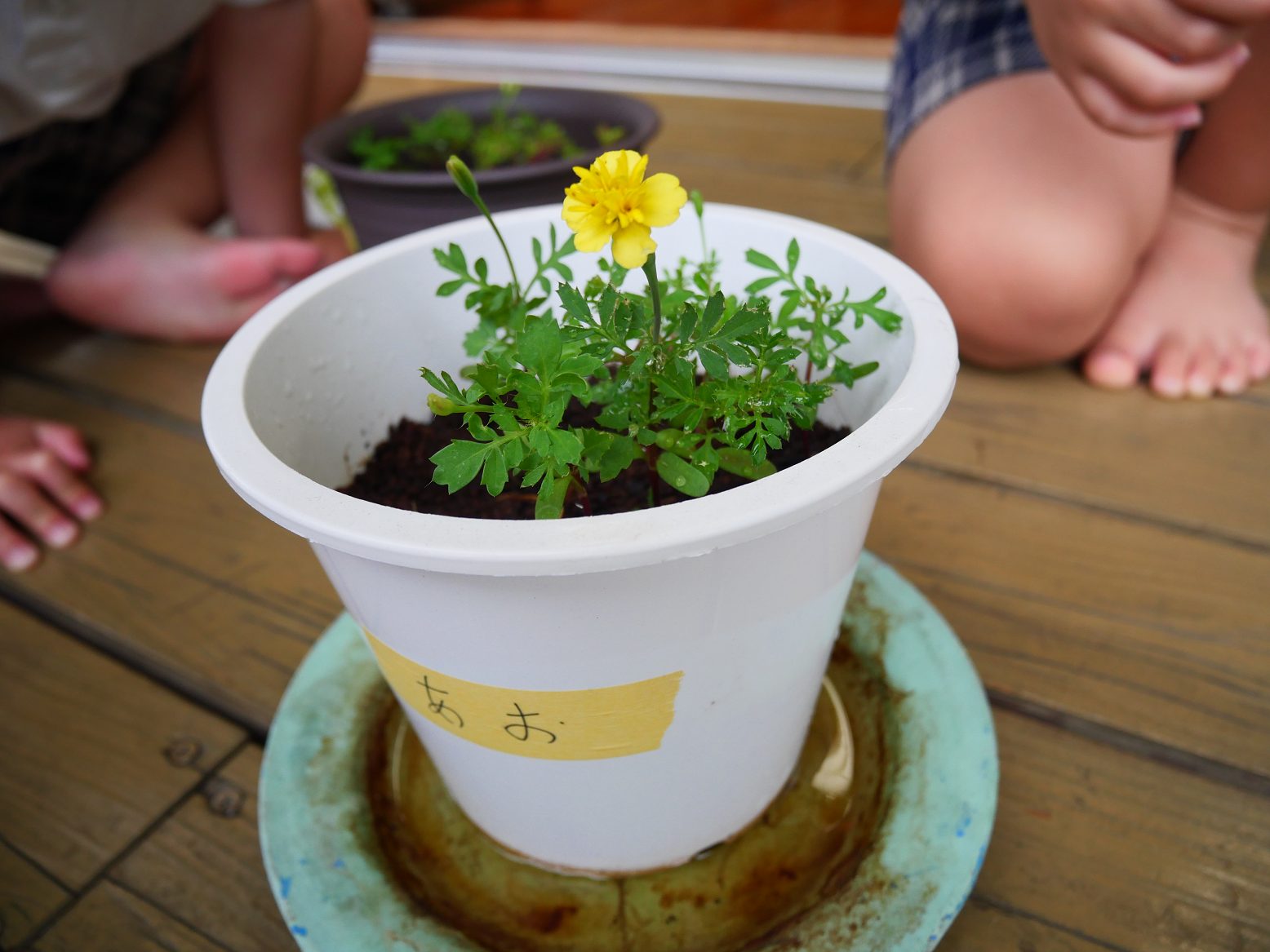 「芽が出たよ!」「葉っぱが大きくなったよ!」と毎日いろいろな発見をしていた子どもたちでしたが、今週とうとうかわいい黄色の花が咲きました。