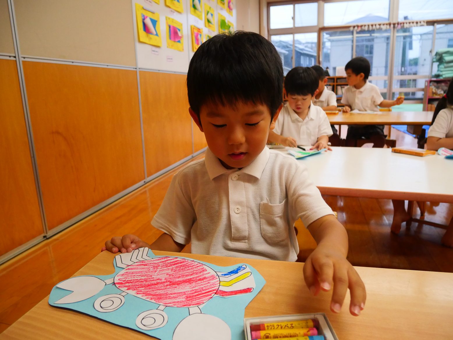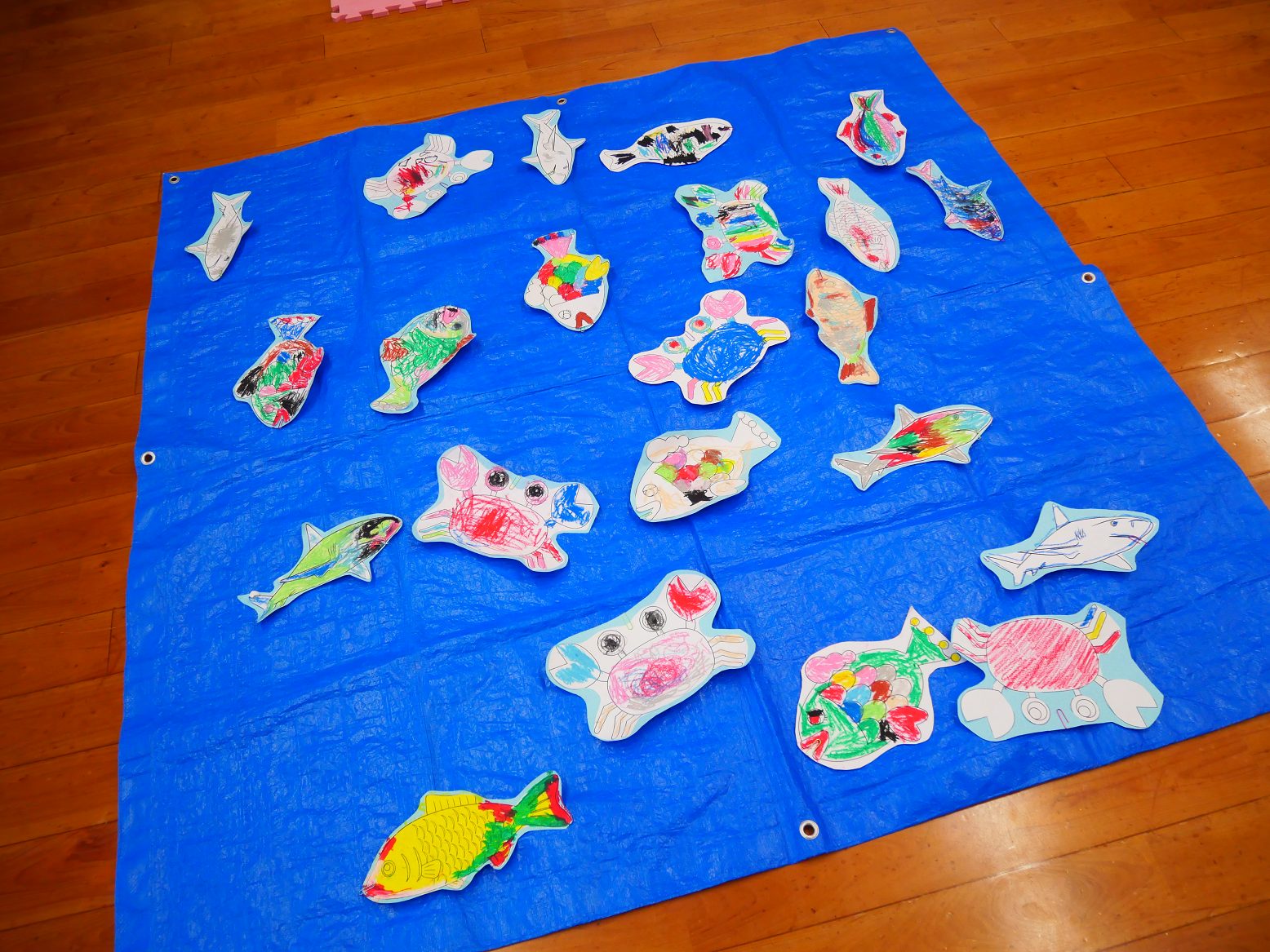 魚やサメ、カニに好きな色を塗ったら、うさぎ組さんの部屋の海に放していきます。