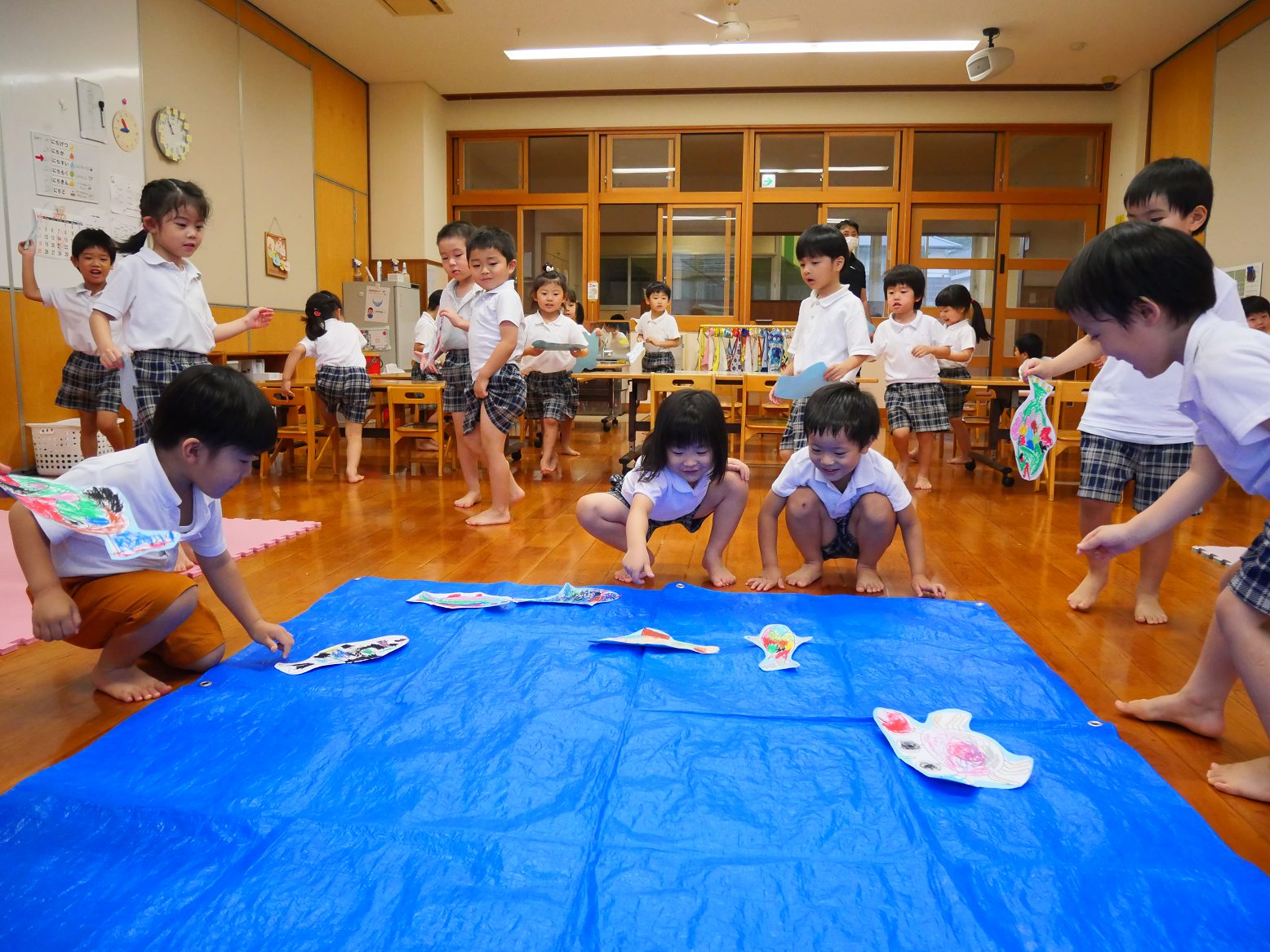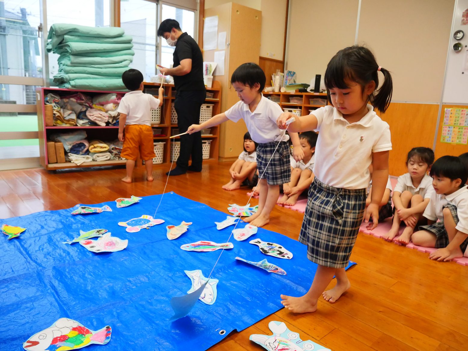 魚が海からいなくなったら何匹連れたかを発表します。最近発表がとても上達したうさぎ組の子どもたち。「ぼくは(わたしは)〇匹釣りました!」と元気よく発表したくさんの拍手をもらいました。