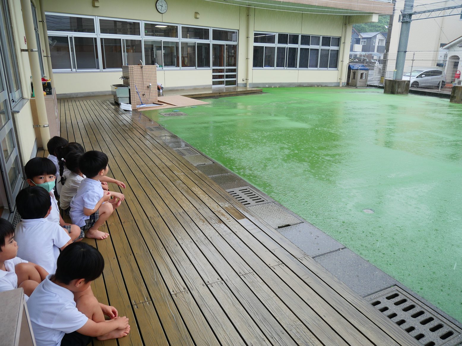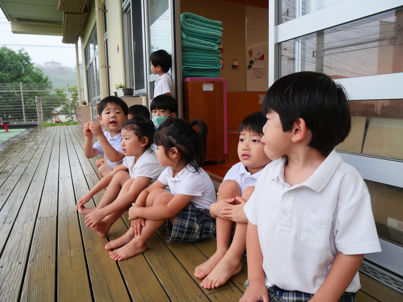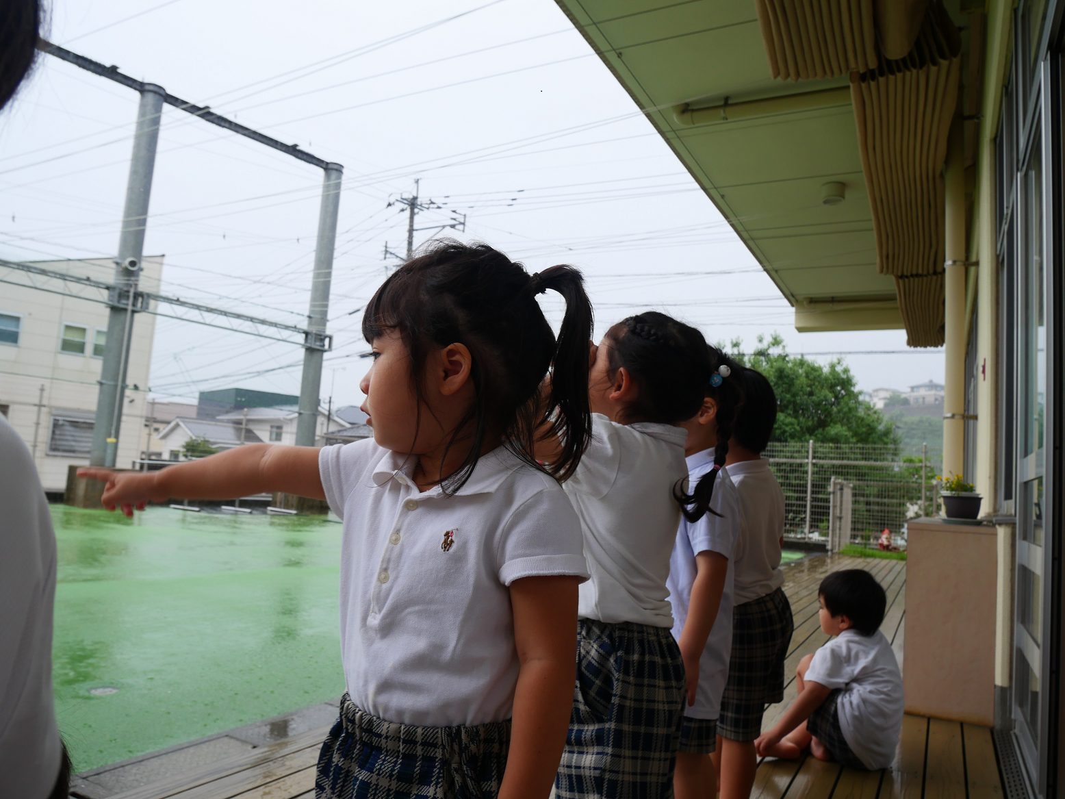 毎日雨続きでなかなか外で遊ぶことができません。「雨やまないかなぁ…」とテラスから園庭を眺める子どもたち。しかし雨は見てみると面白いことに気付いたうさぎ組さん。「あそこに水たまりできてるね!」「すごい音だね!」とさっきまでの不安は嘘のように雨に見入っていました。