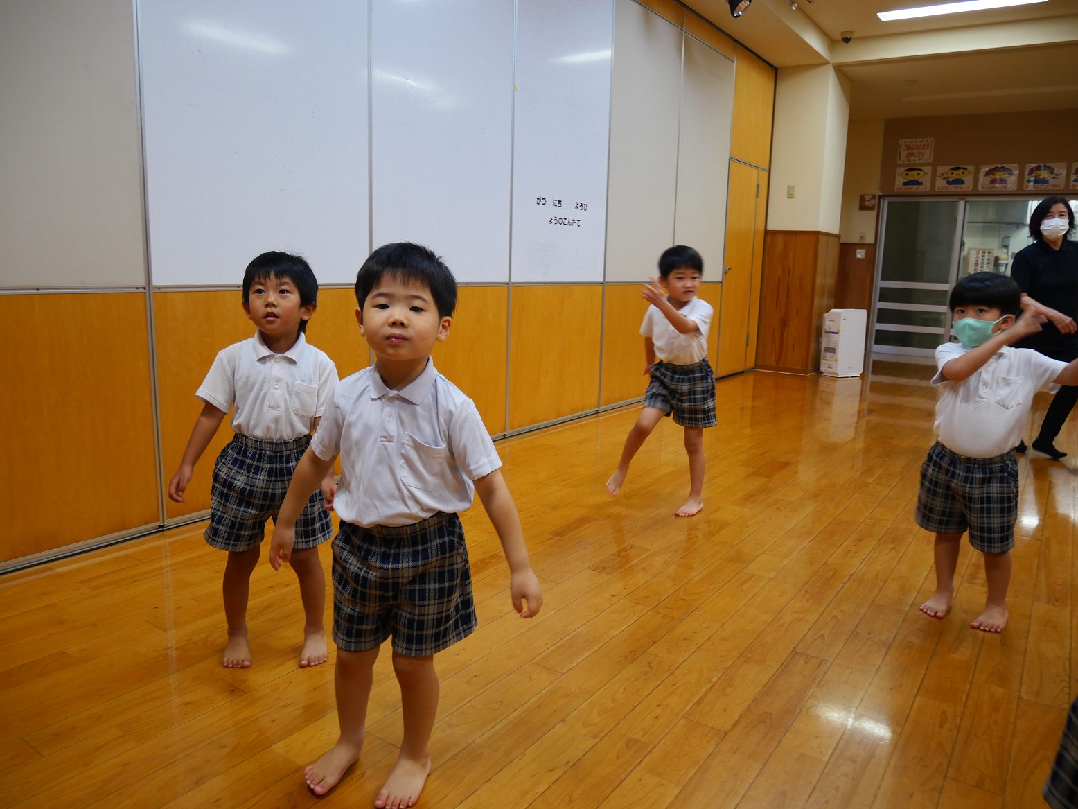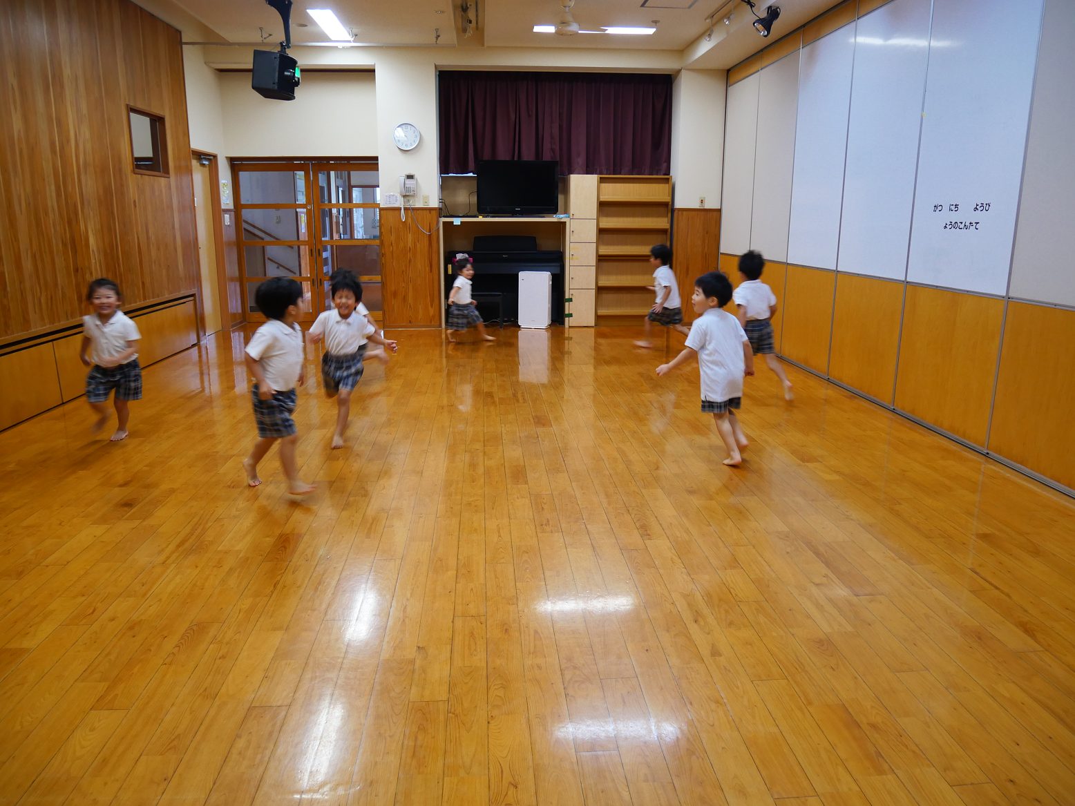 外遊びができないのならと、広いプレイルームで体をたくさん動かすことにしました。大好きな体操や鬼ごっこ、室内ならではのゲームに大興奮の子どもたち。