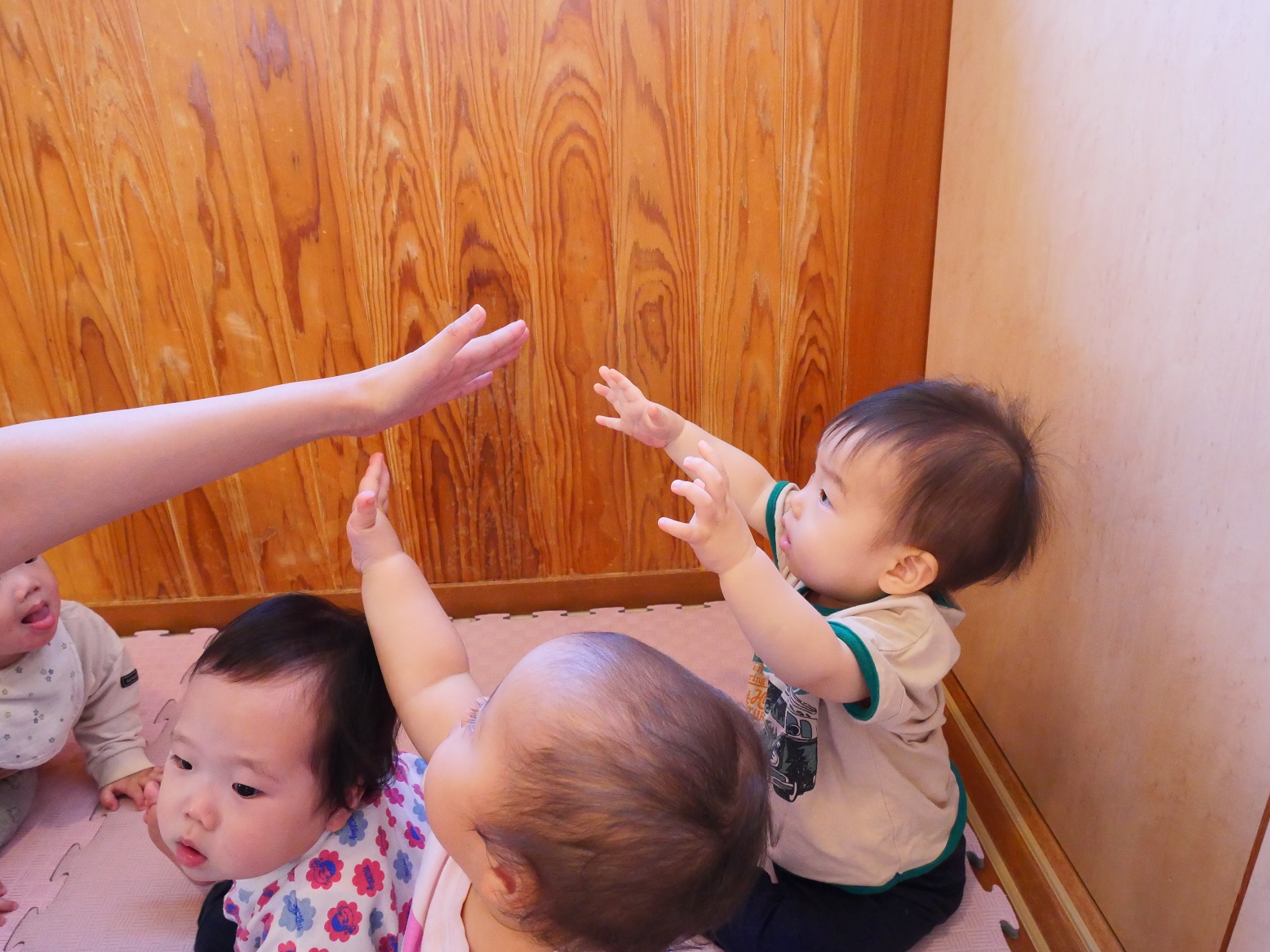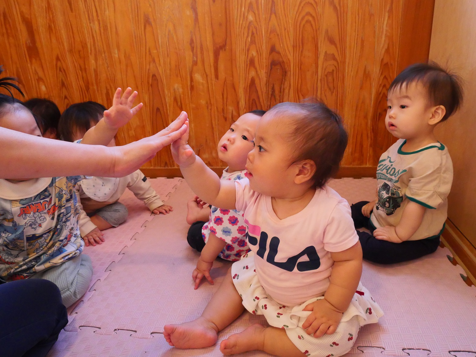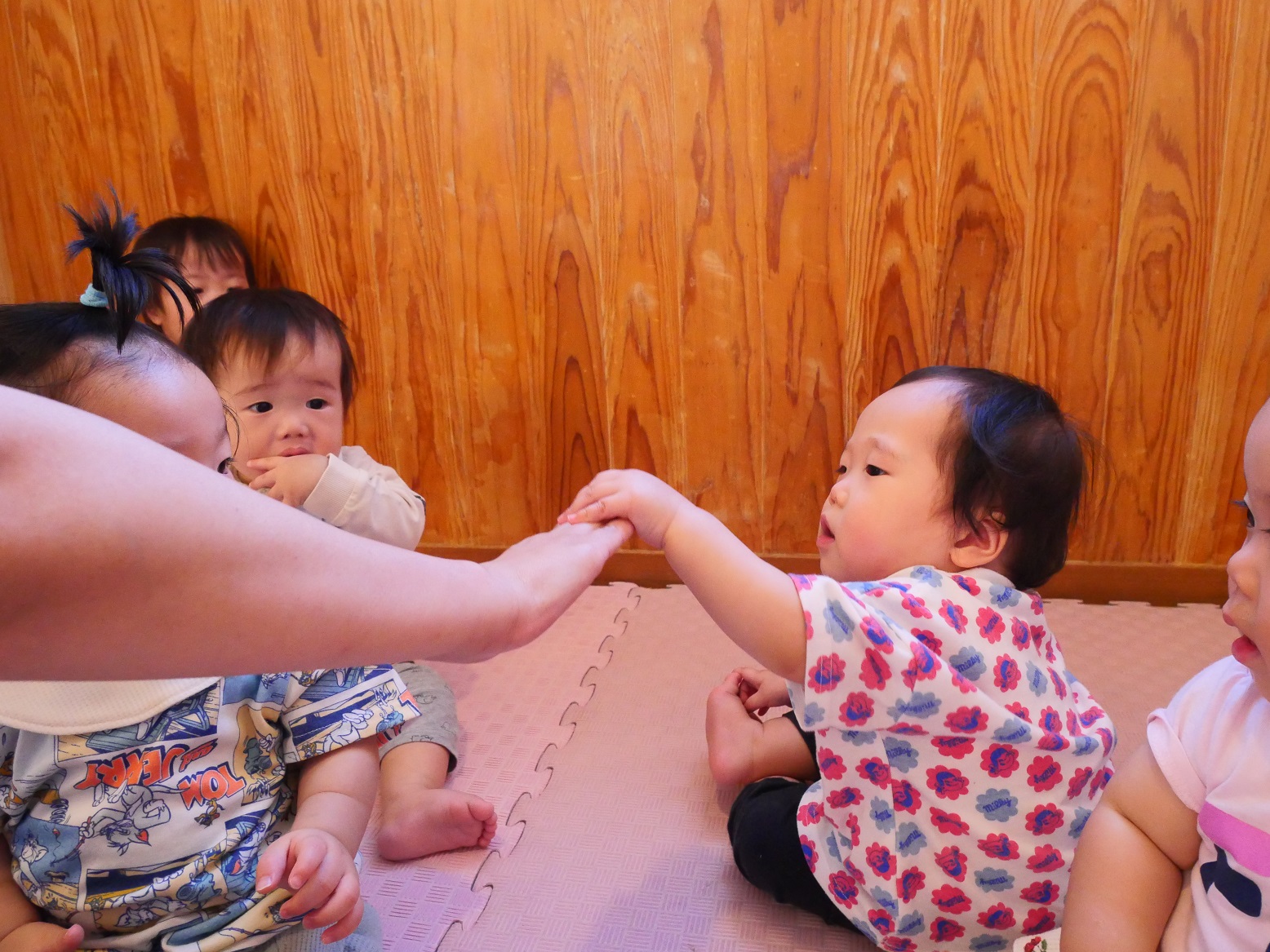 ひよこ組さんの1日は朝の集まりからスタートです。 「コロコロたまごは~・・・」と指遊びや歌が始まると、集まりの場所に向かっていく子どもたち。 指遊びや歌に取り組んだり、絵本に見たりと目をキラキラ輝かせる姿が見られています。 名前を呼ばれると、上手に返事もできるようになり、保育者とタッチをすることもできるようになっています! みんなで楽しく集まりに参加するひよこ組さんです。