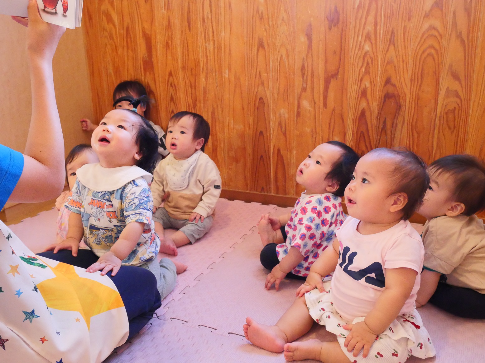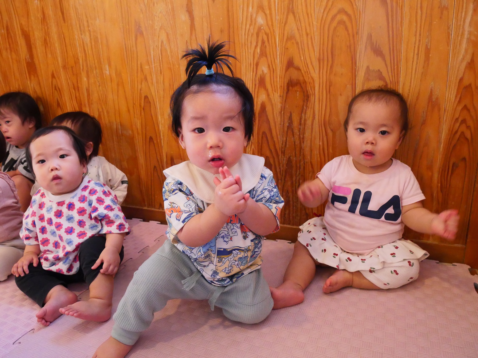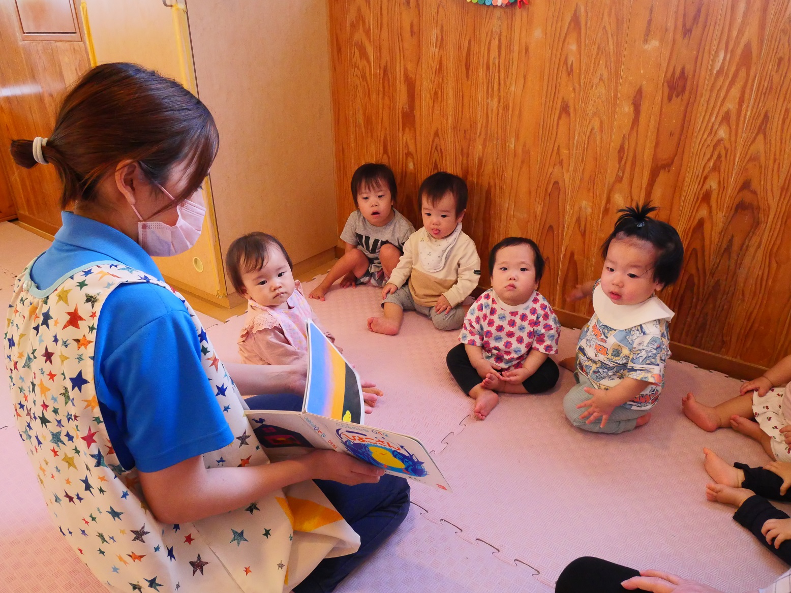 ひよこ組さんの1日は朝の集まりからスタートです。 「コロコロたまごは~・・・」と指遊びや歌が始まると、集まりの場所に向かっていく子どもたち。 指遊びや歌に取り組んだり、絵本に見たりと目をキラキラ輝かせる姿が見られています。 名前を呼ばれると、上手に返事もできるようになり、保育者とタッチをすることもできるようになっています! みんなで楽しく集まりに参加するひよこ組さんです。