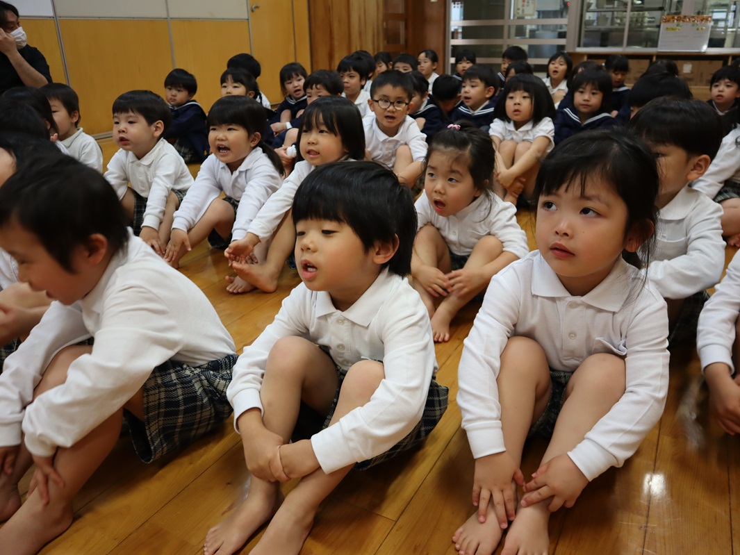 お話が始まると、約束をしっかり守って体操座りで聞く子どもたち!